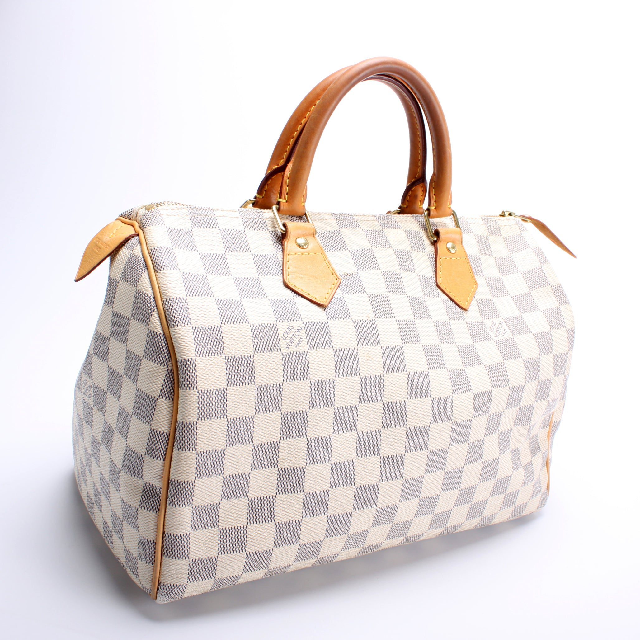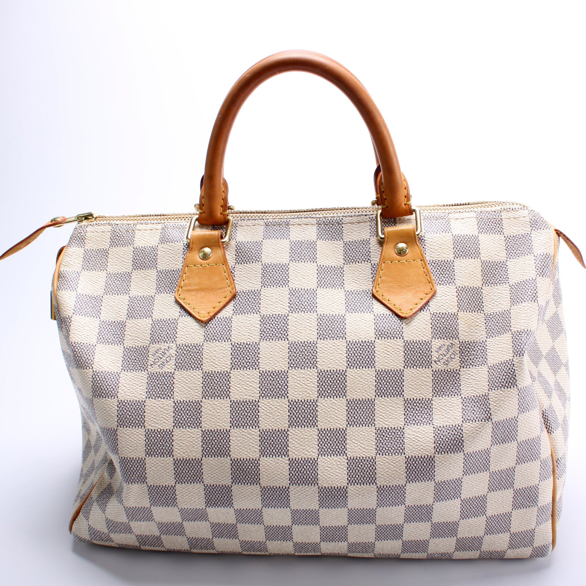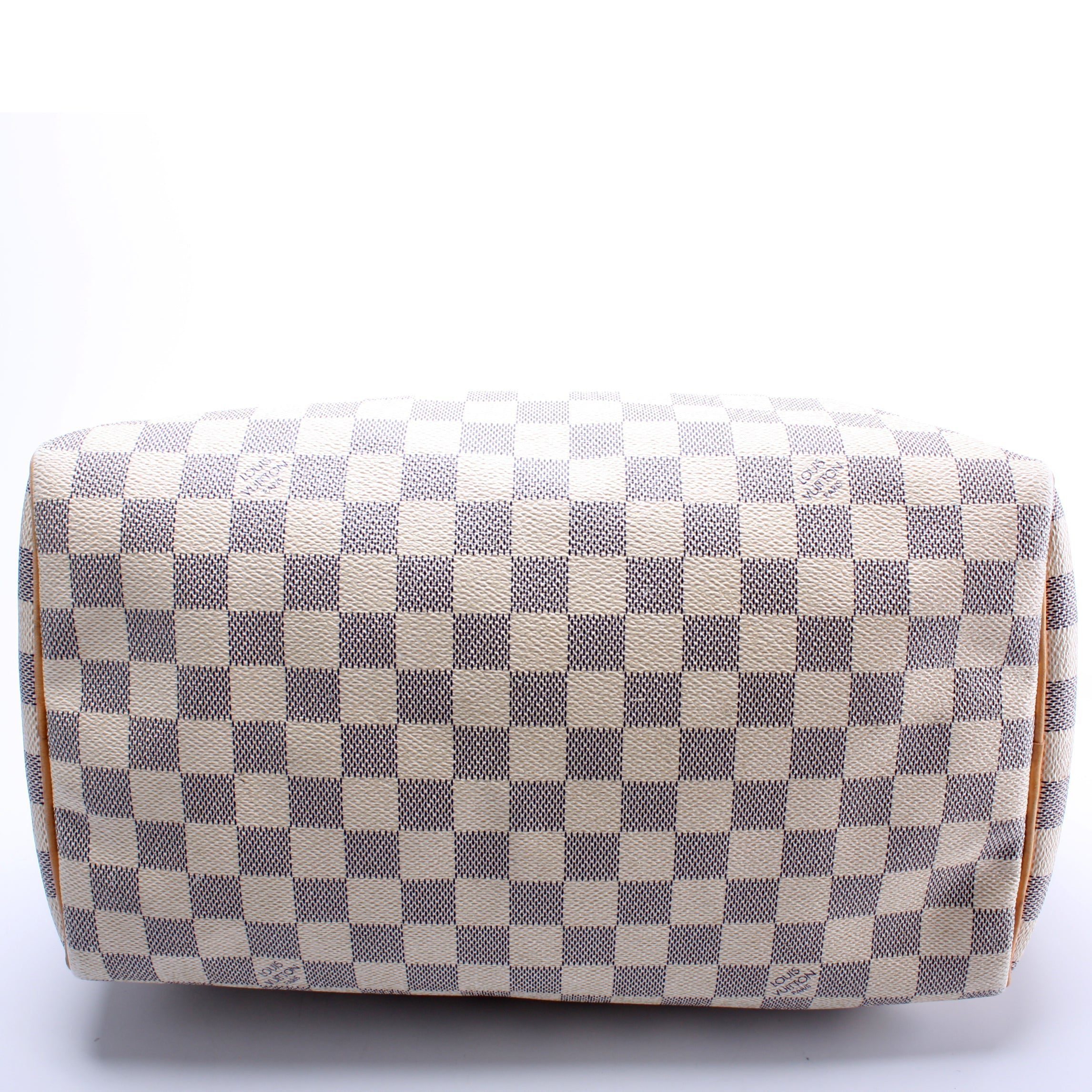 Louis Vuitton Speedy 30. The exterior is in the classic Damier Azur coated canvas. Â