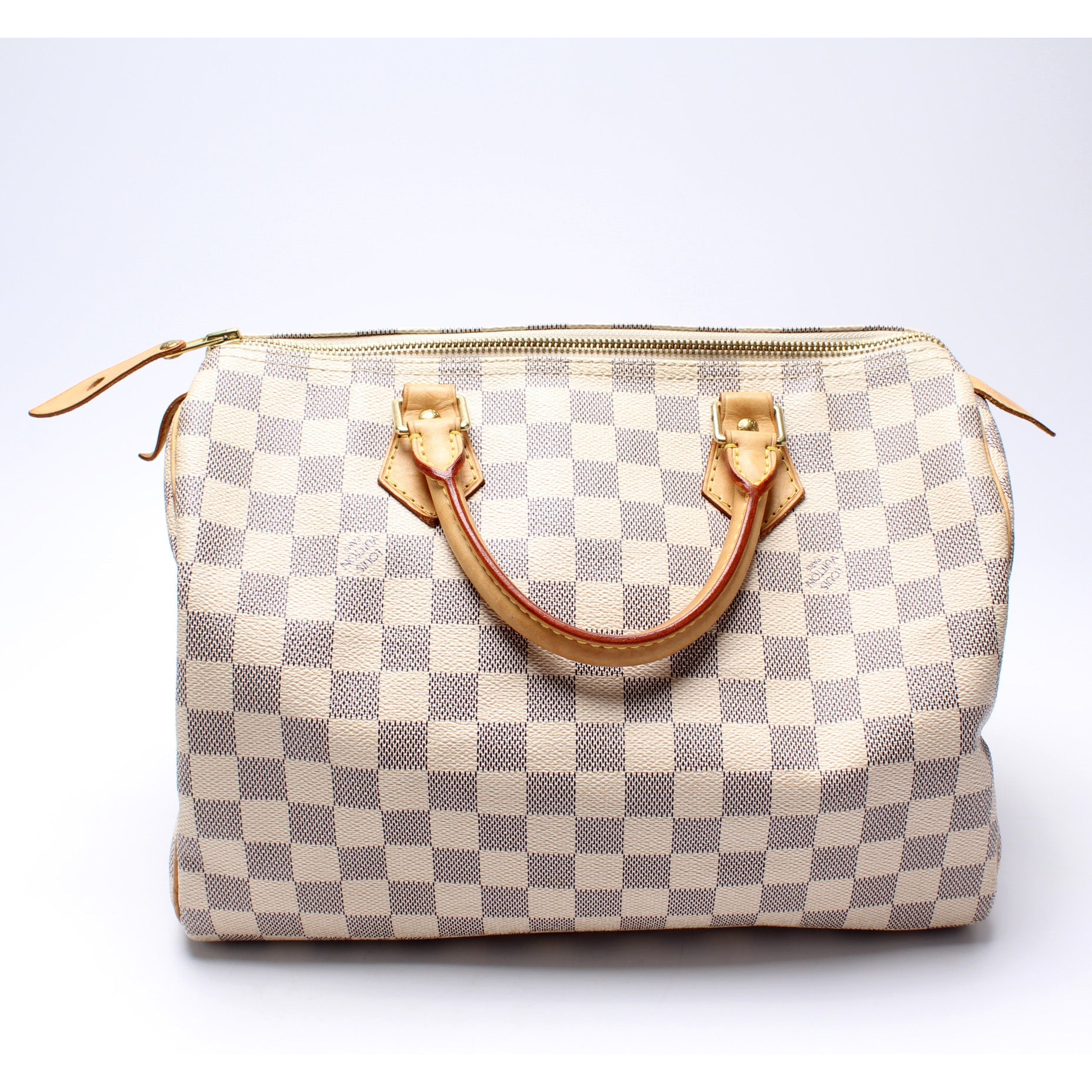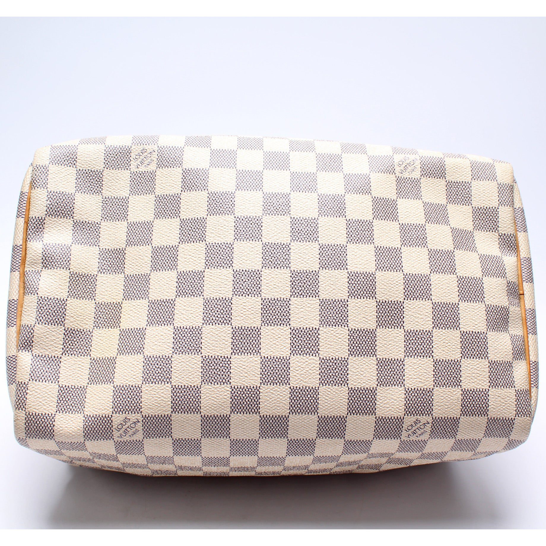 Louis Vuitton Speedy 30. The exterior is in the classic Louis Vuitton Damier Azur coated canvas.Â