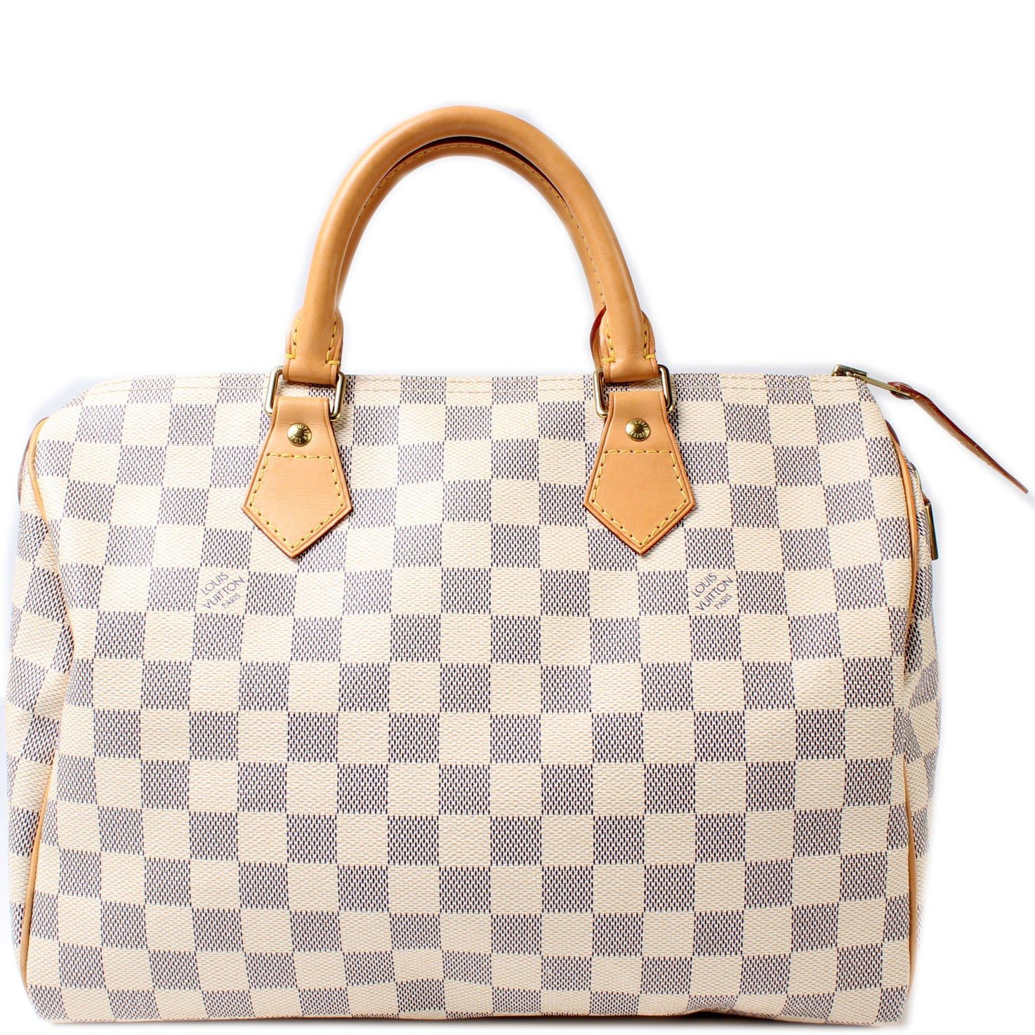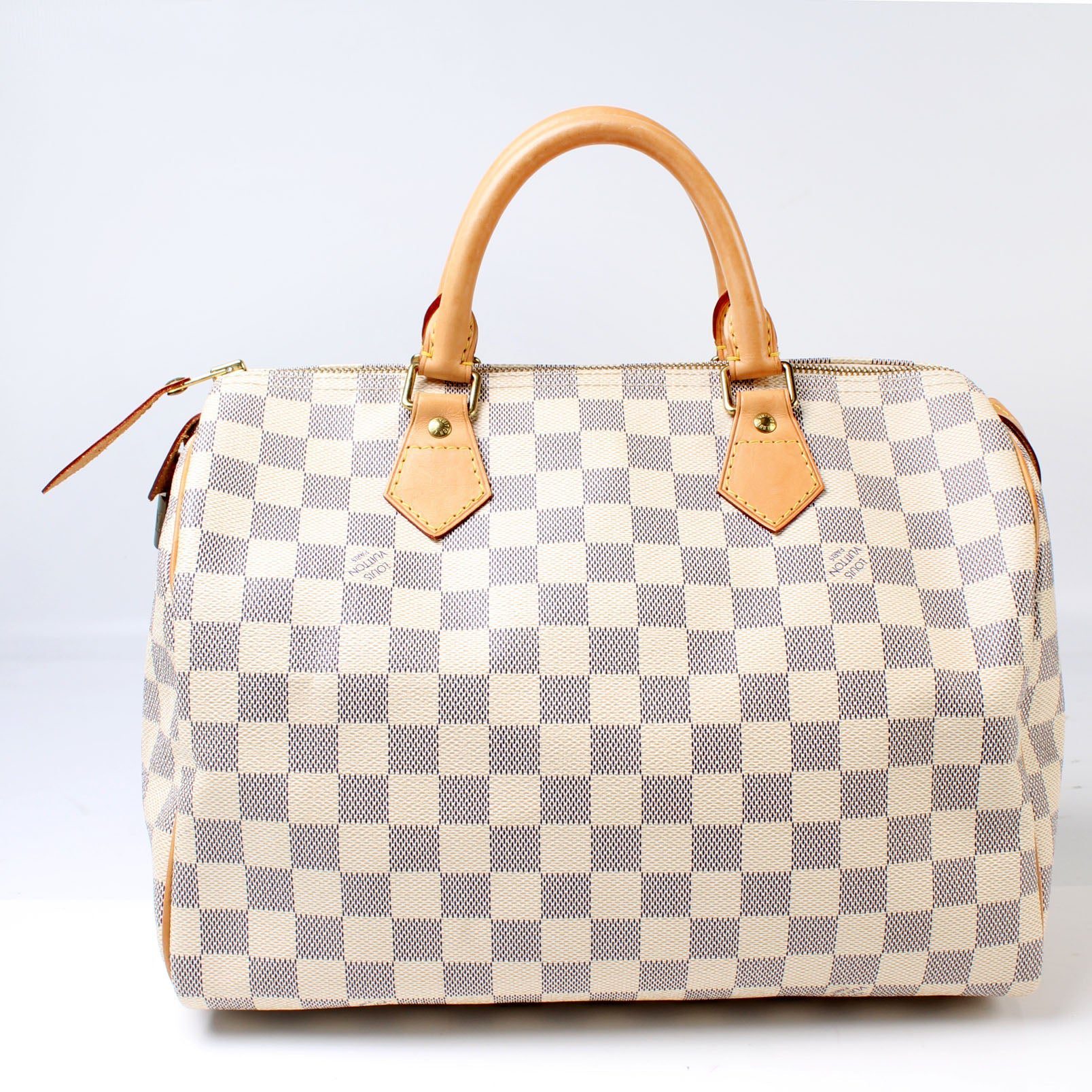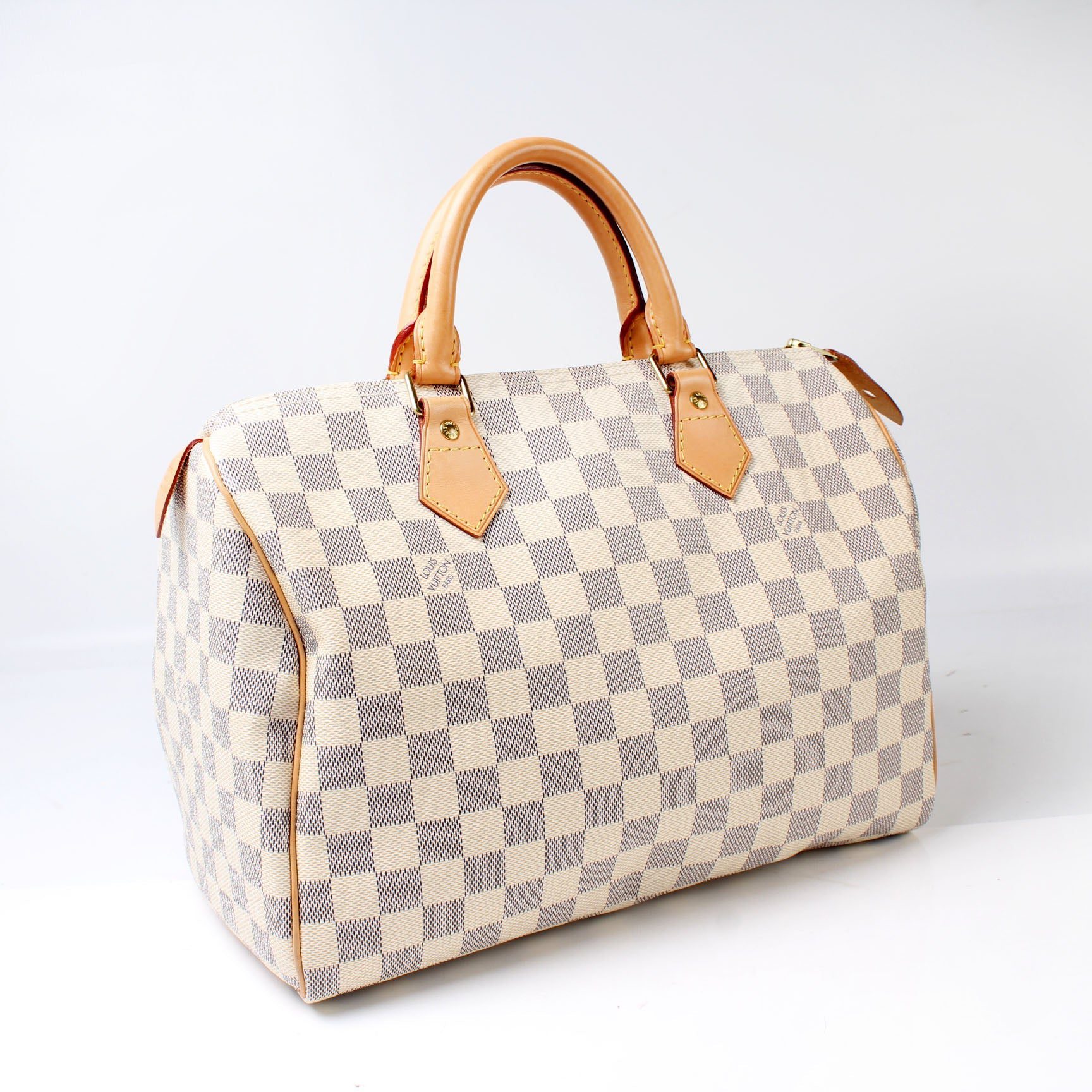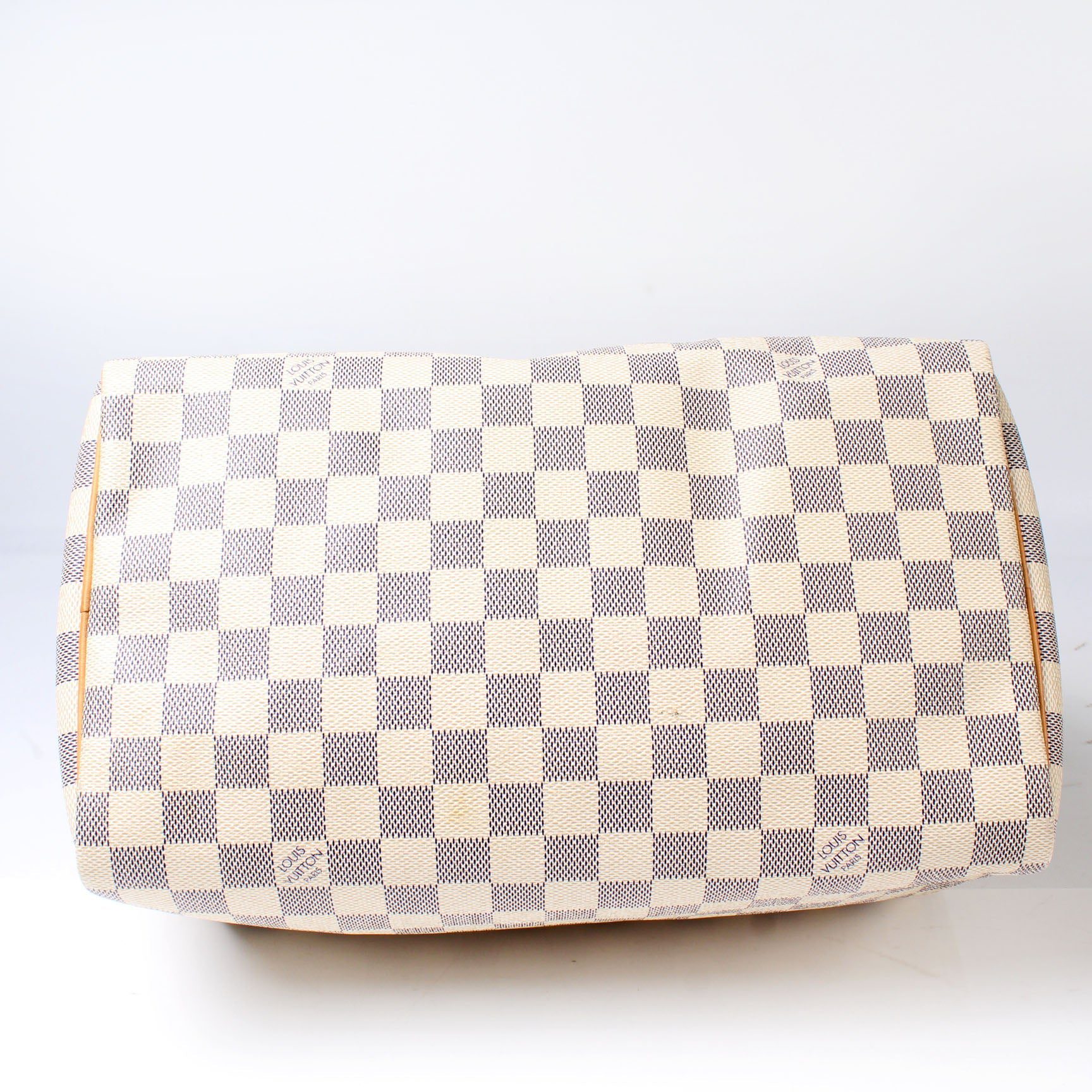 Louis Vuitton Speedy 30. The exterior is in the classic Damier Azur coated canvas. Â