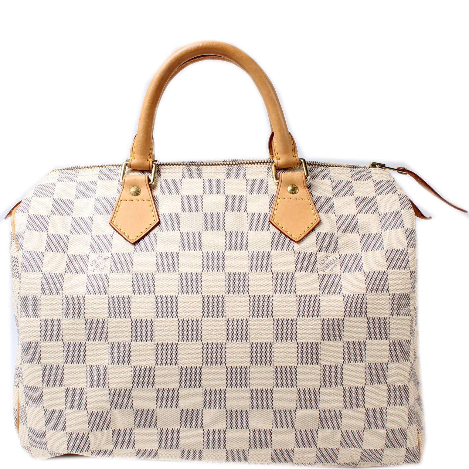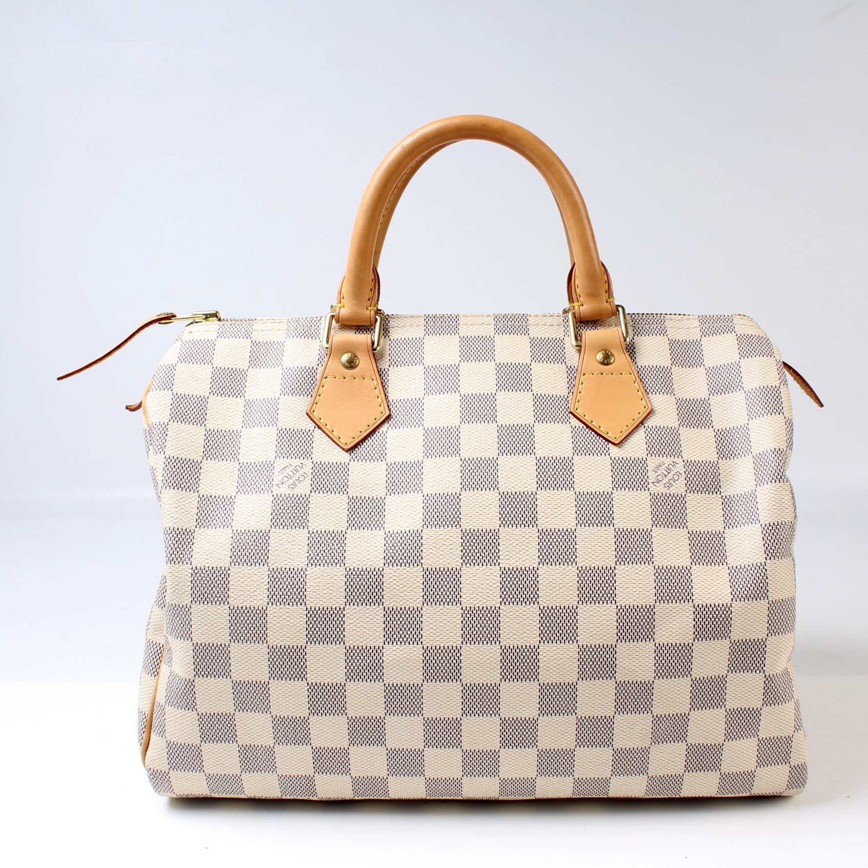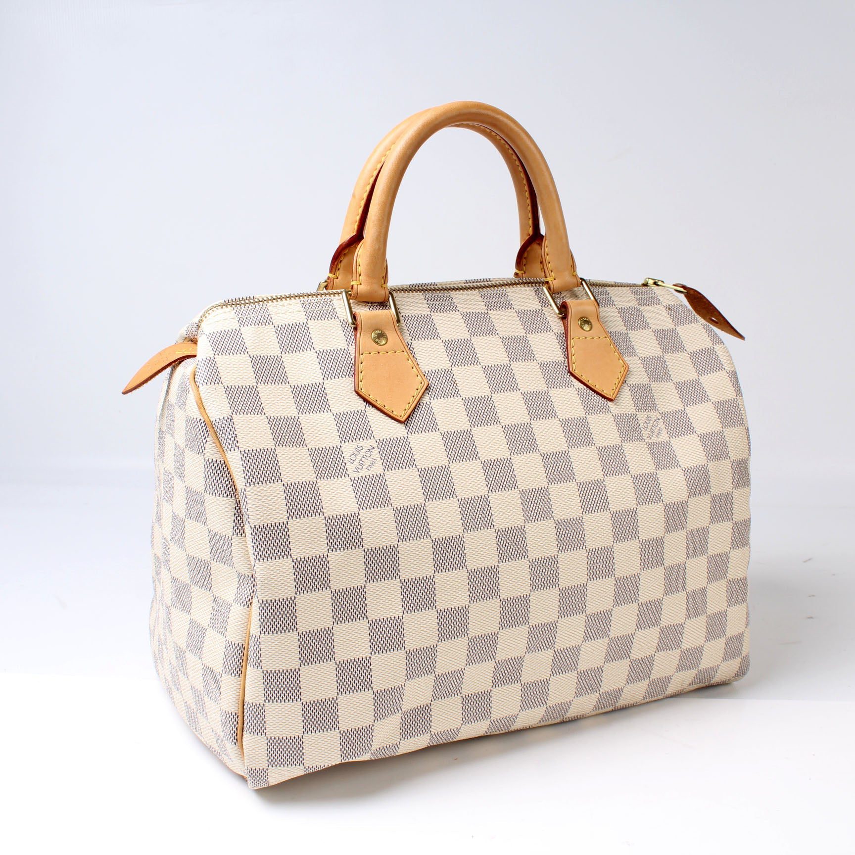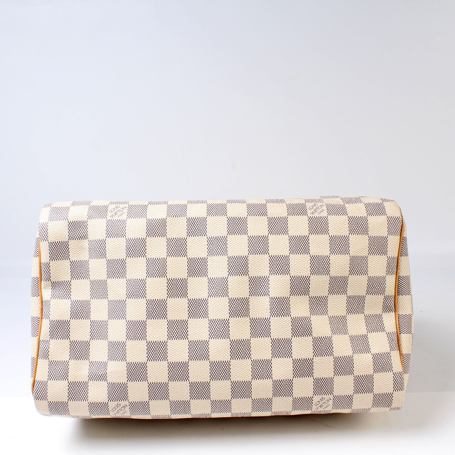 Louis Vuitton Speedy 30. The exterior is in the classic Louis Vuitton Damier Azur coated canvas.Â