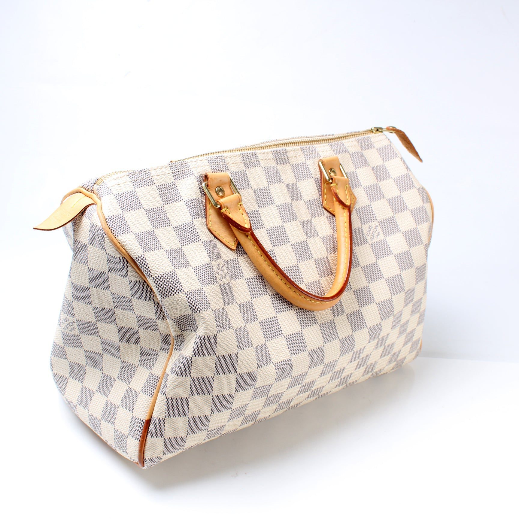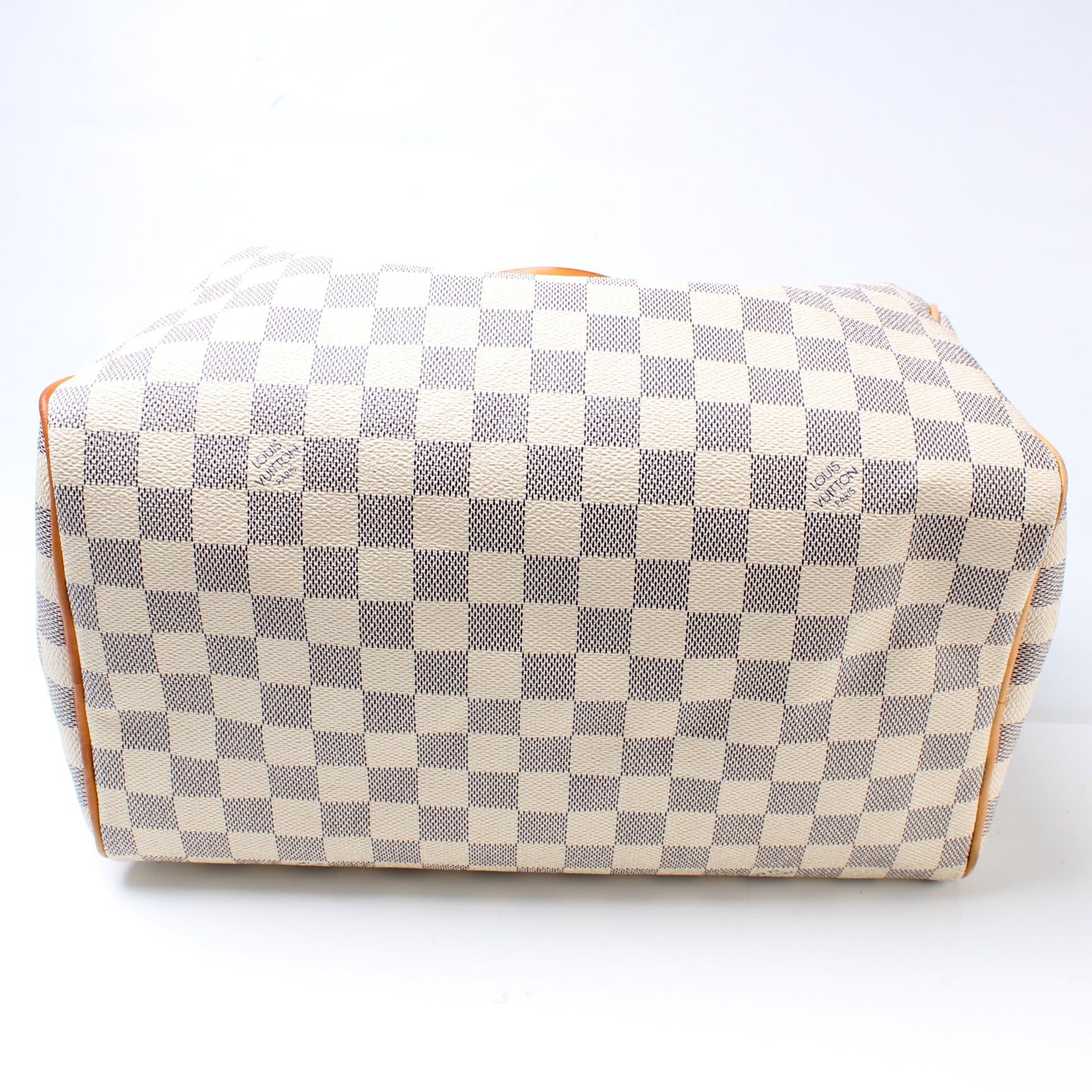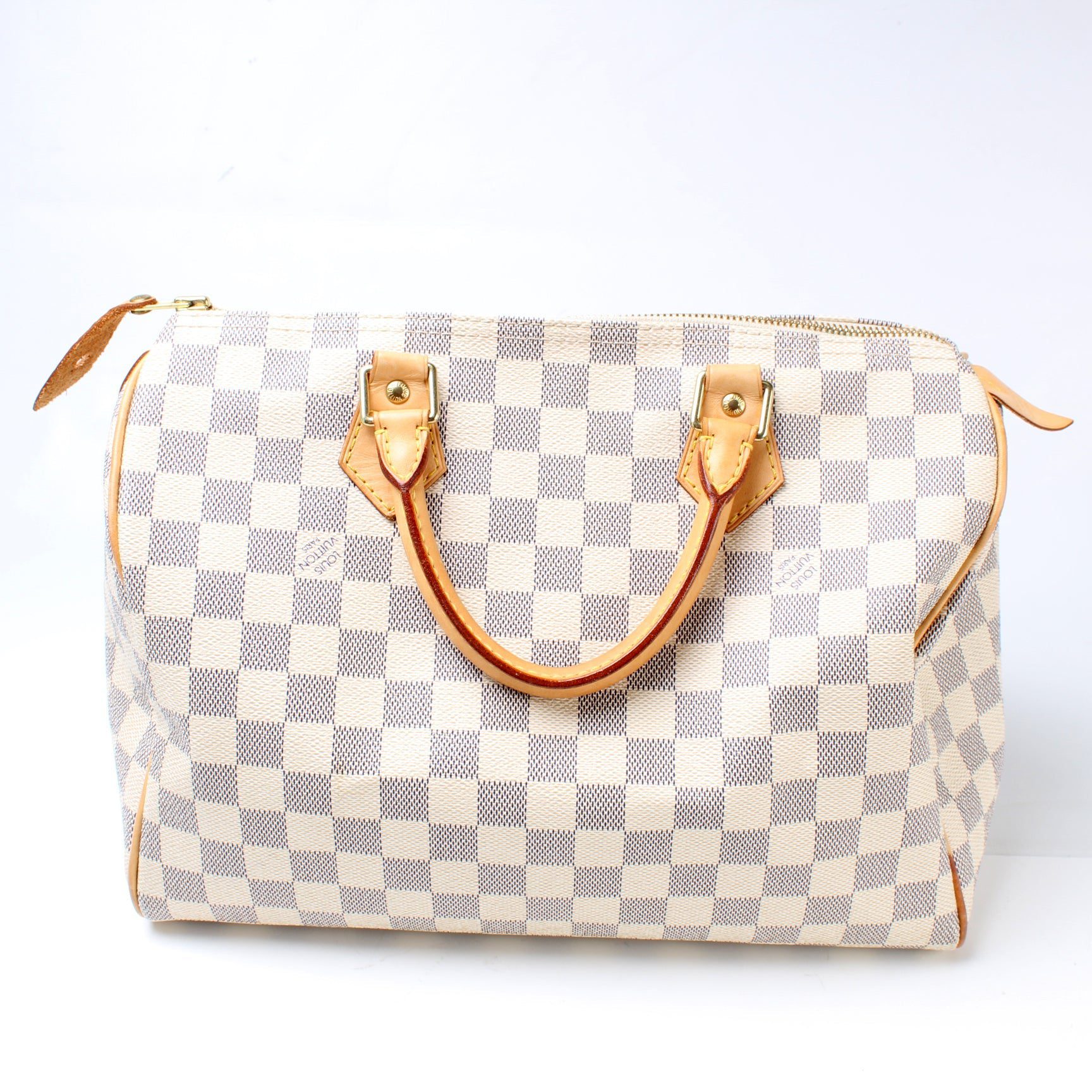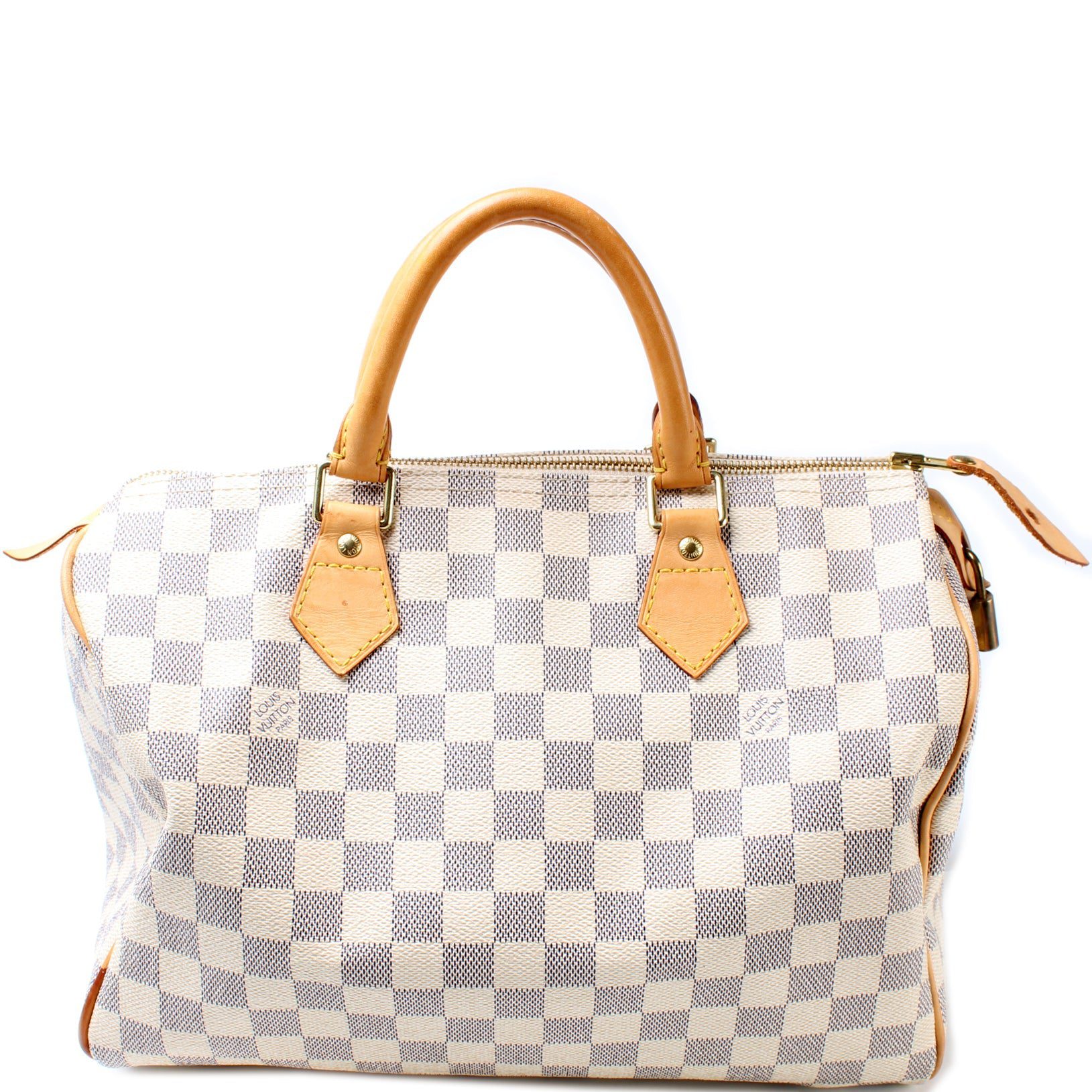 Louis Vuitton Speedy 30. The exterior is in the classic Damier Azur coated canvas. Â