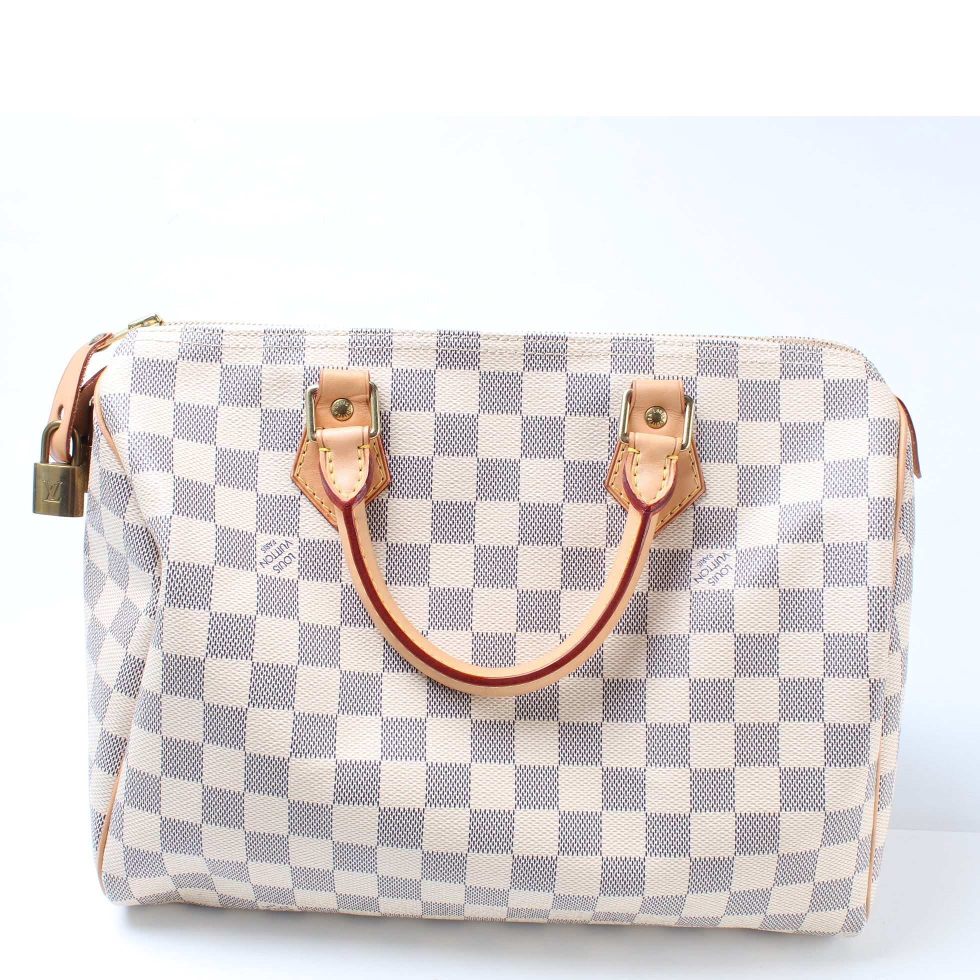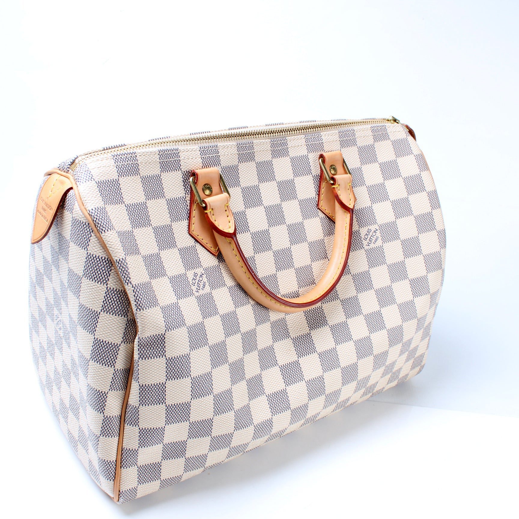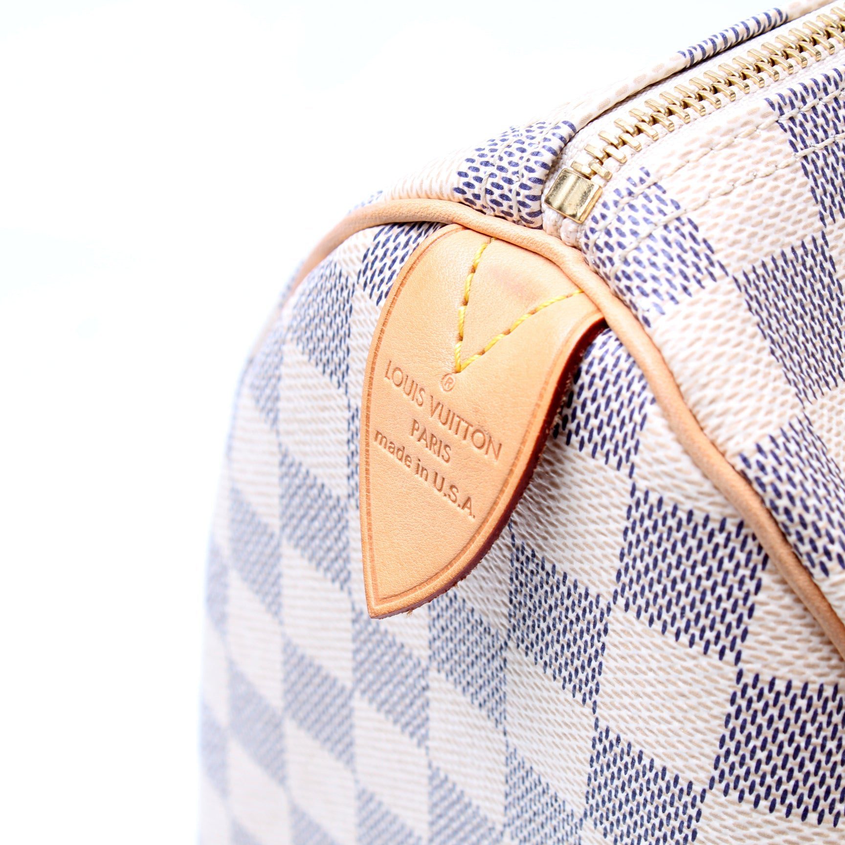 Louis Vuitton Speedy 30. The exterior is in the classic Damier Azur coated canvas. Â