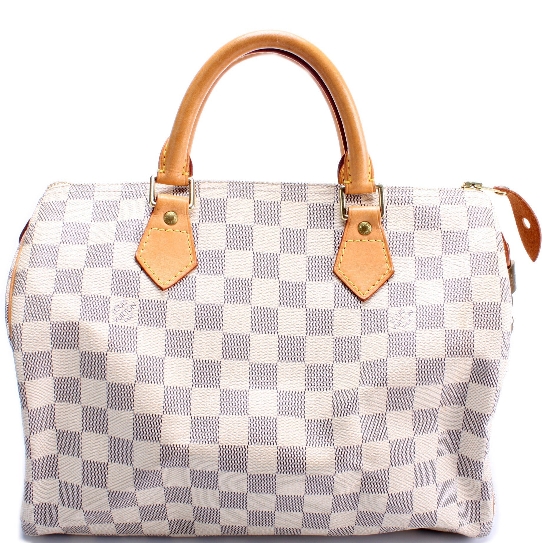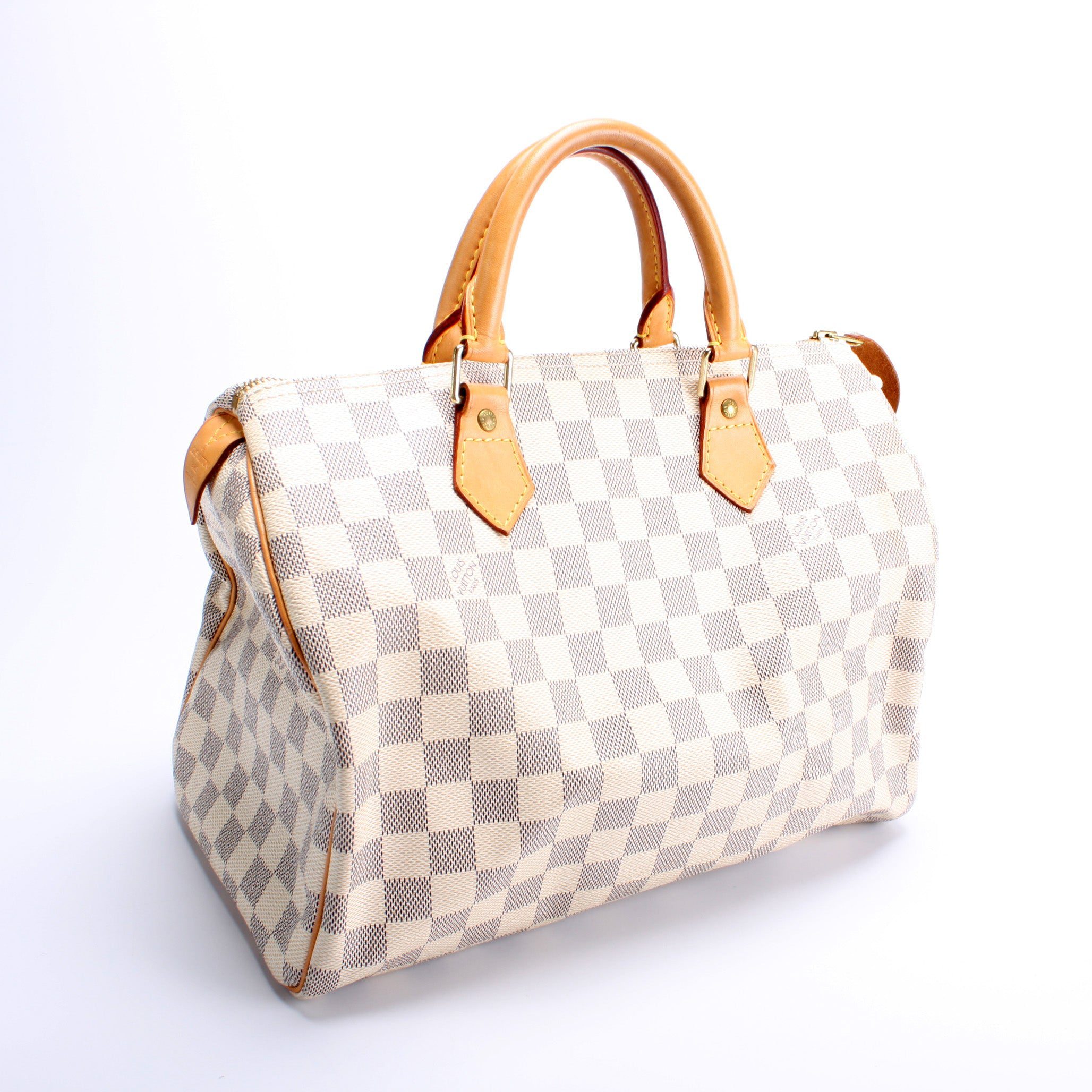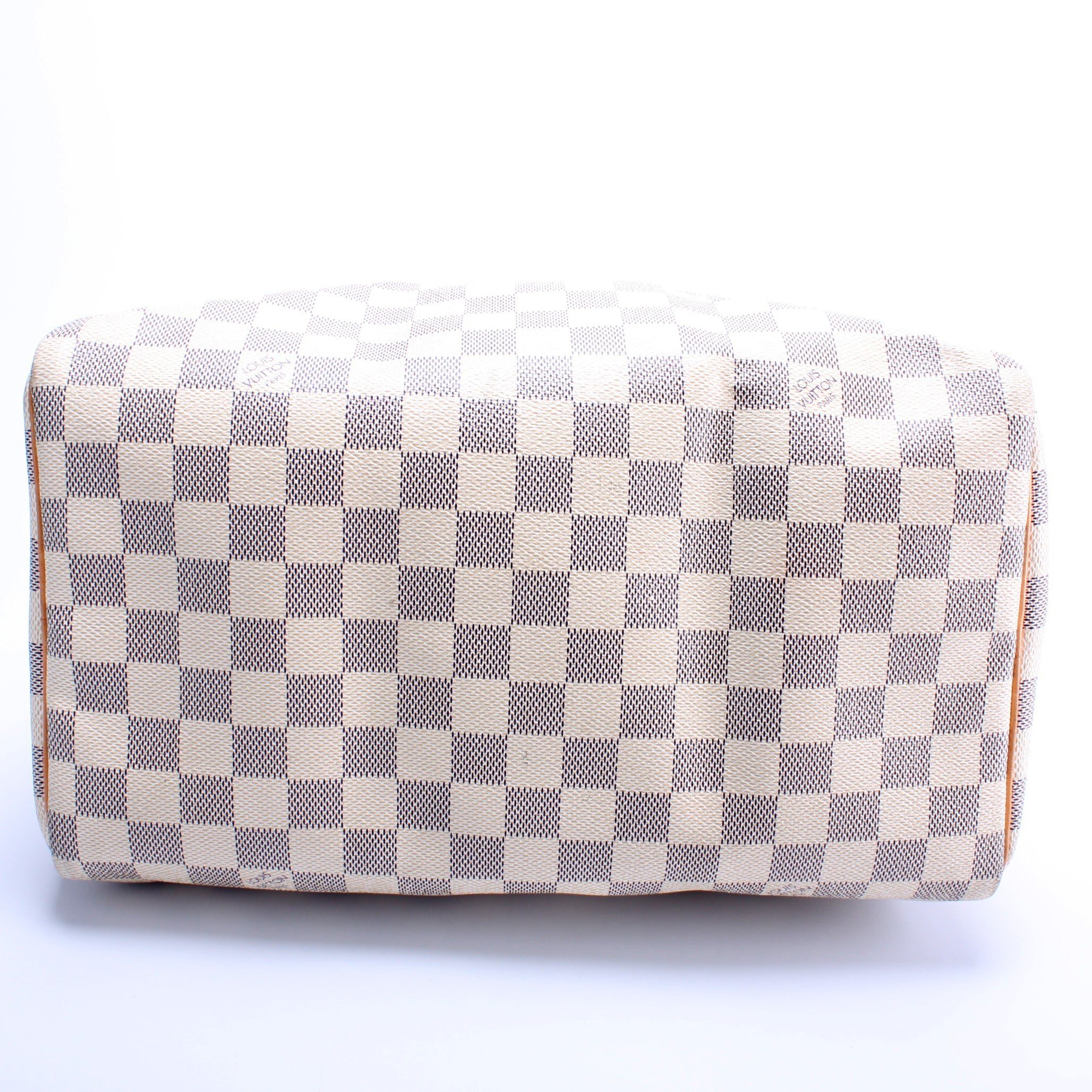 Louis Vuitton Speedy 30. The exterior is in the classic Damier Azur coated canvas. Â