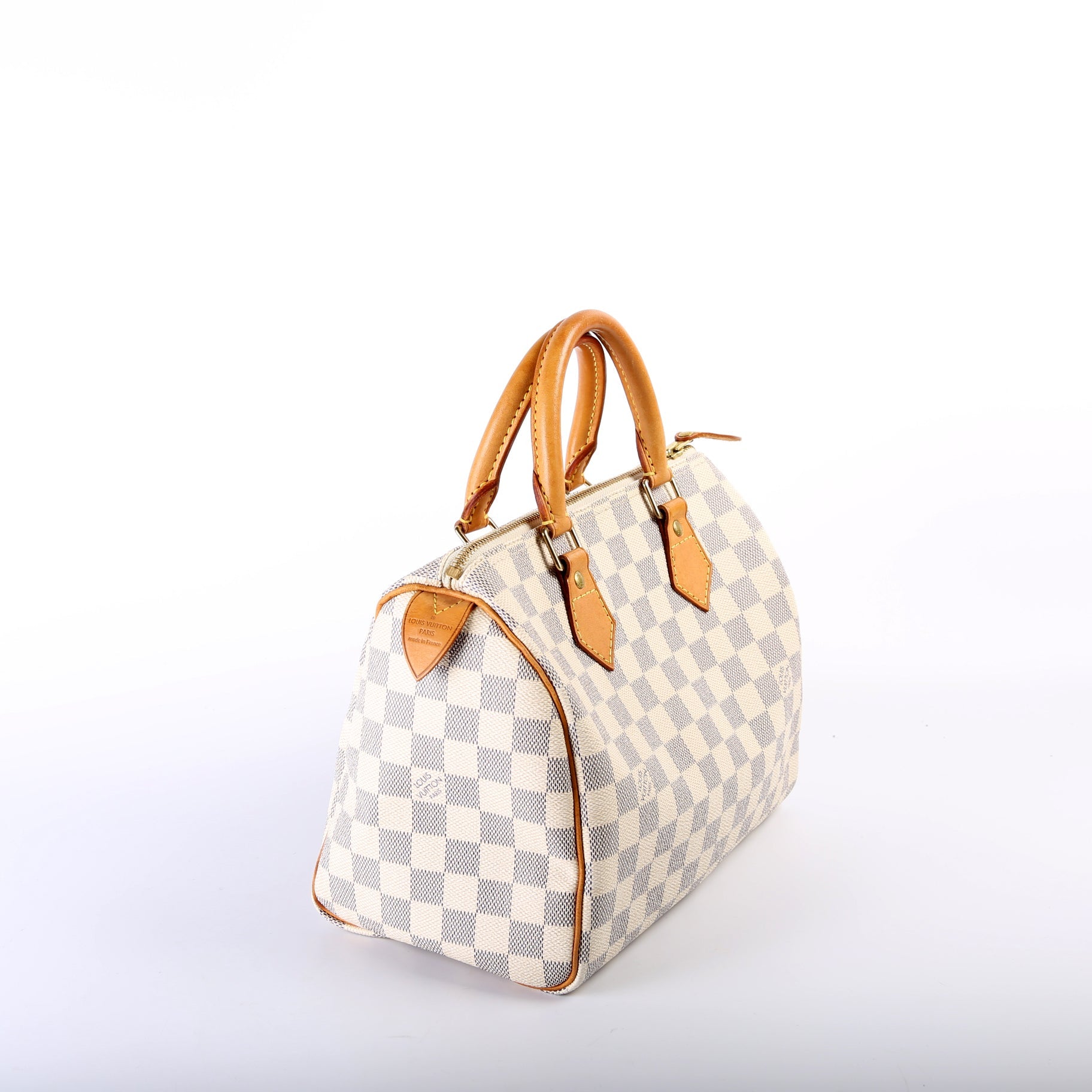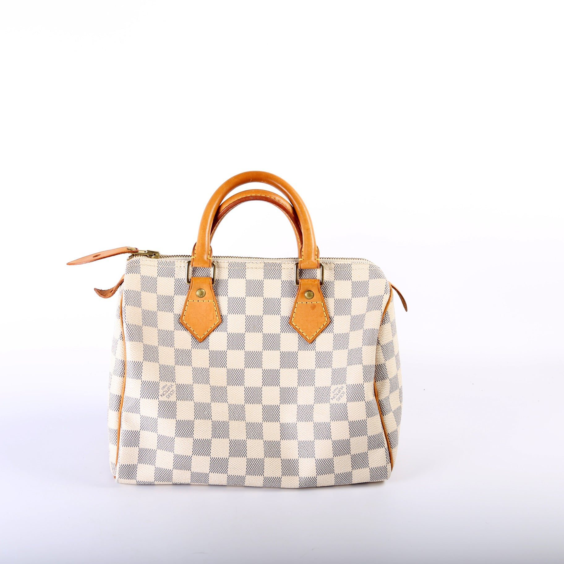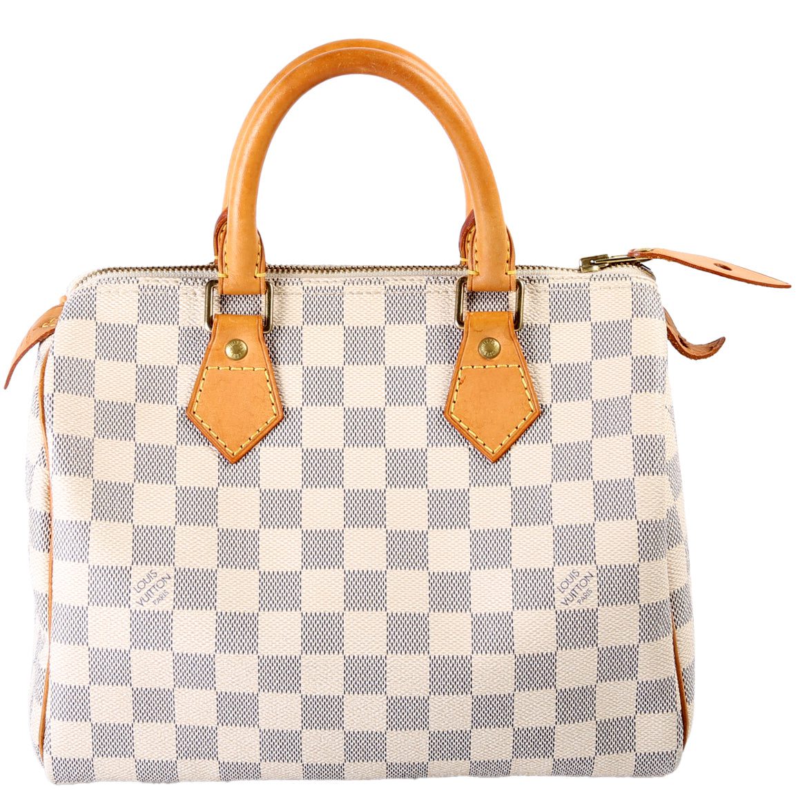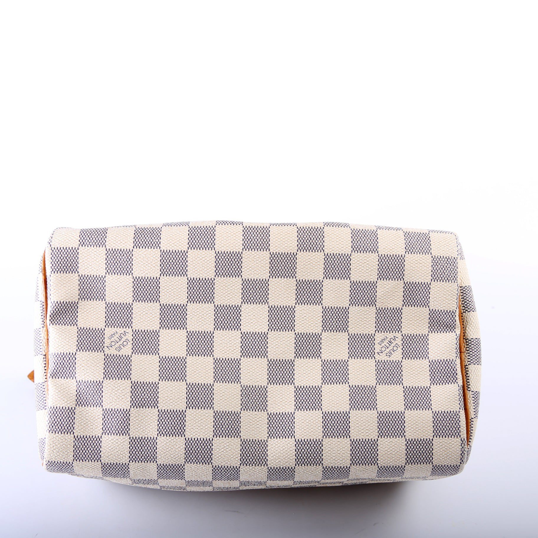 Louis Vuitton Speedy 30. The exterior is in the classic Louis Vuitton Damier Azur coated canvas.Â