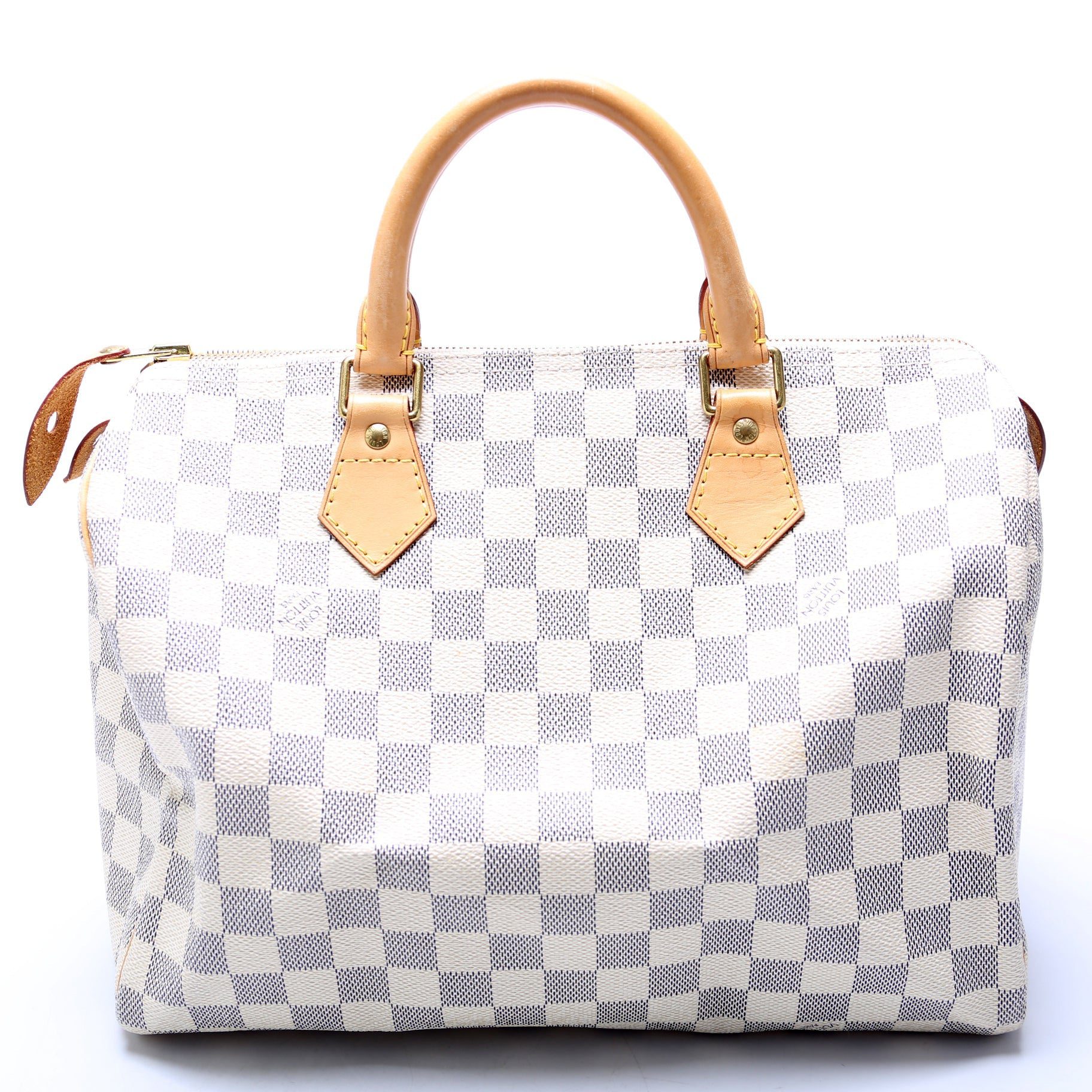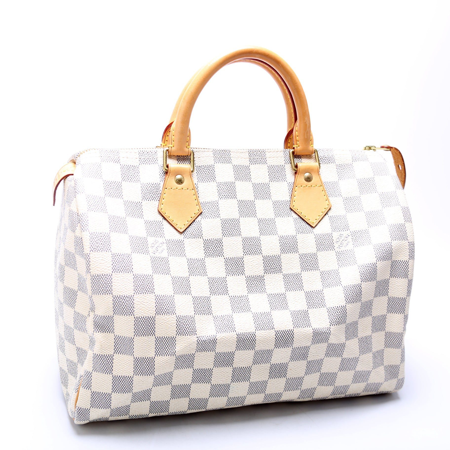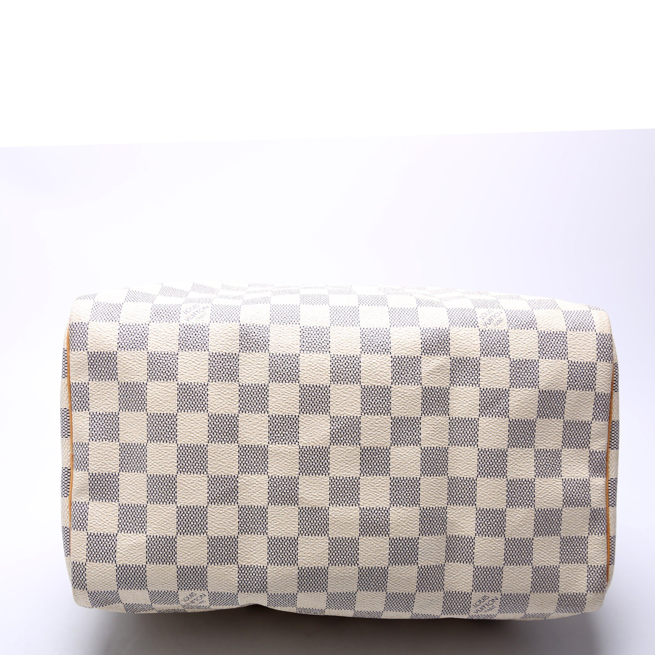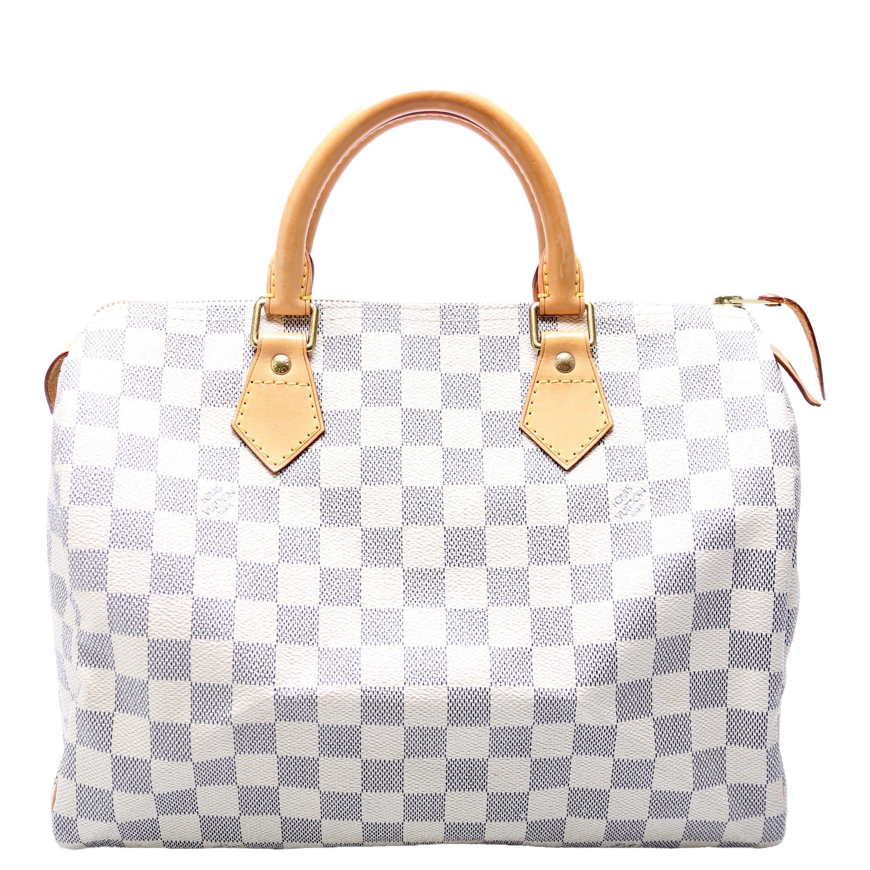 Louis Vuitton Speedy 30. The exterior is in the classic Louis Vuitton Damier Azur coated canvas.Â