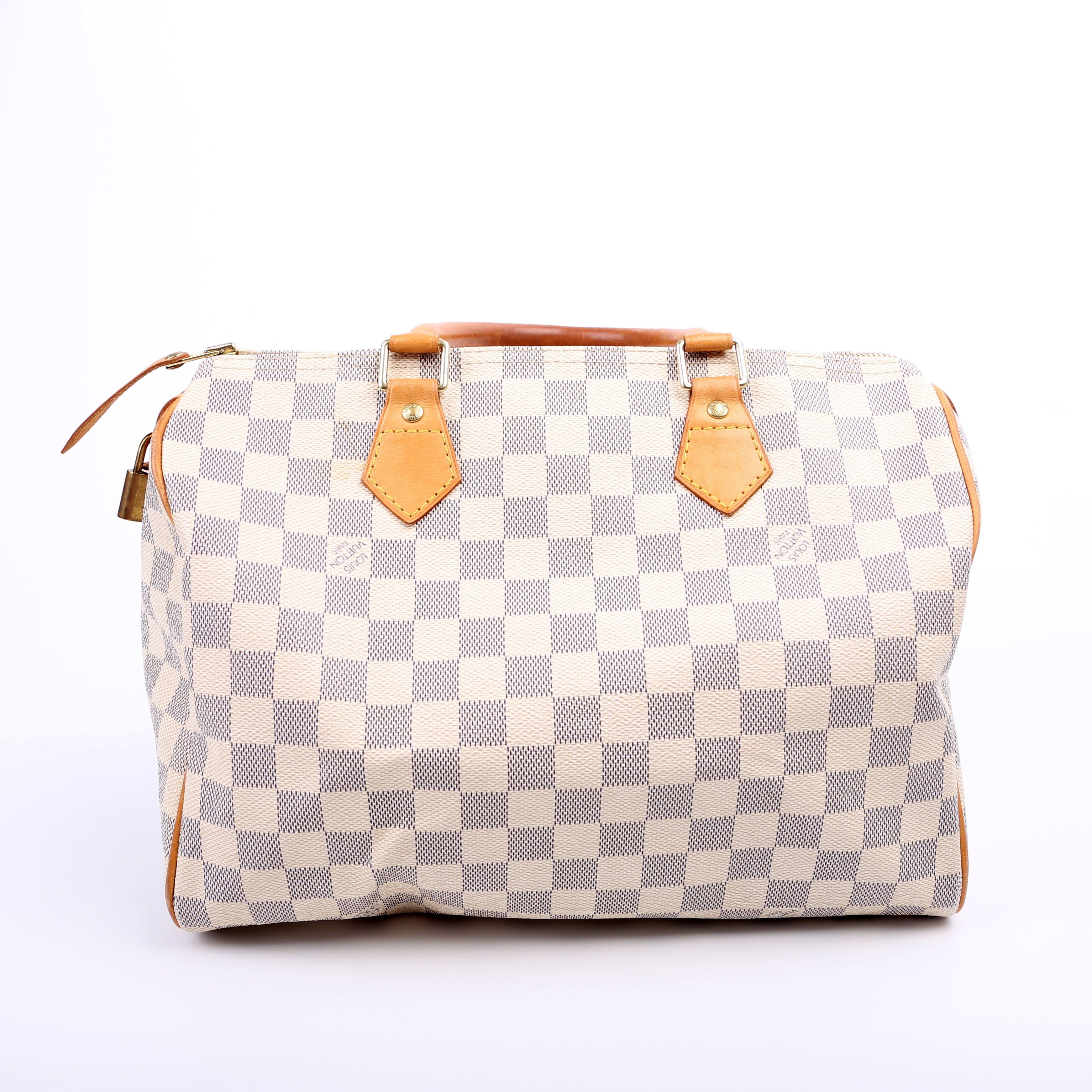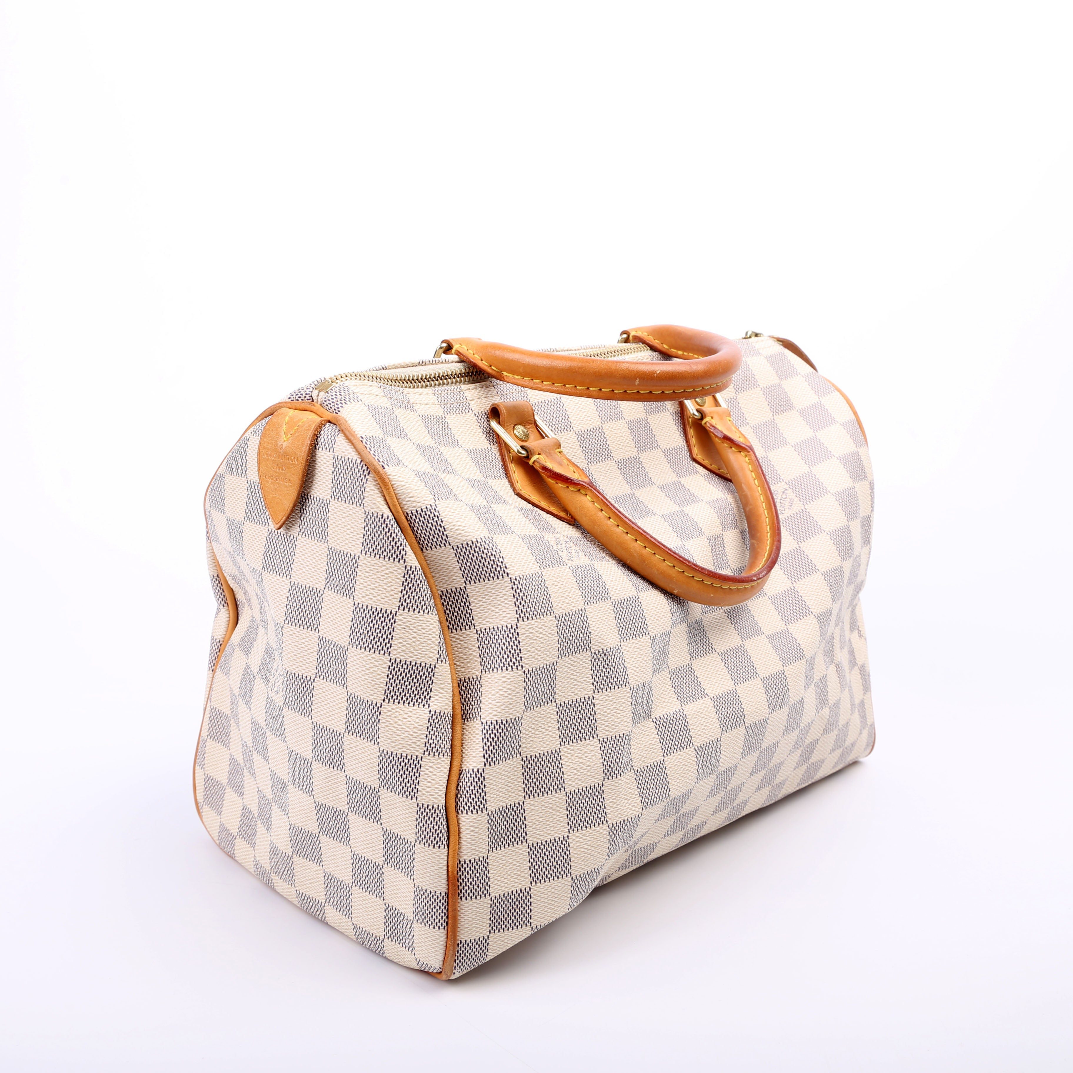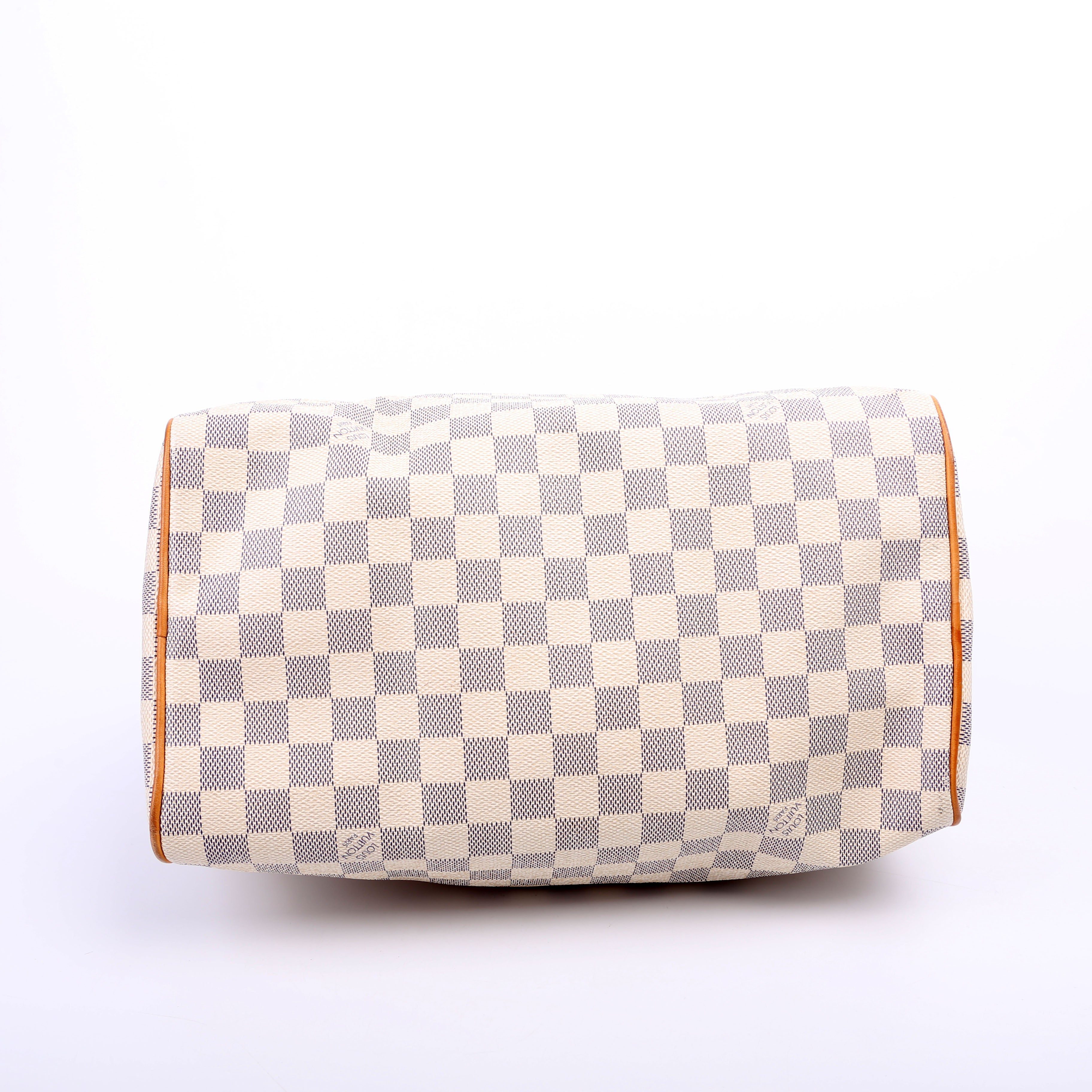 Louis Vuitton Speedy 30 . The exterior is in the classic Damier Azur coated canvas. Â
