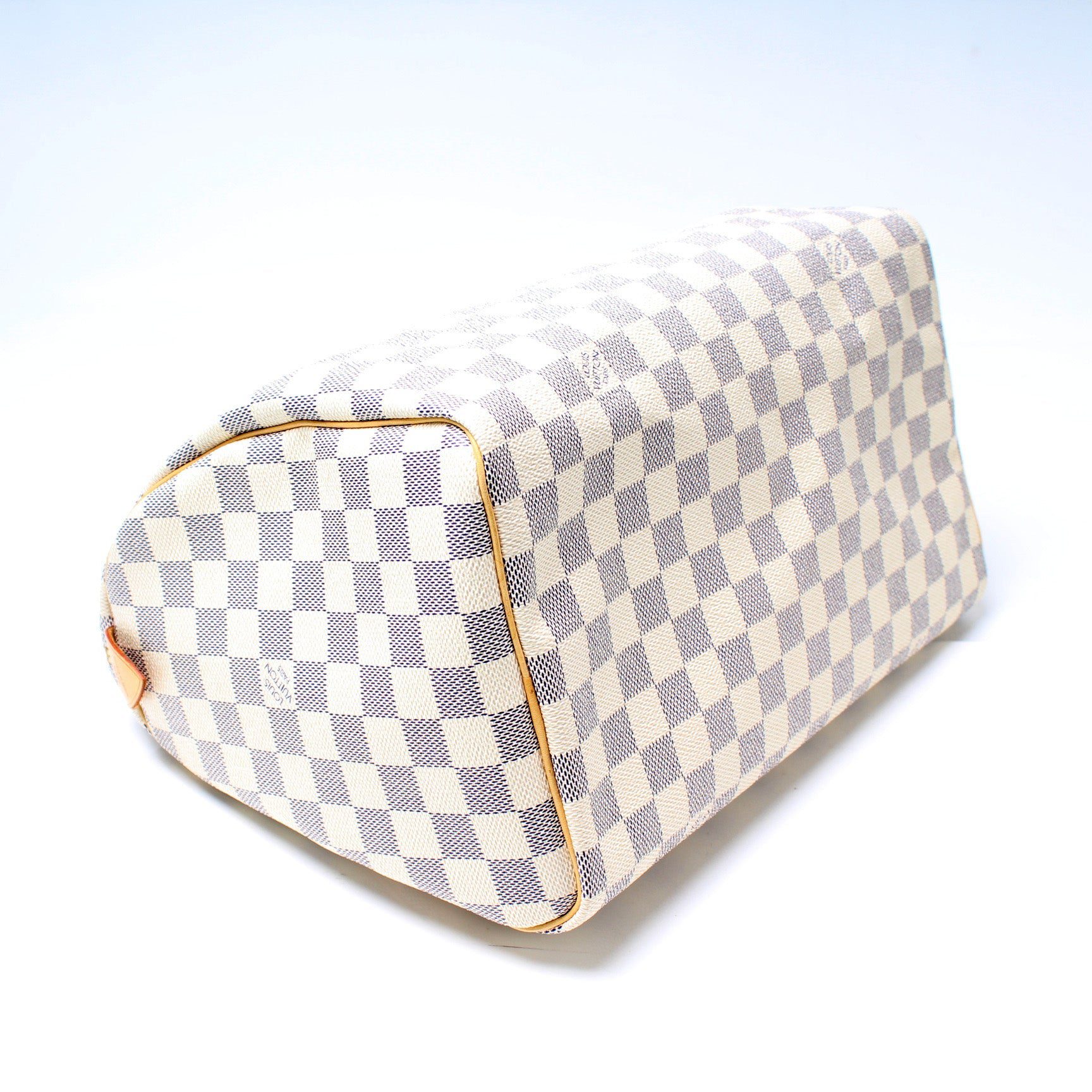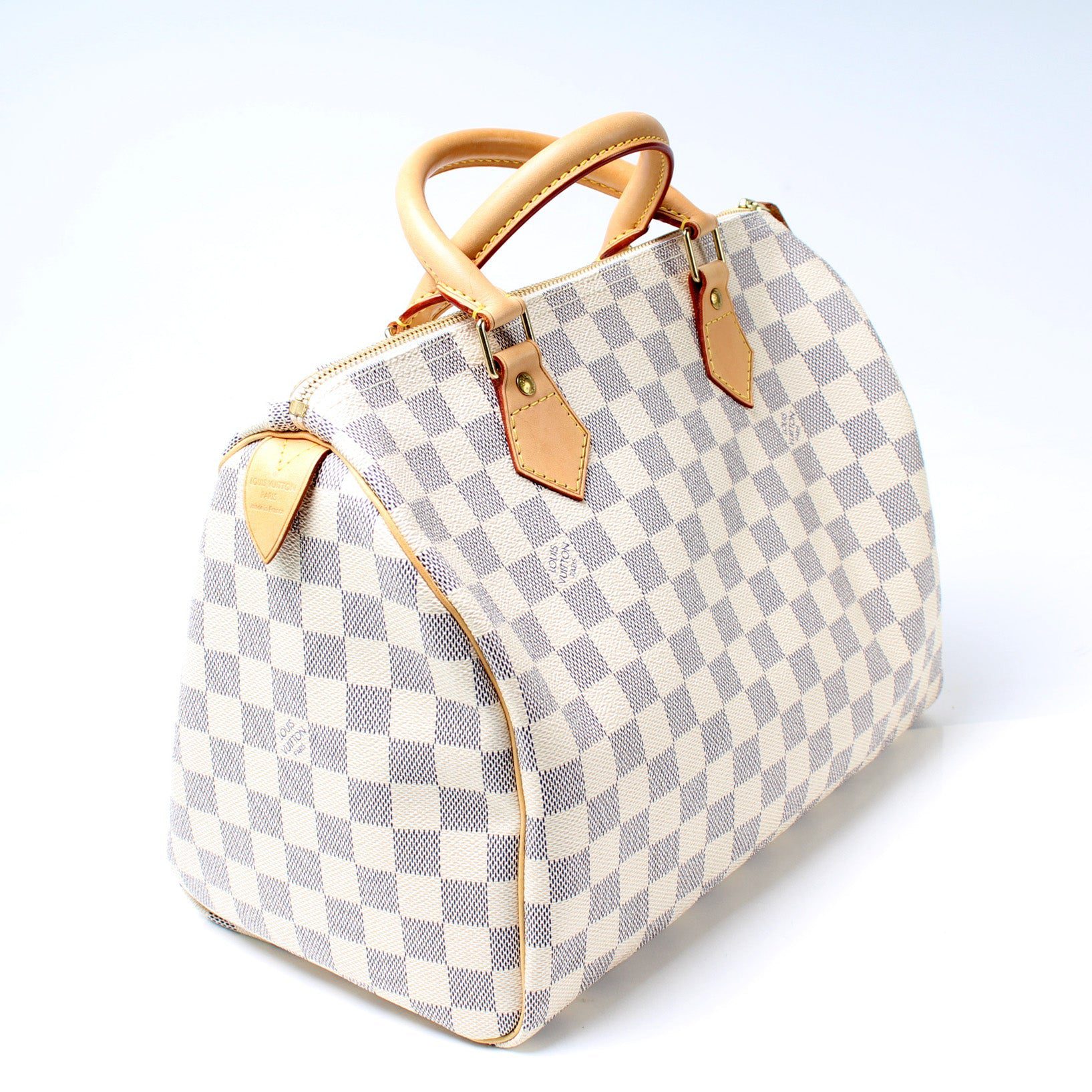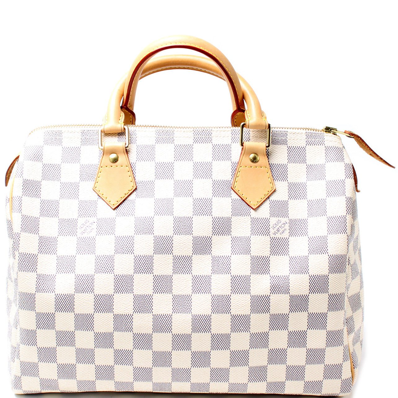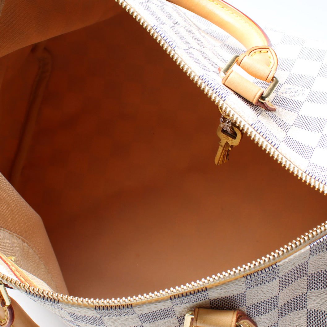 Louis Vuitton Speedy 30. The exterior is in the classic Damier Azur coated canvas. Â