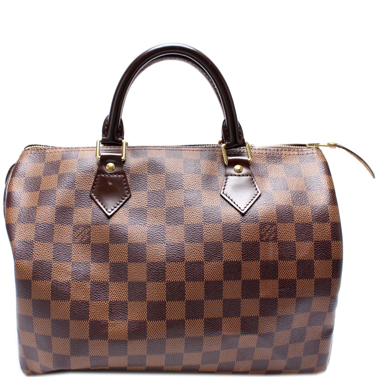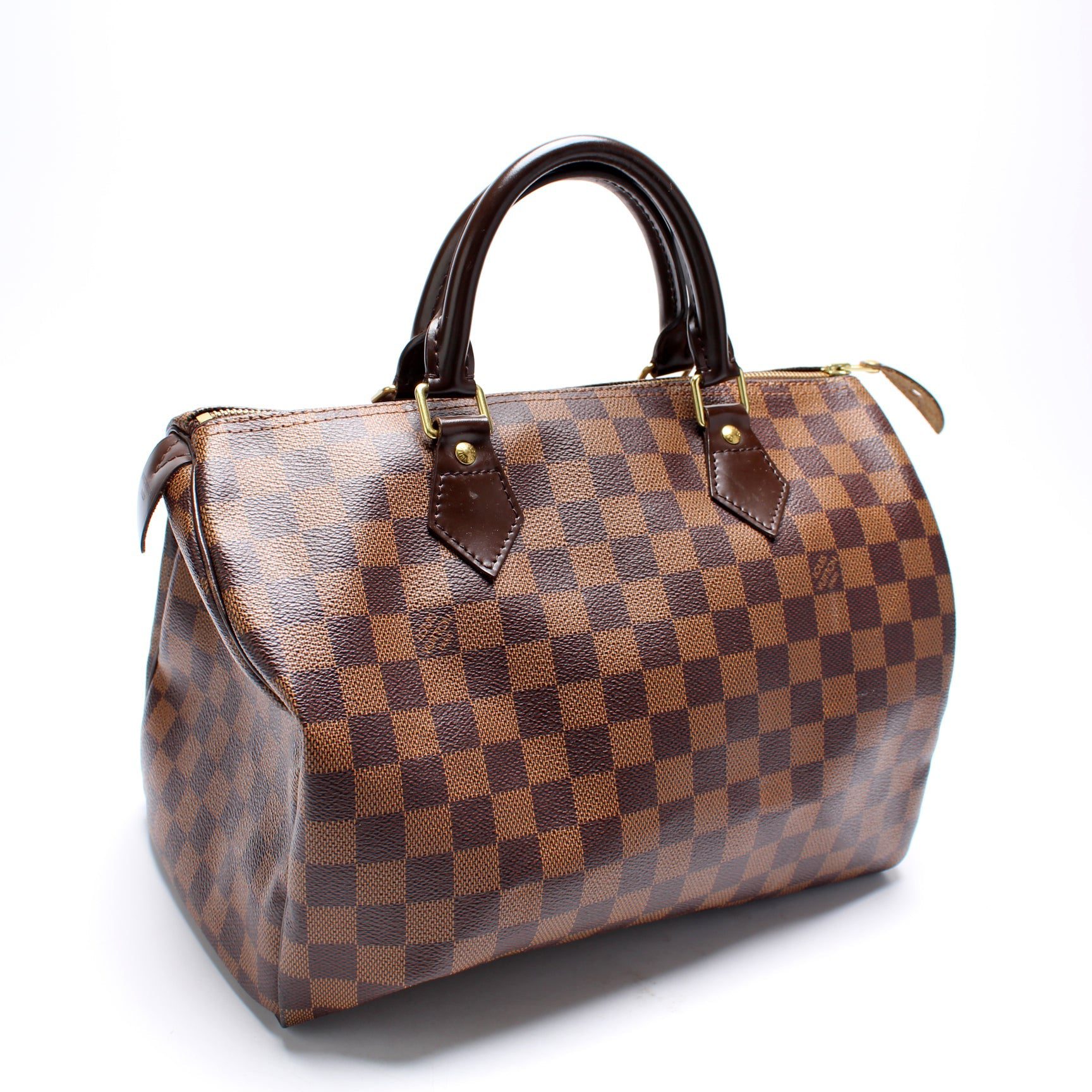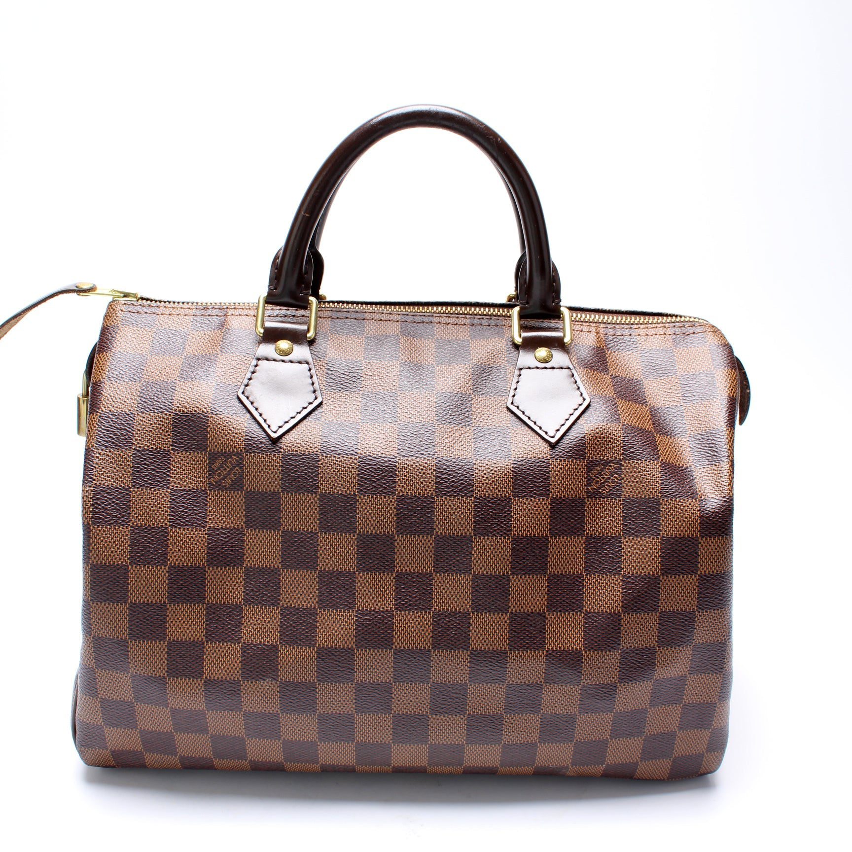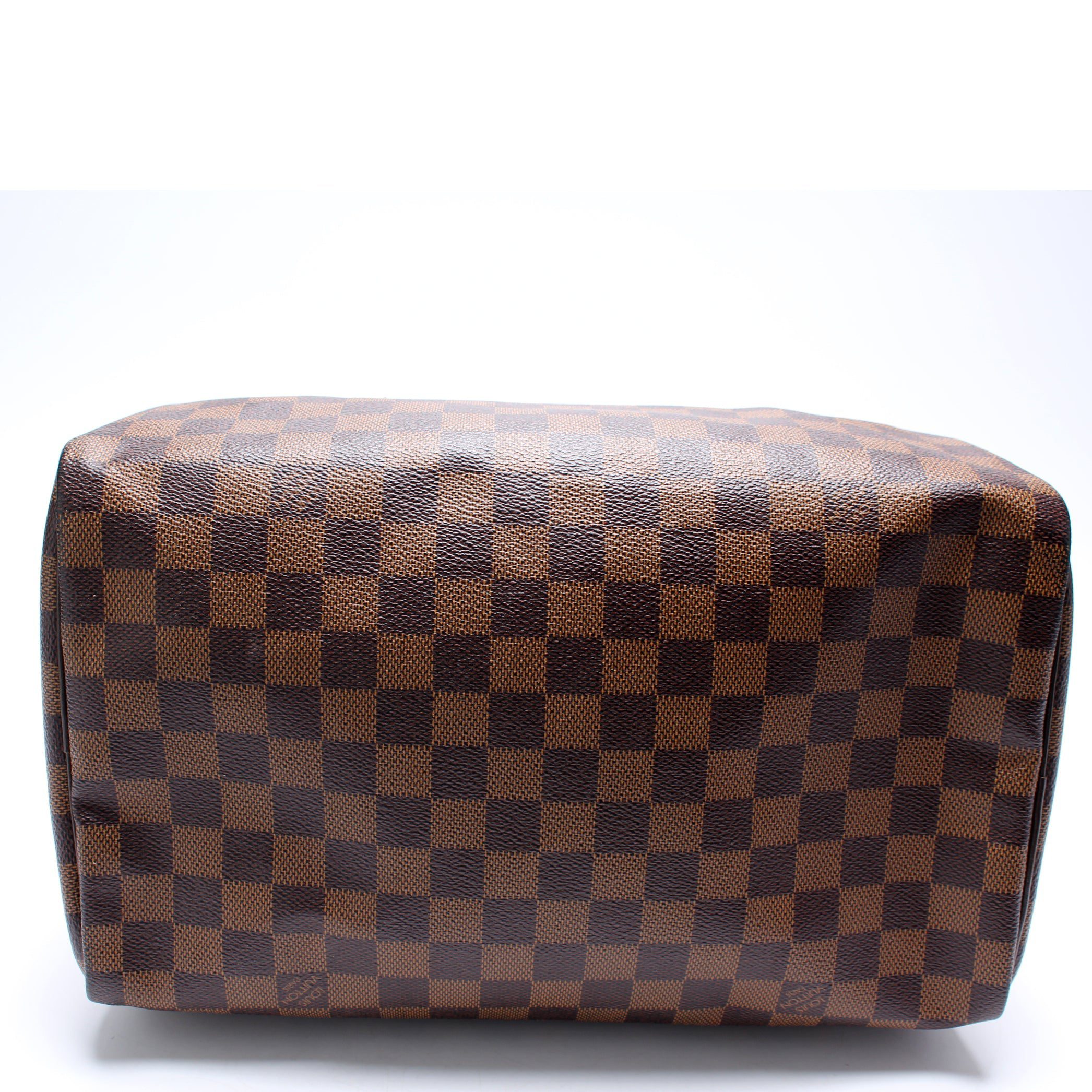 Louis Vuitton Speedy 30. The exterior is in the classic Louis Vuitton Damier Ebene coated canvas.Â