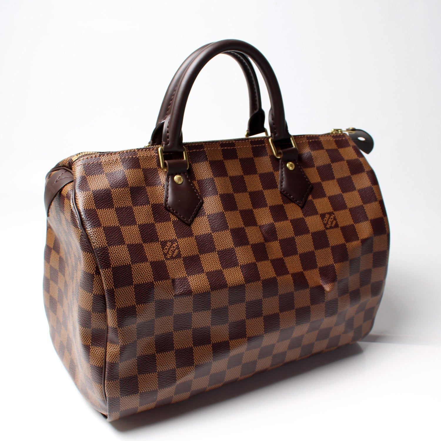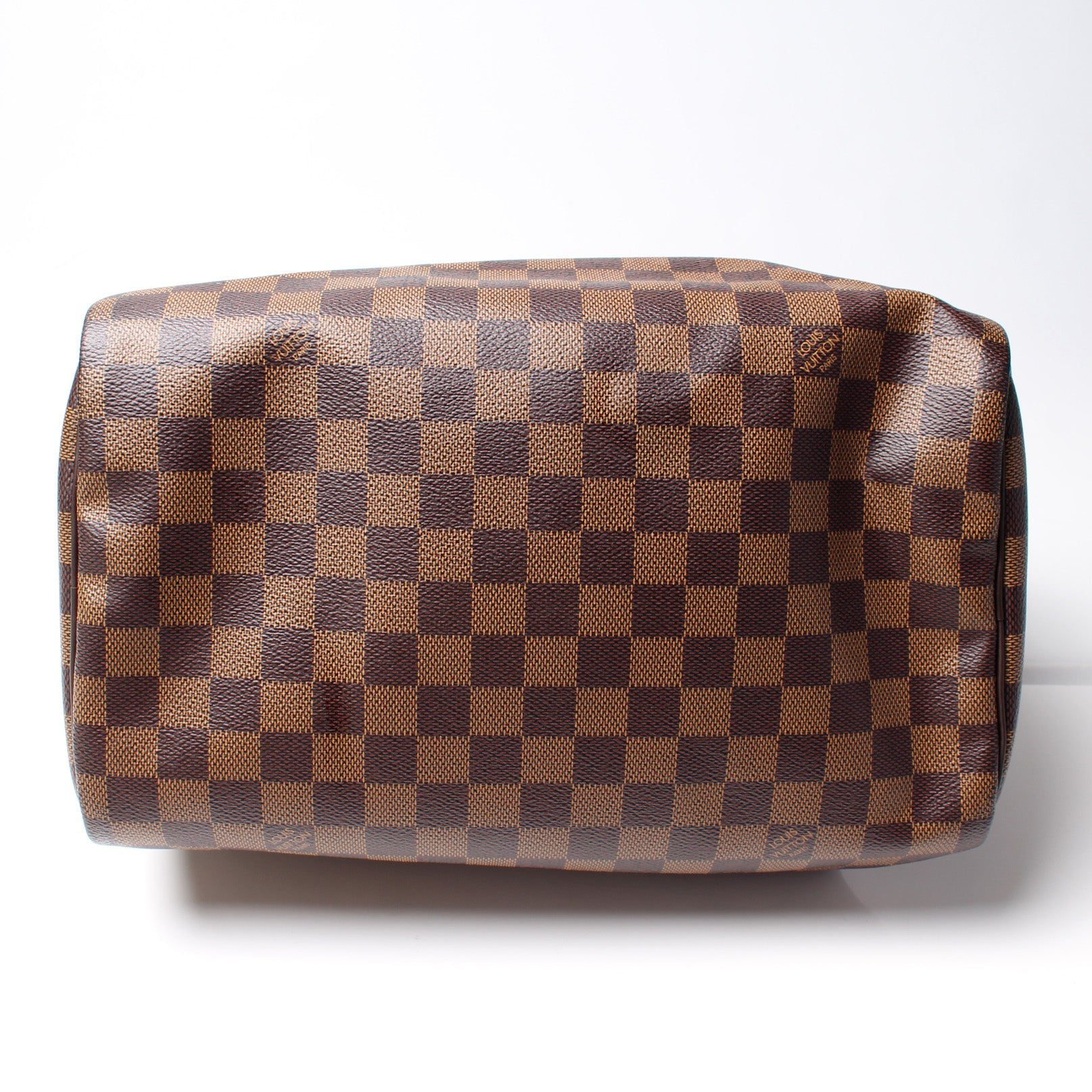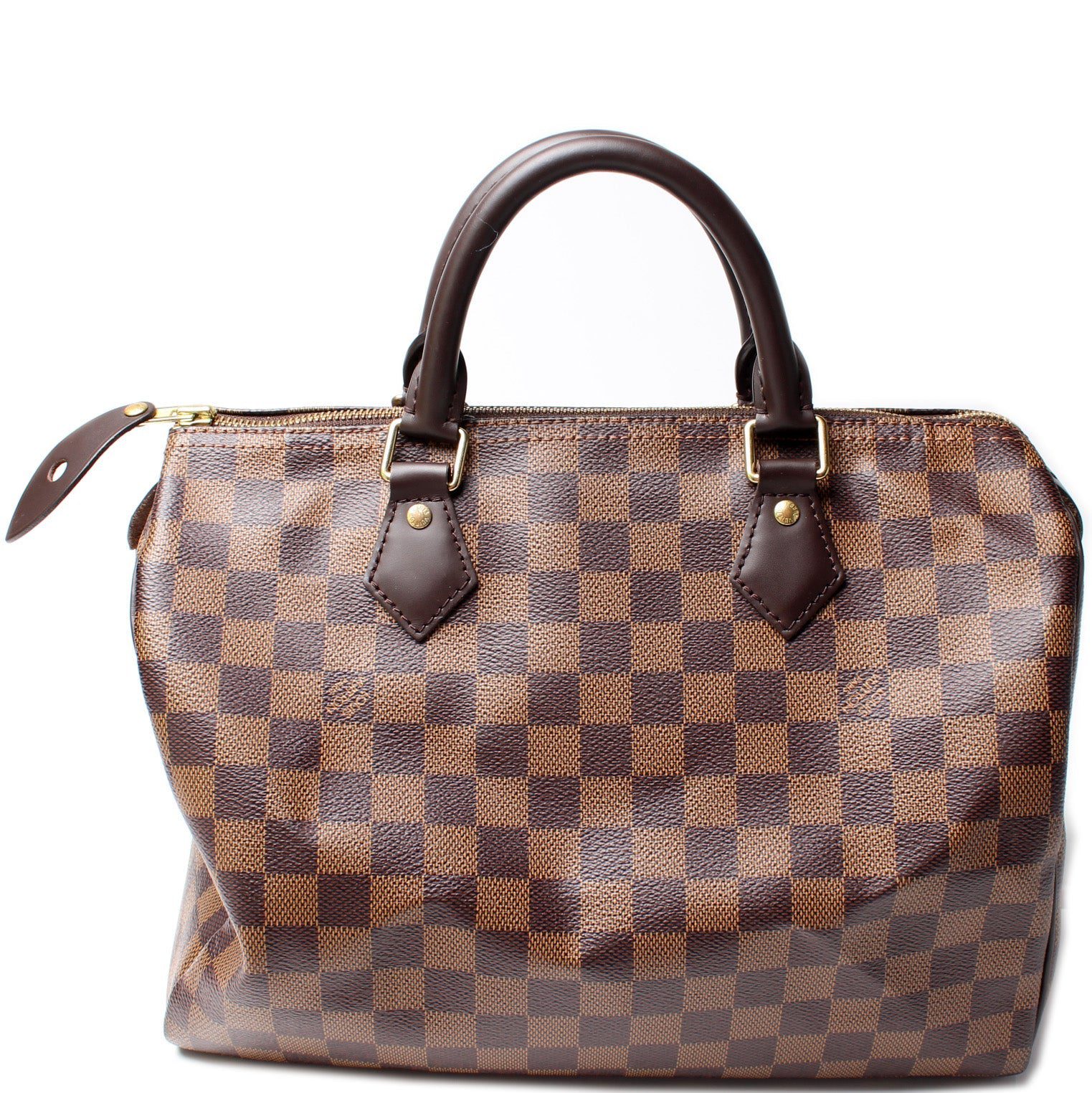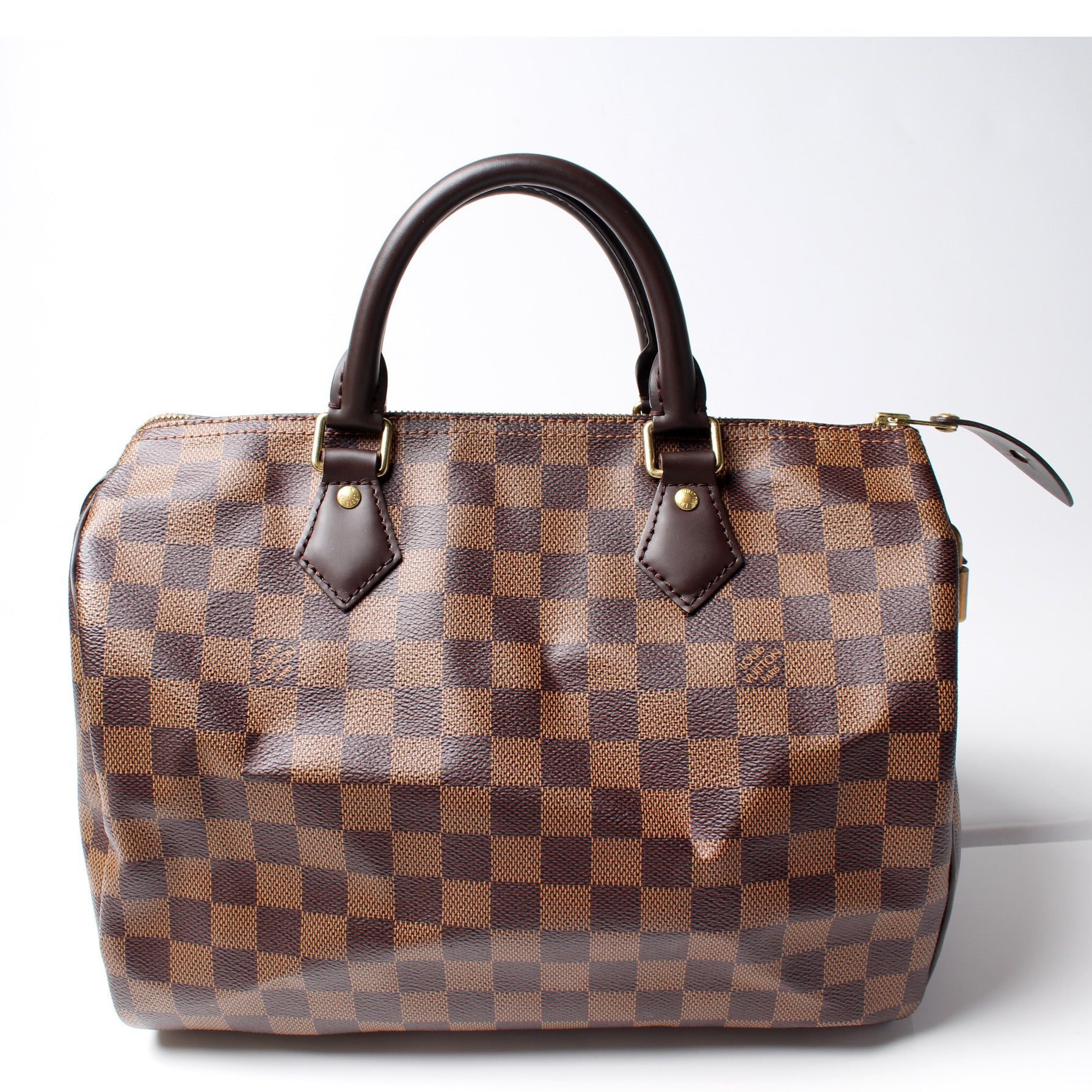 Louis Vuitton Speedy 30. The exterior is in the classic Louis Vuitton Damier Ebene coated canvas.Â