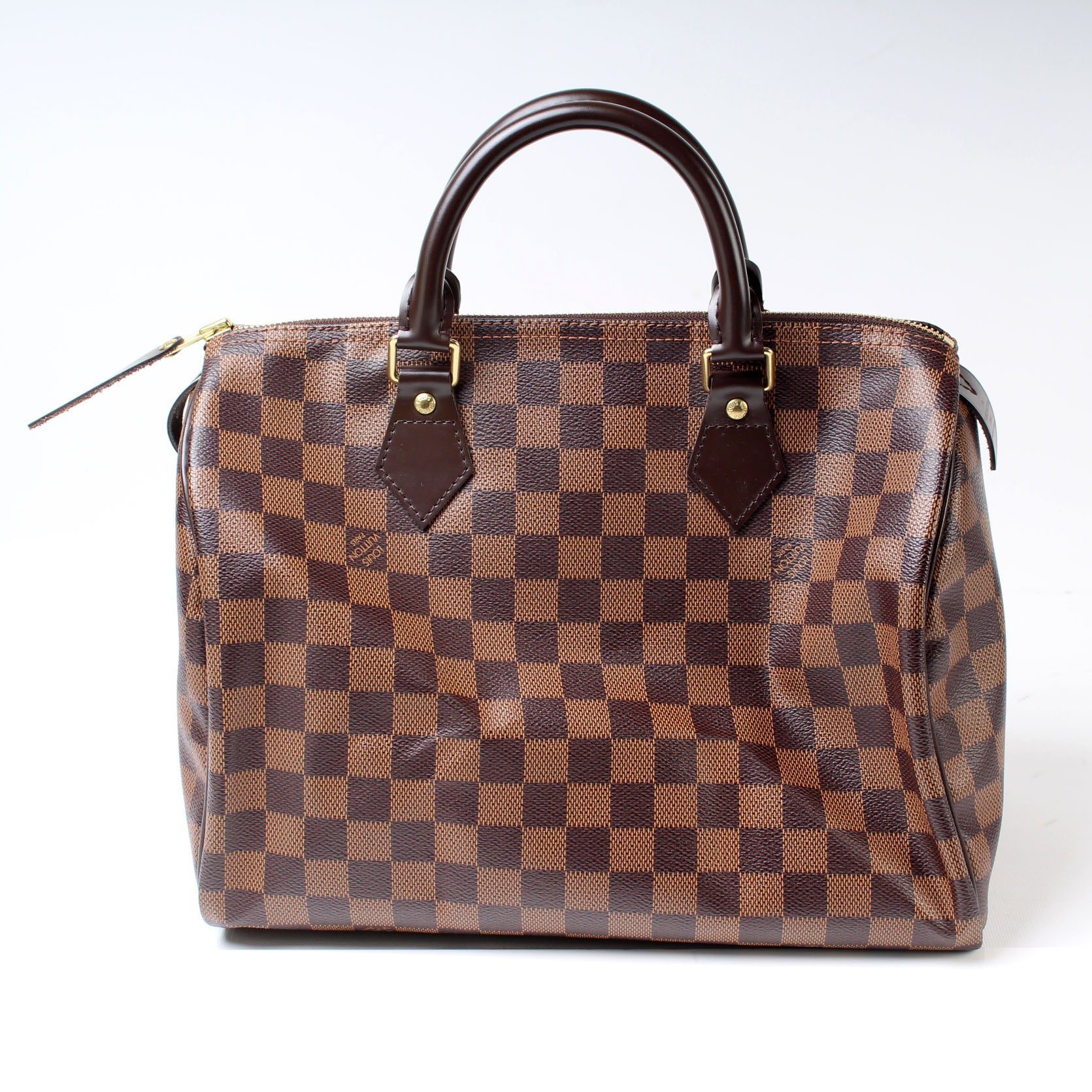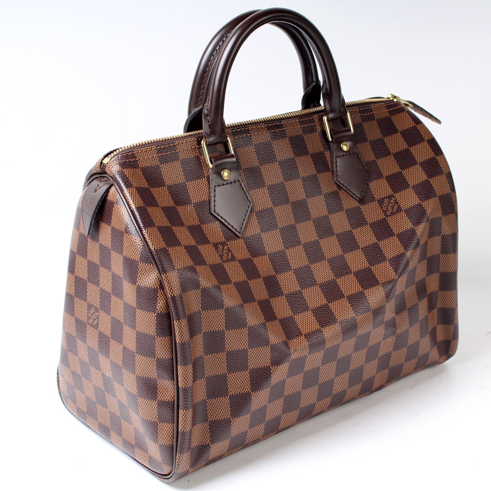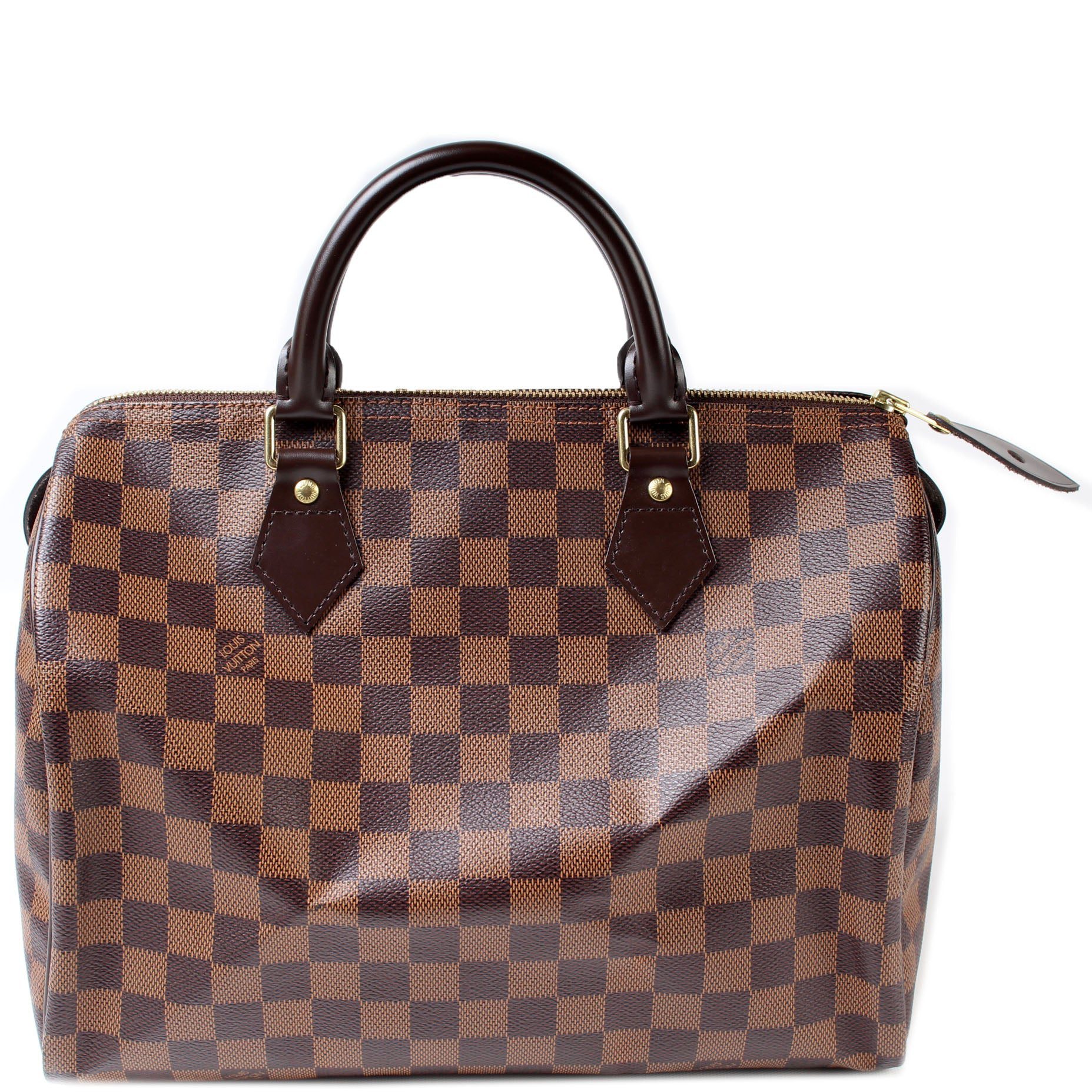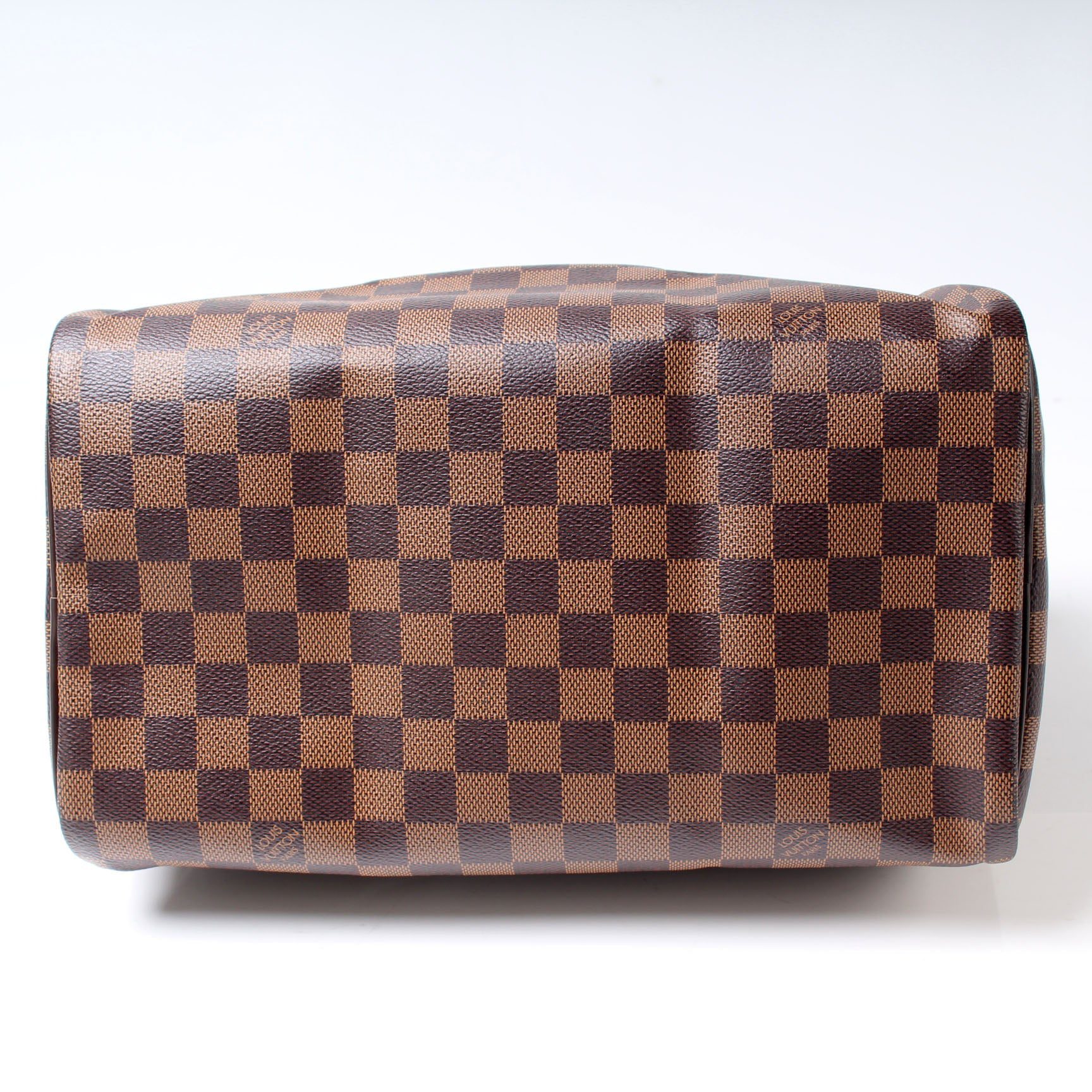 Louis Vuitton Speedy 30. The exterior is in the classic Damier Ebene coated canvas. Â