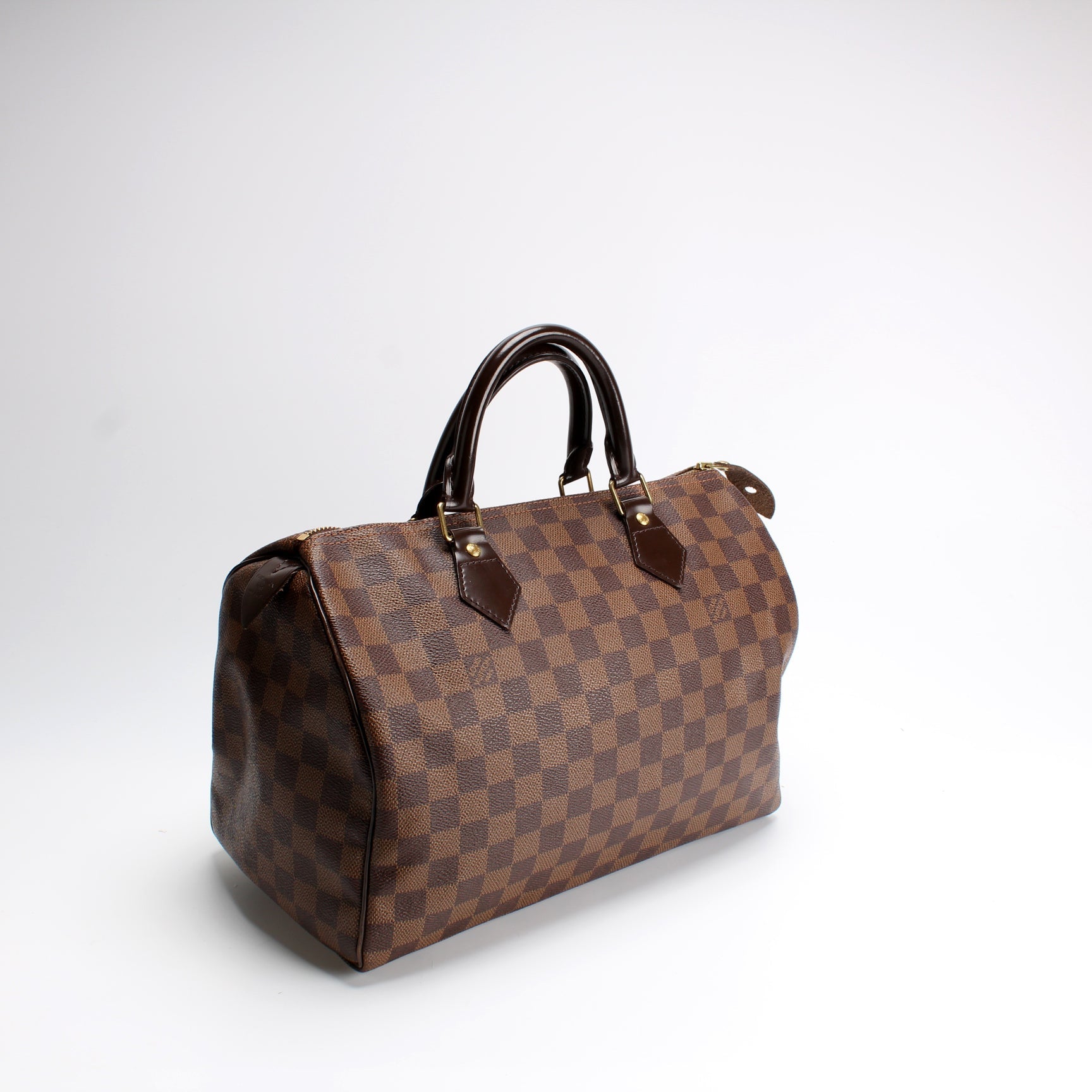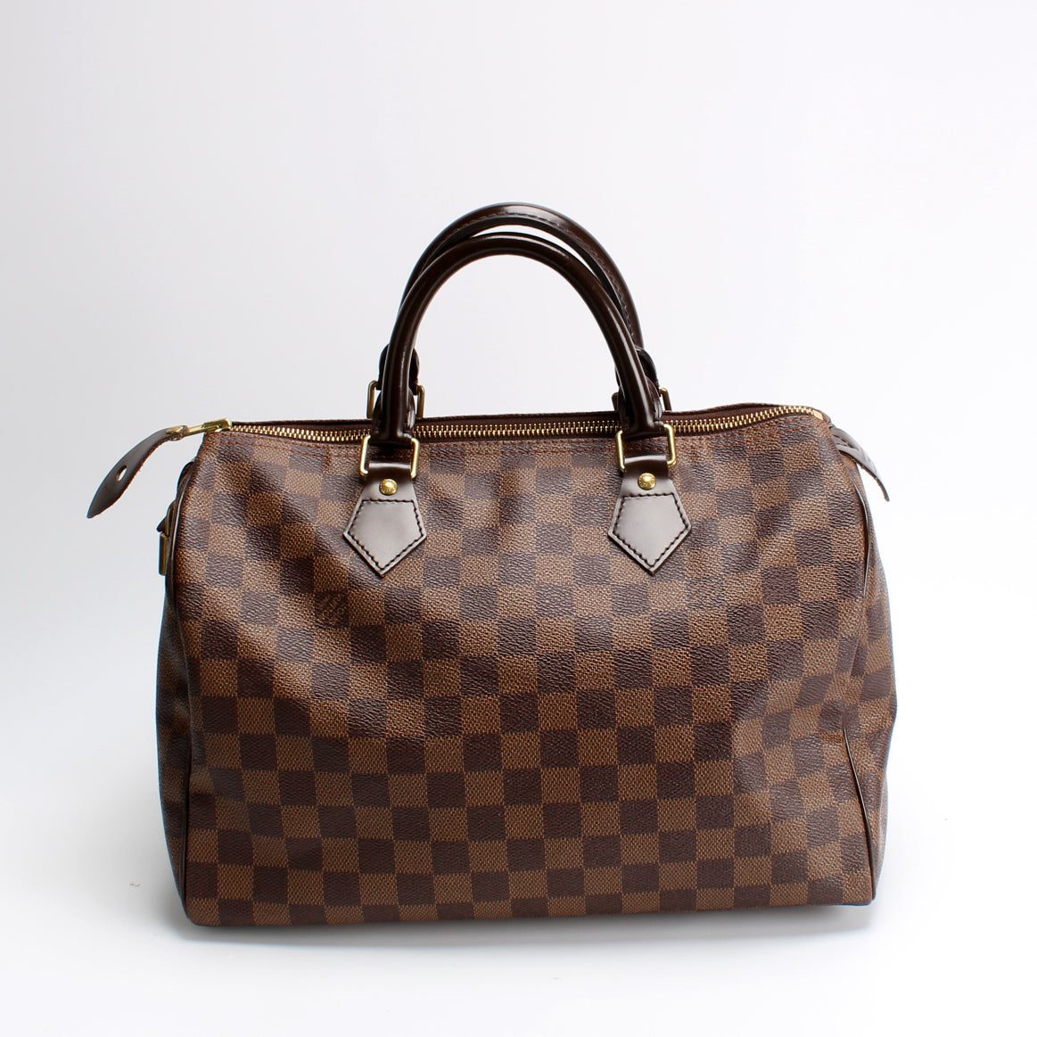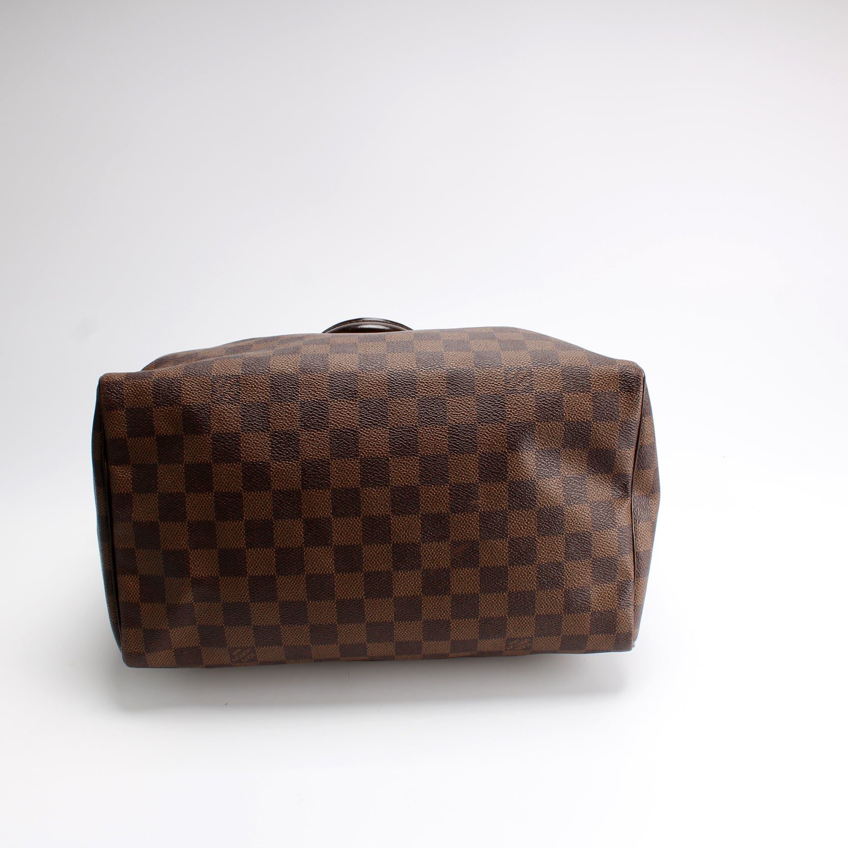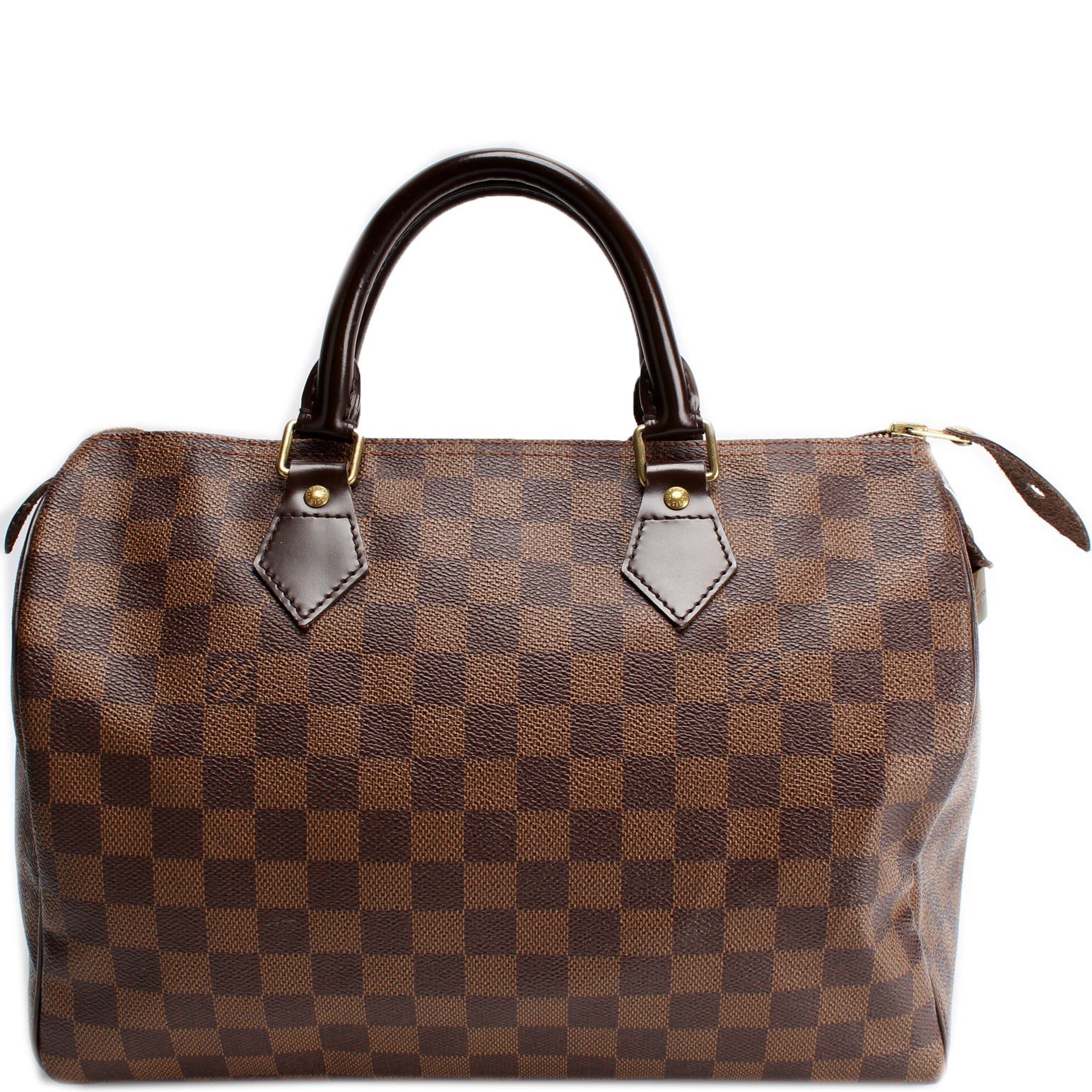 Louis Vuitton Speedy 30. The exterior is in the classic Damier Ebene coated canvas. Â