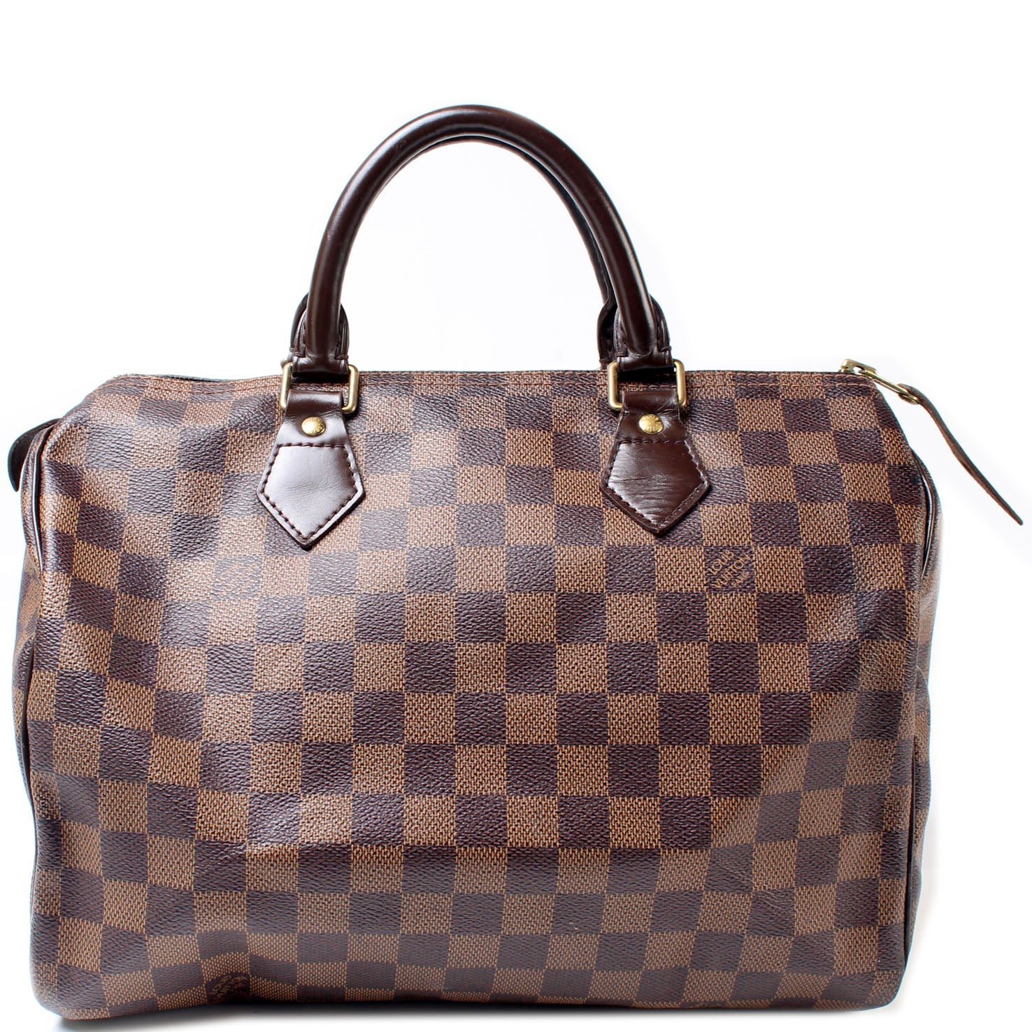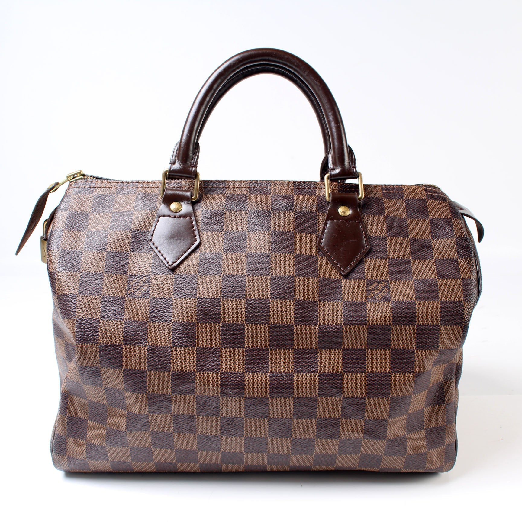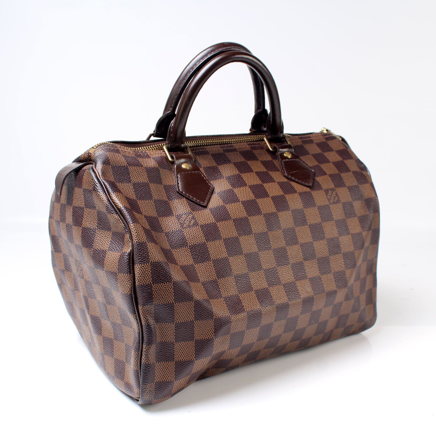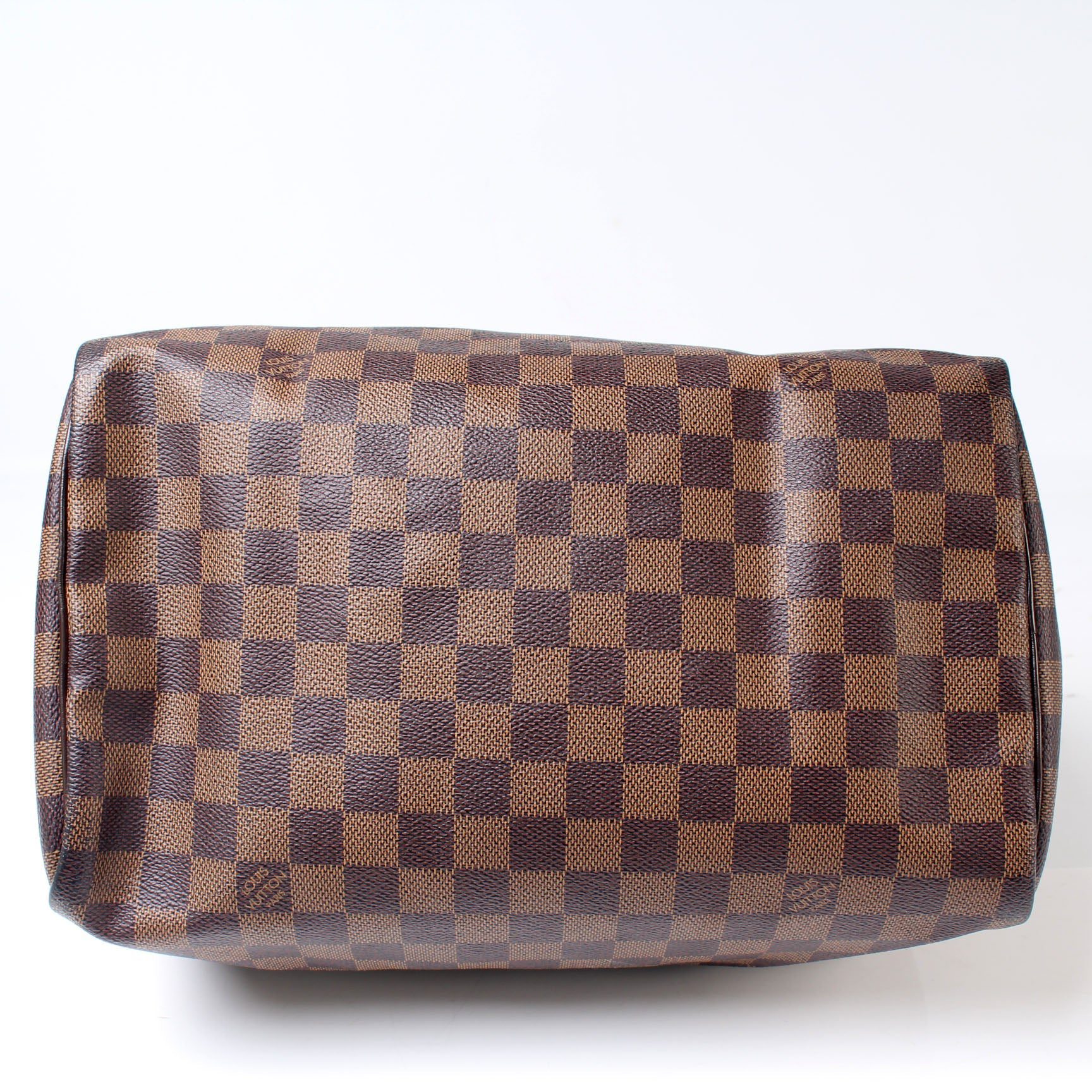 Louis Vuitton Speedy 30. The exterior is in the classic Louis Vuitton Damier Ebene coated canvas.Â