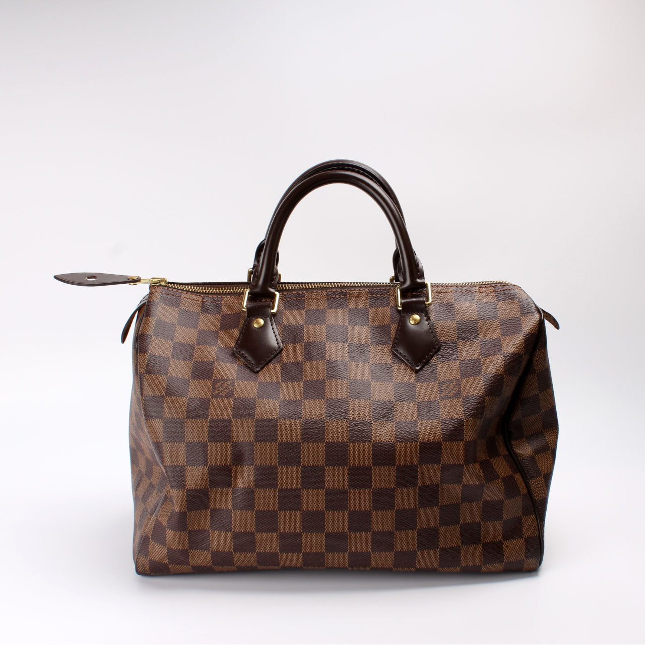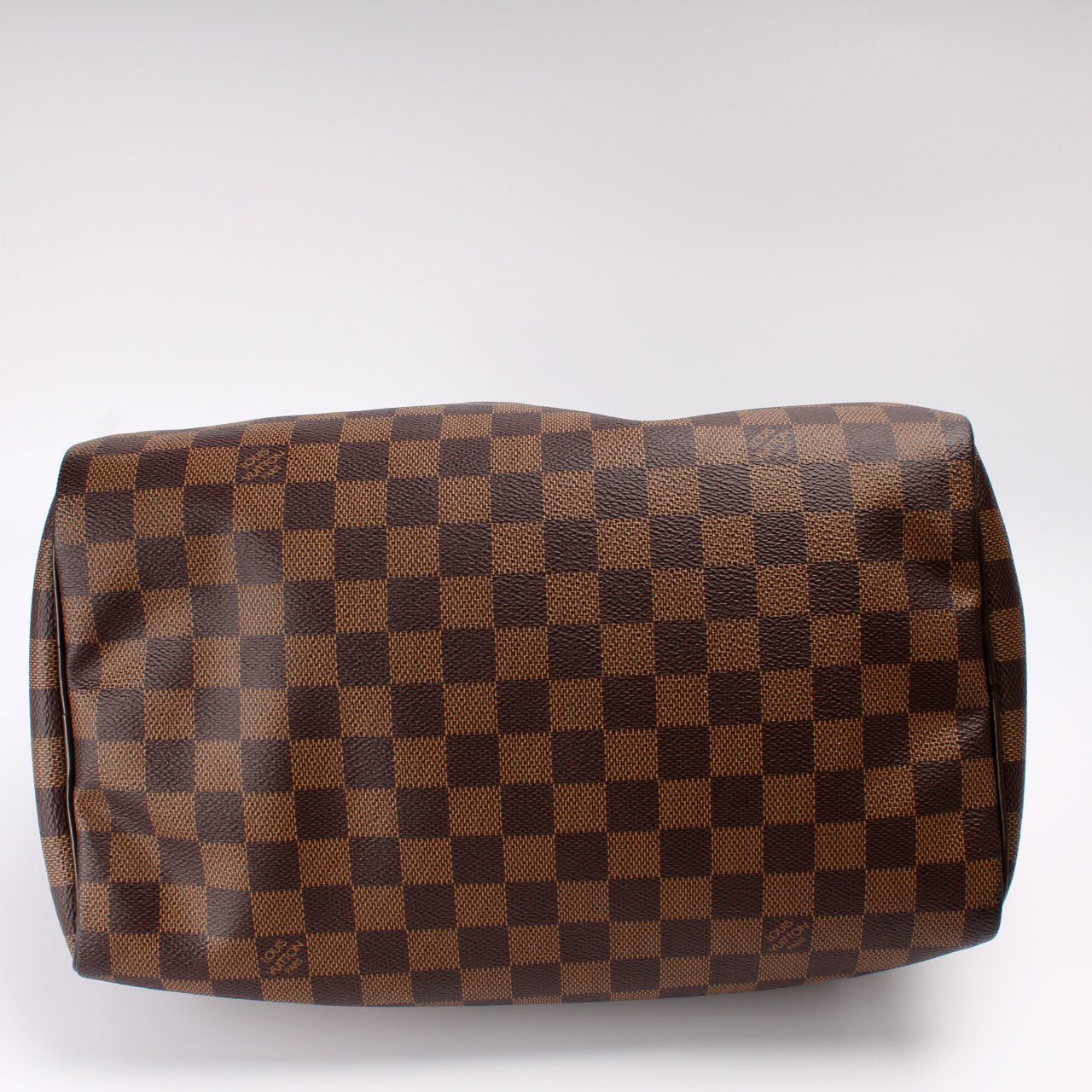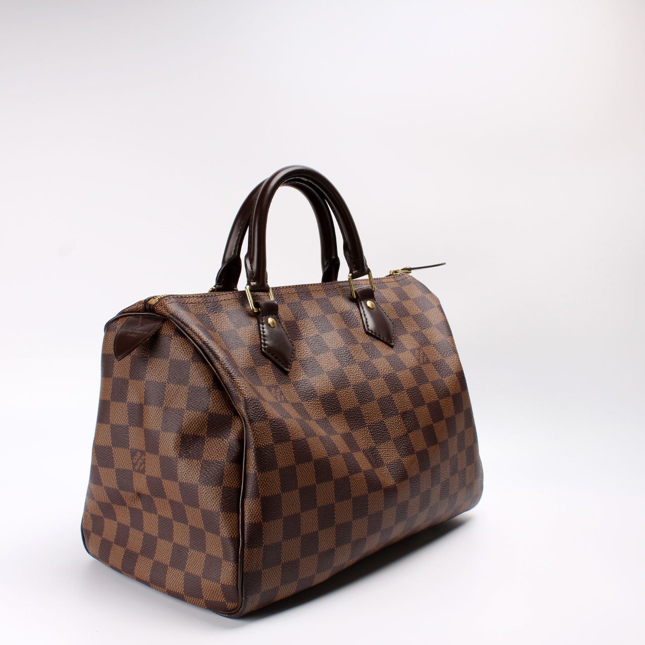 Louis Vuitton Speedy 30. The exterior is in the classic Louis Vuitton Damier Ebene coated canvas.Â
