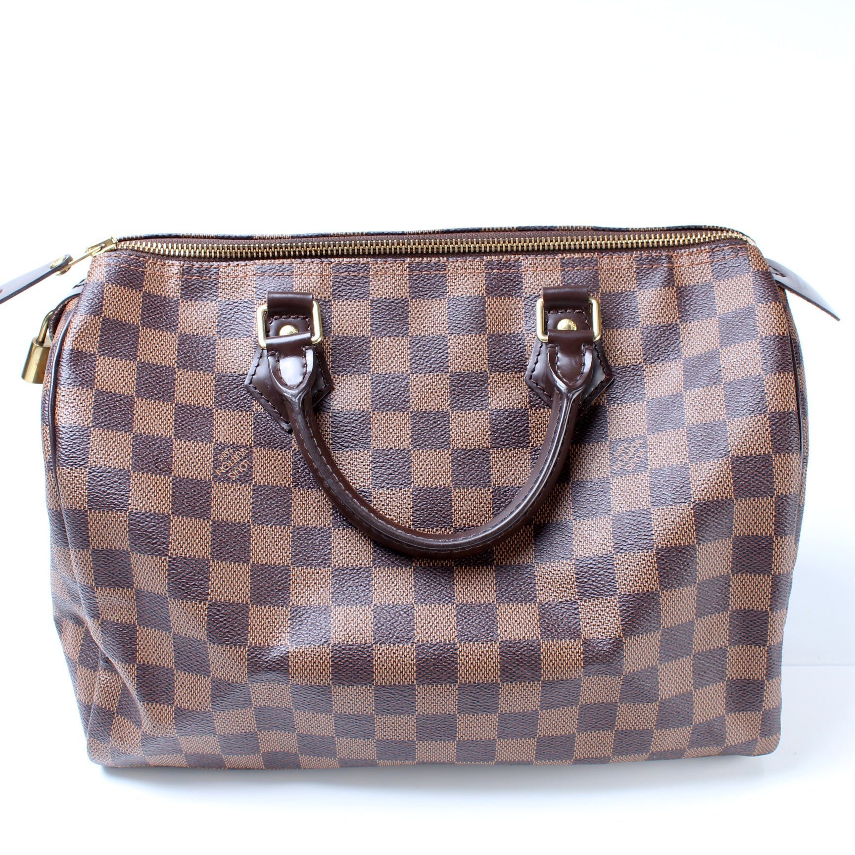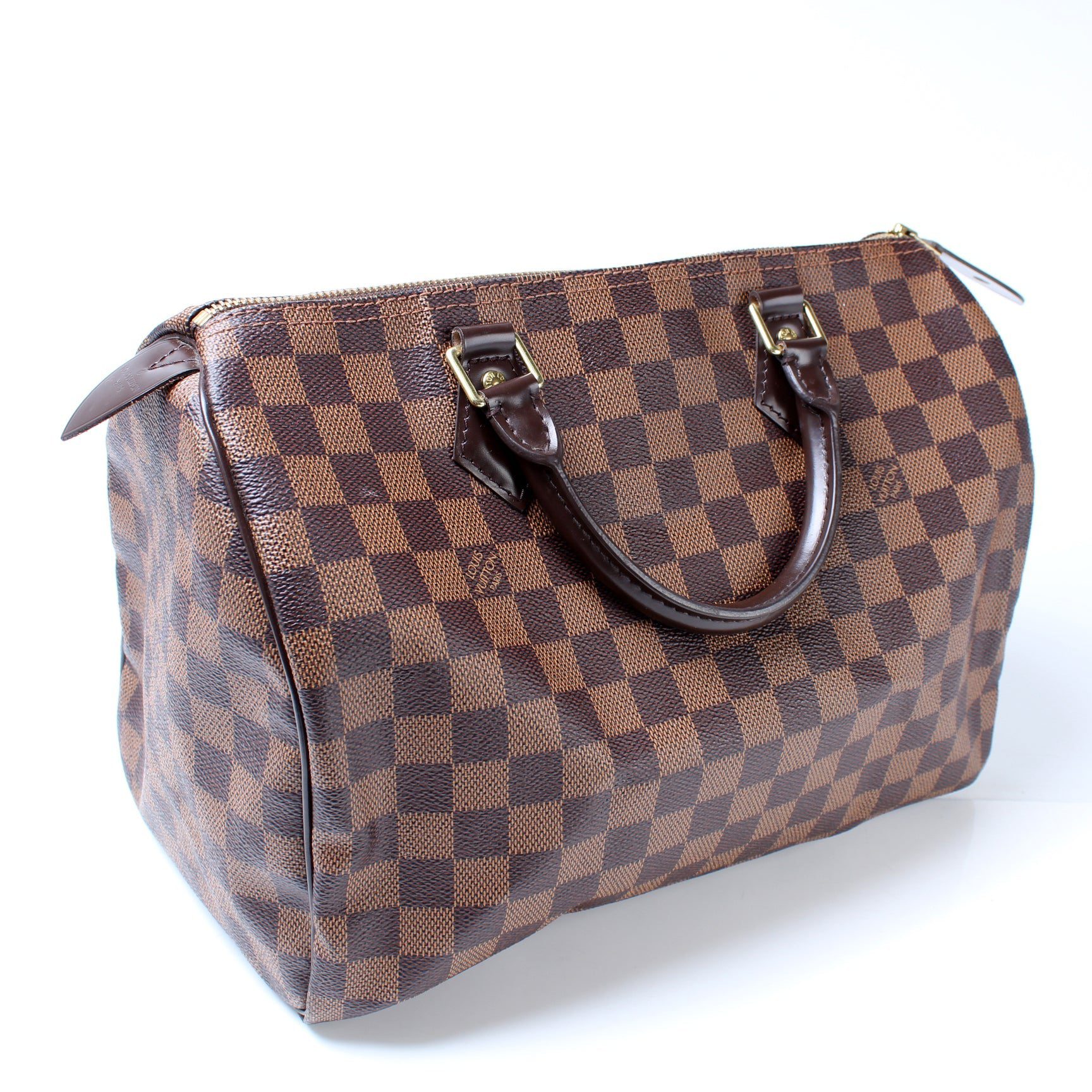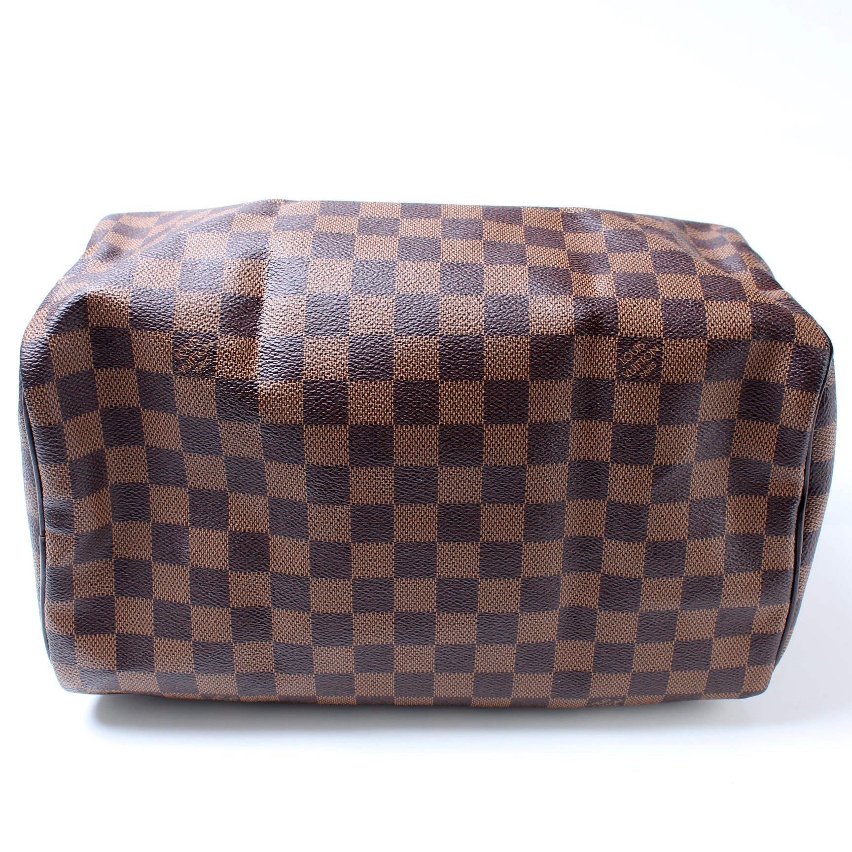 Louis Vuitton Speedy 30. The exterior is in the classic Damier Ebene coated canvas. Â