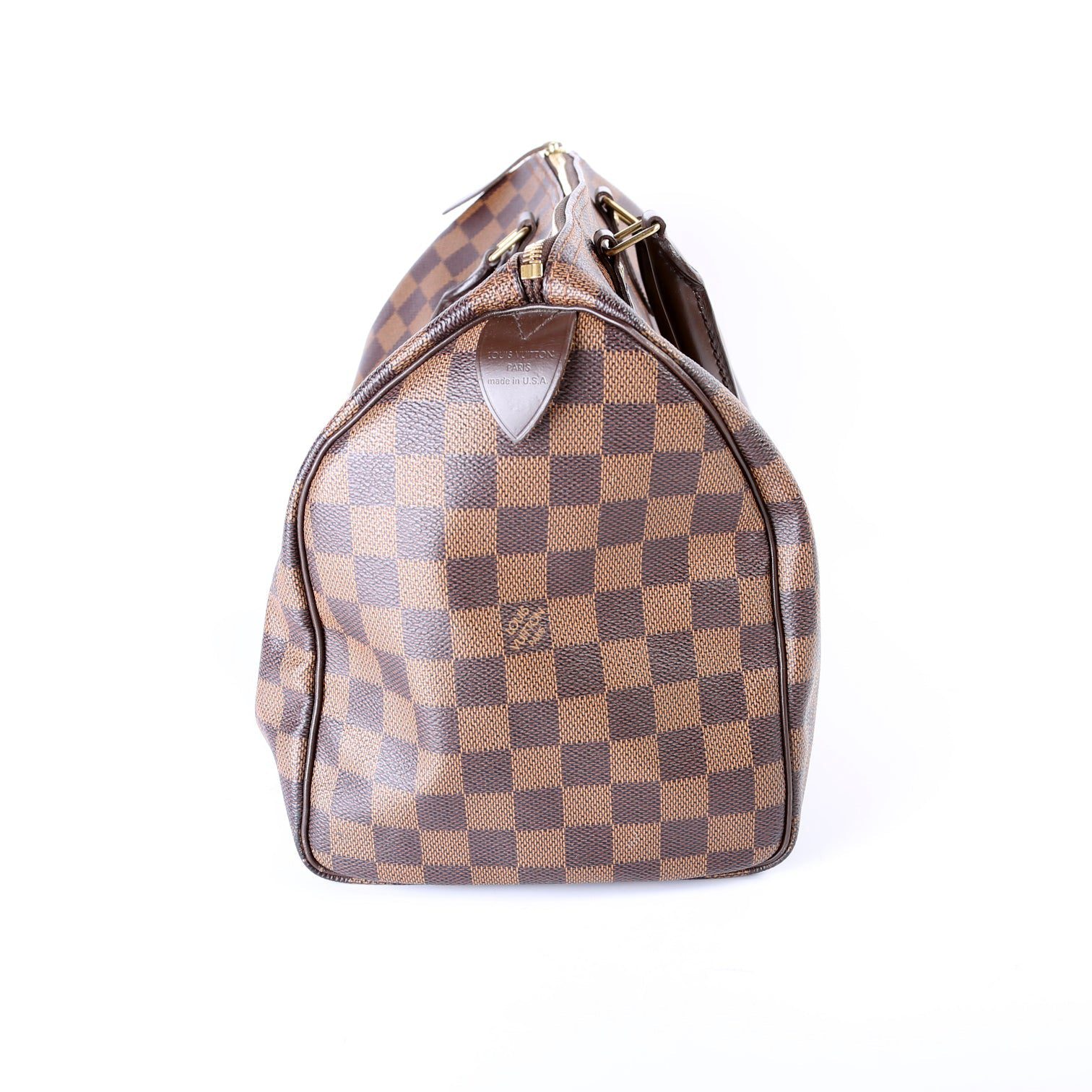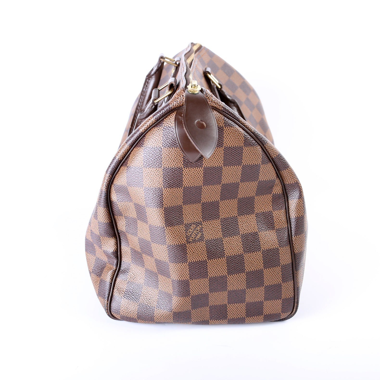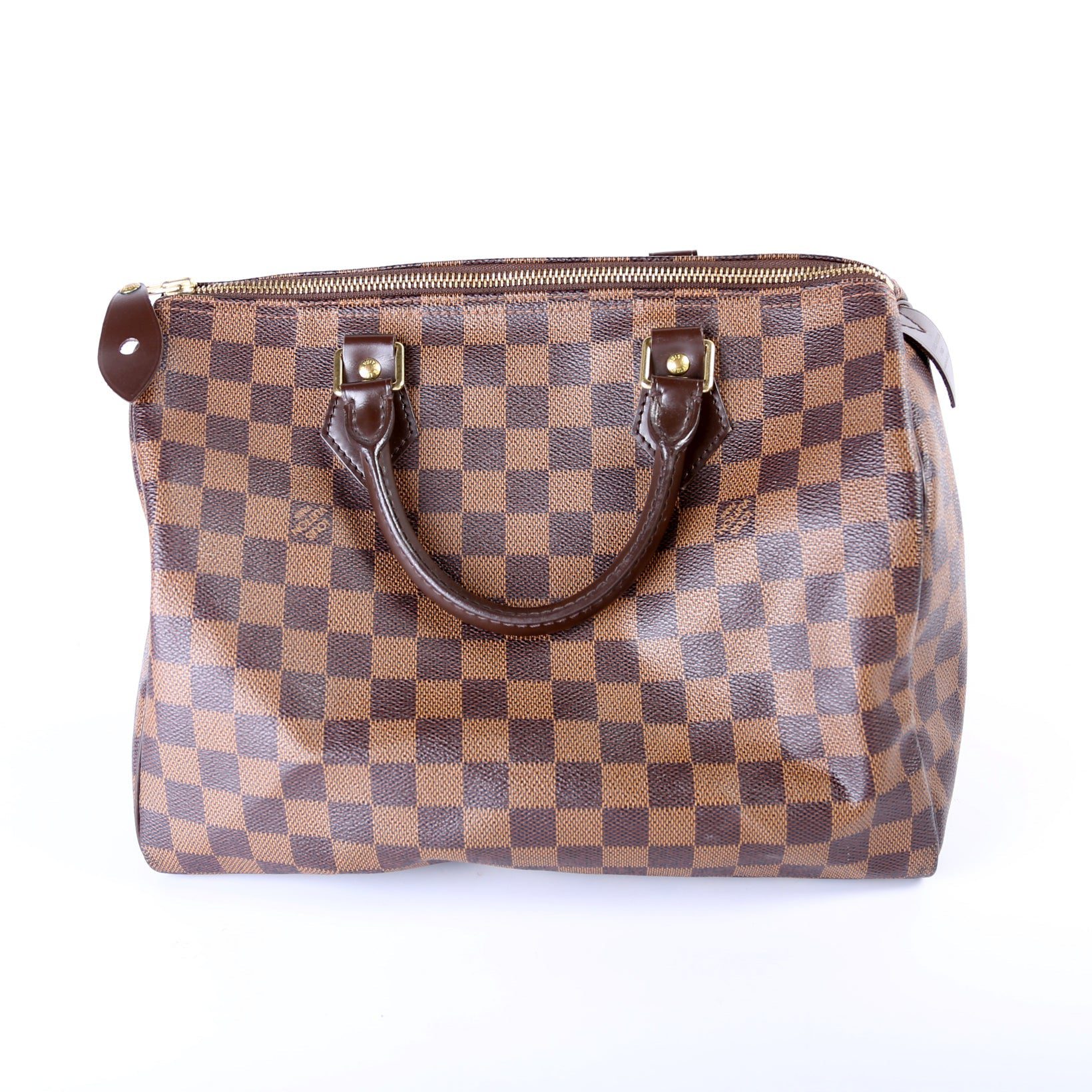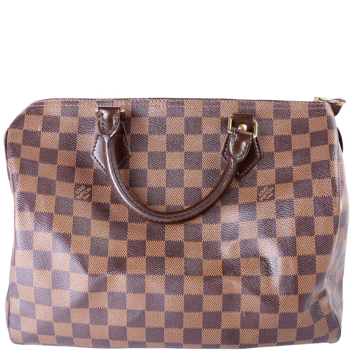 Louis Vuitton Speedy 30. The exterior is in the classic Damier Ebene coated canvas. Â