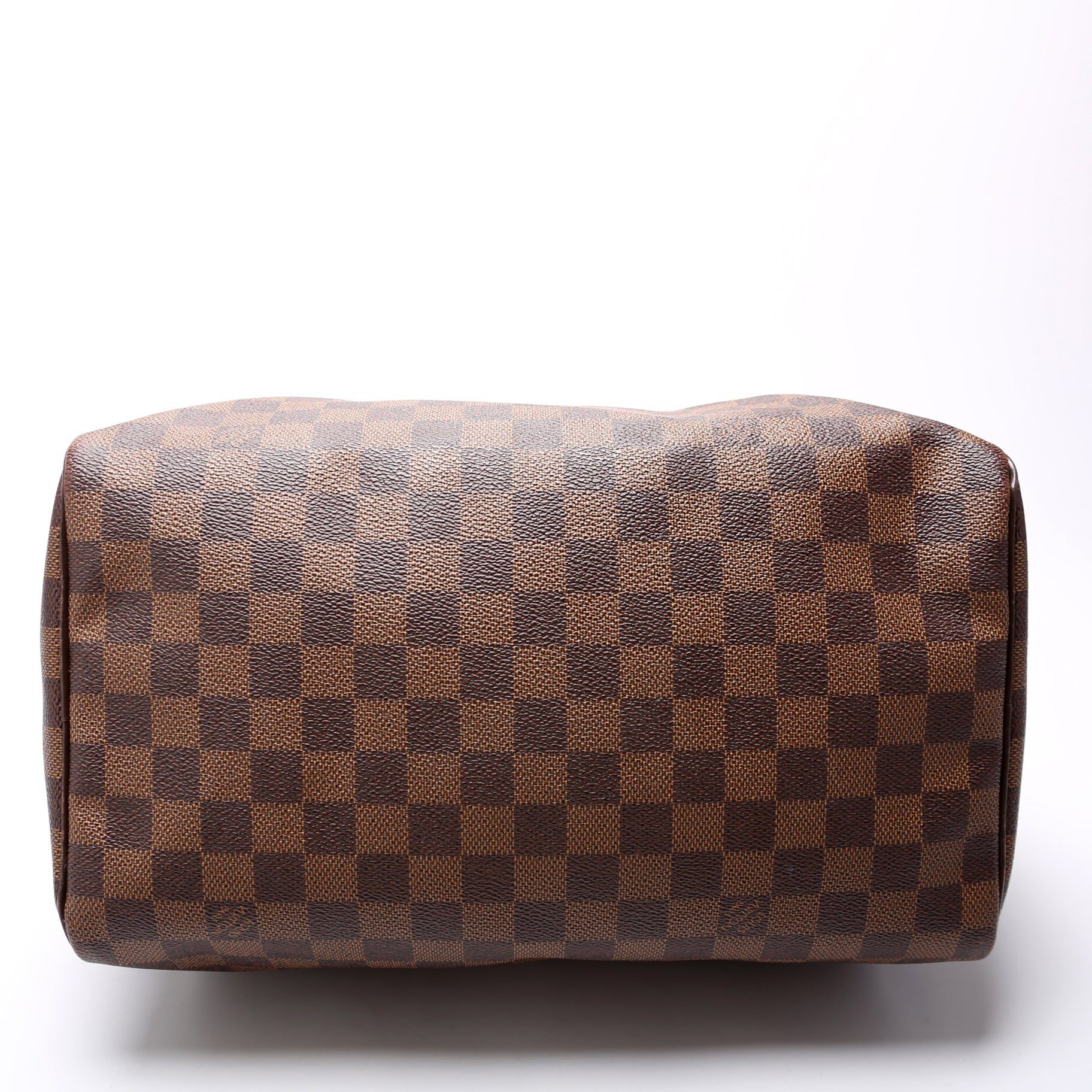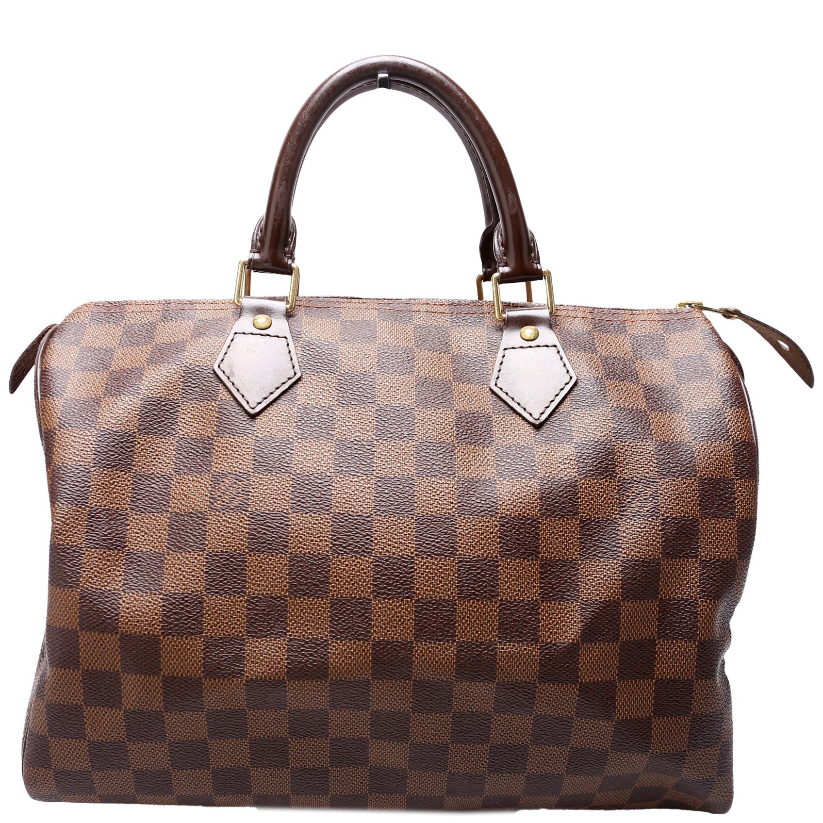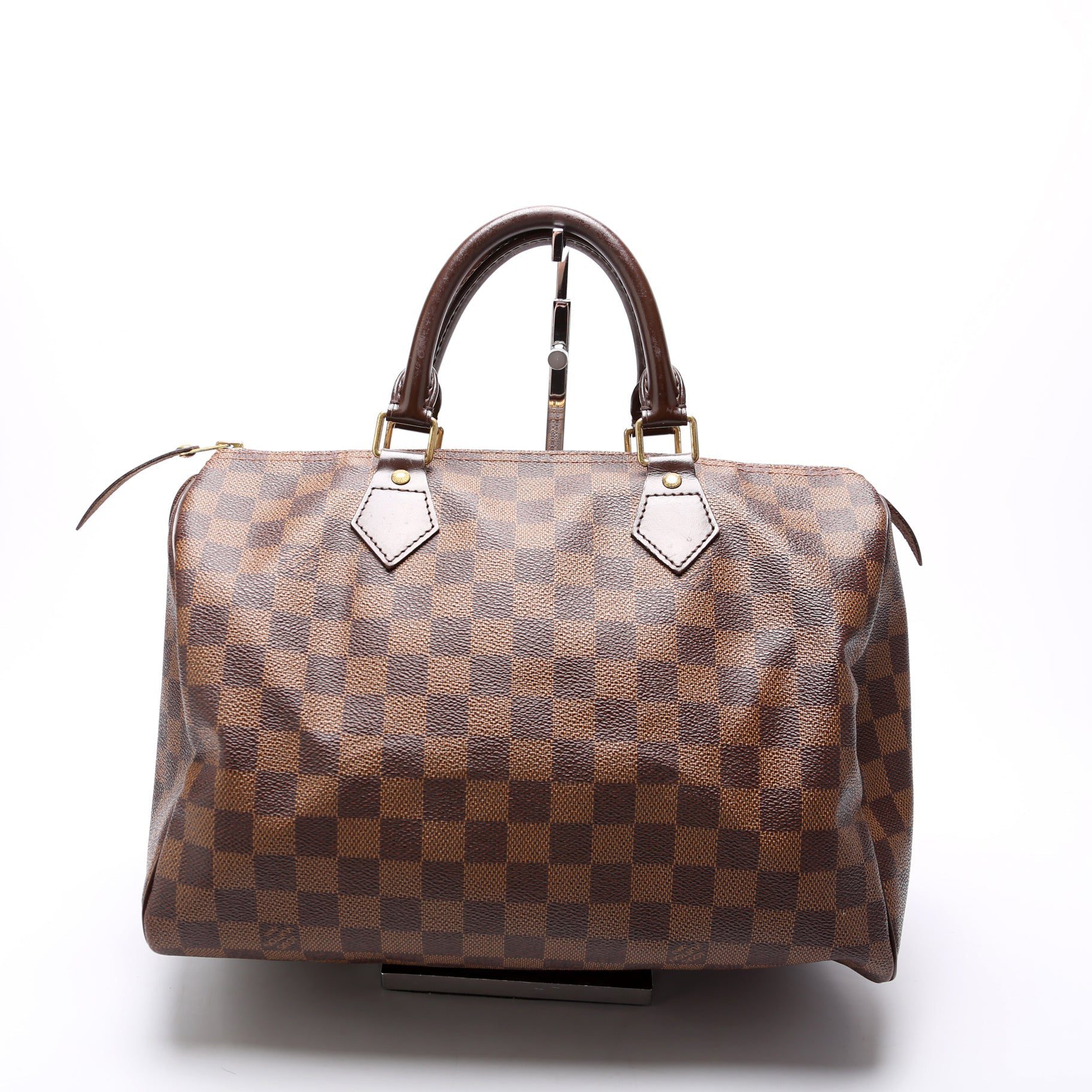 Louis Vuitton Speedy 30. The exterior is in the classic Damier Ebene coated canvas. Â