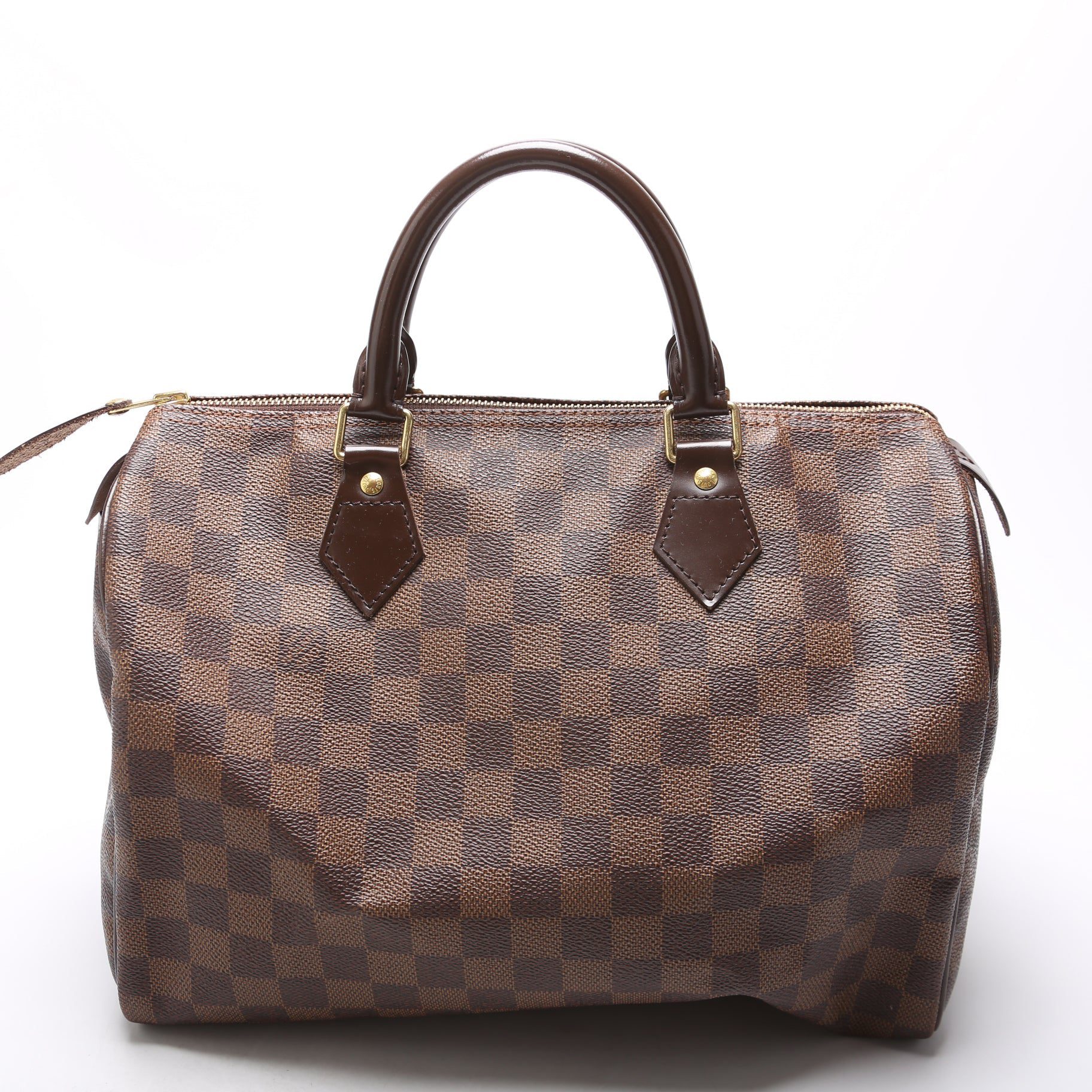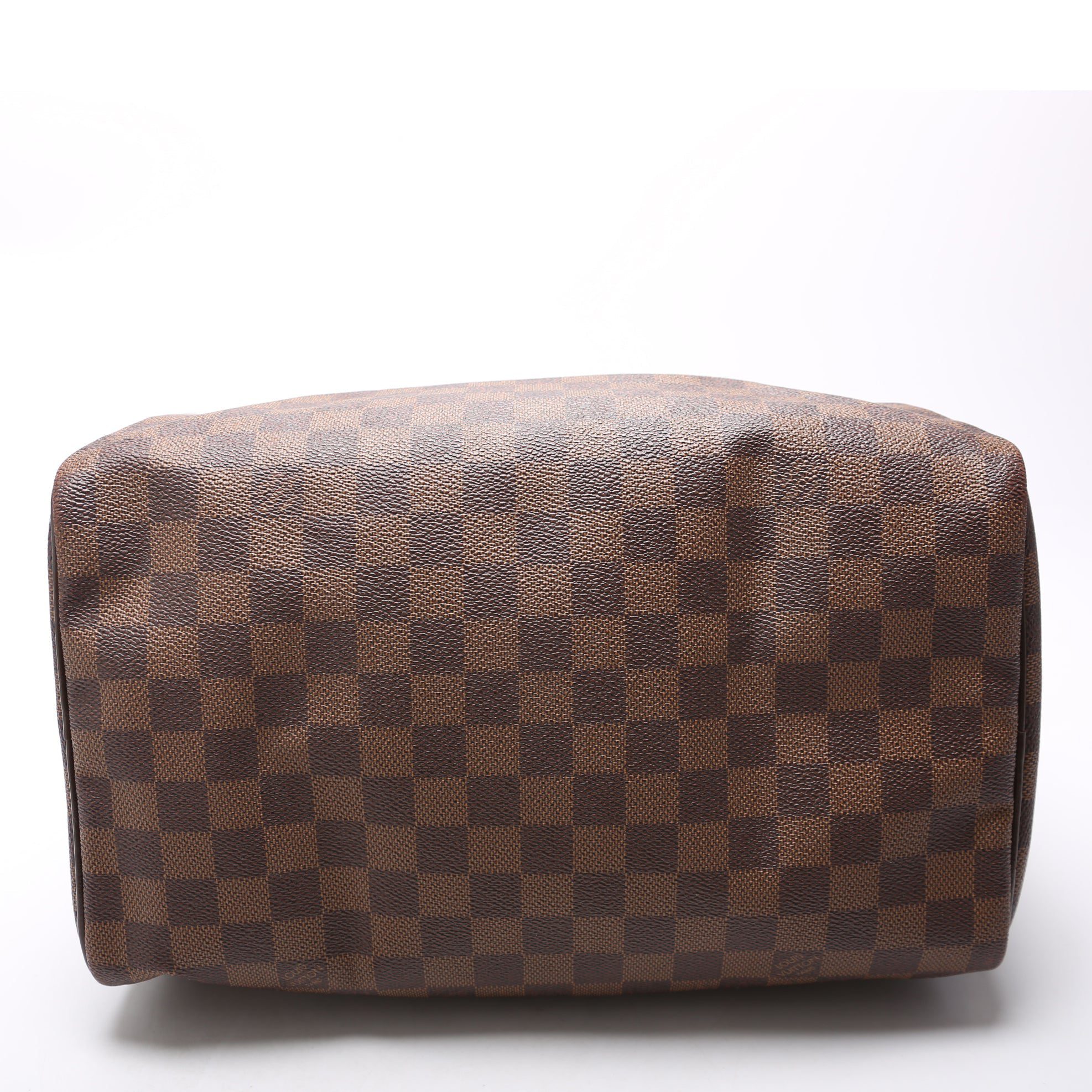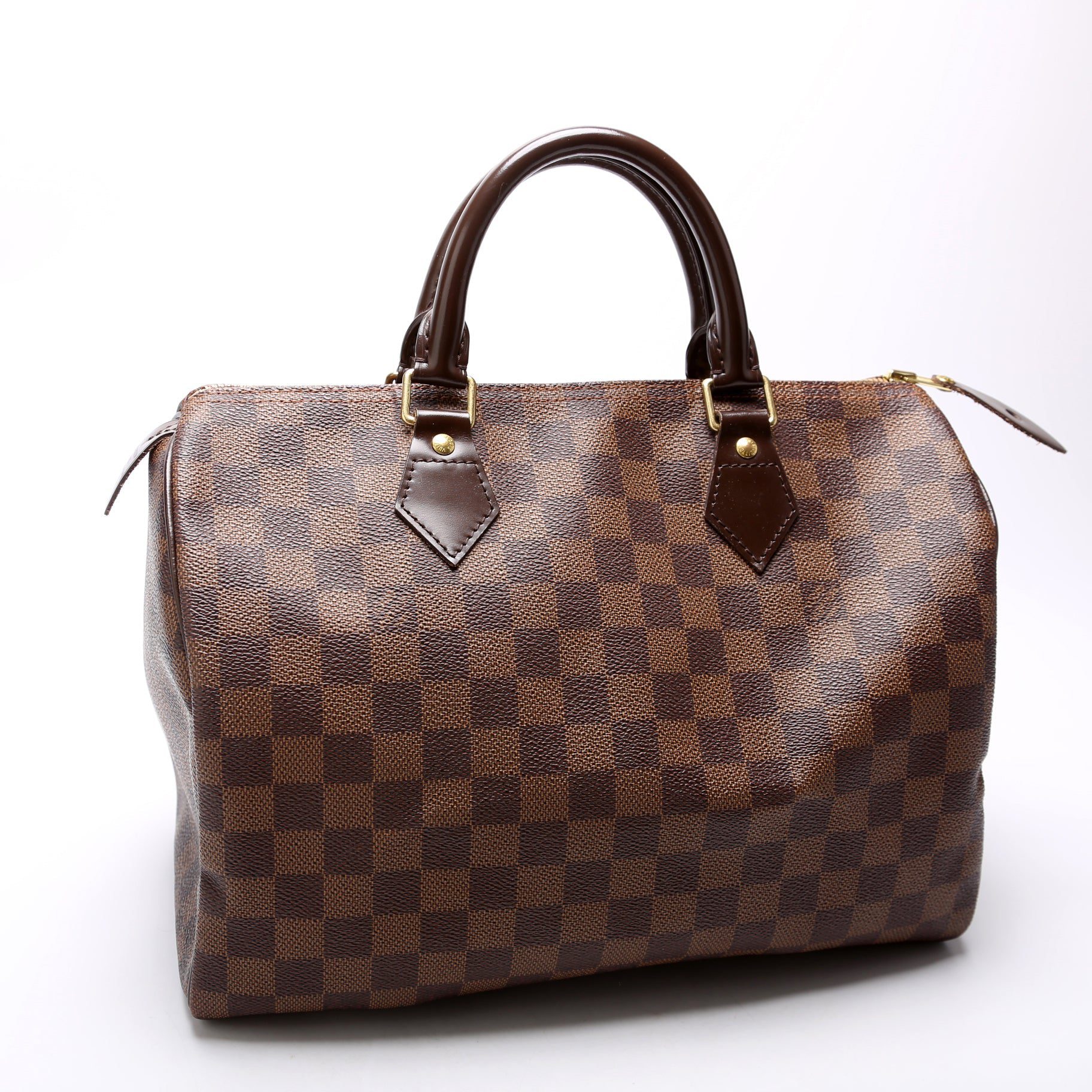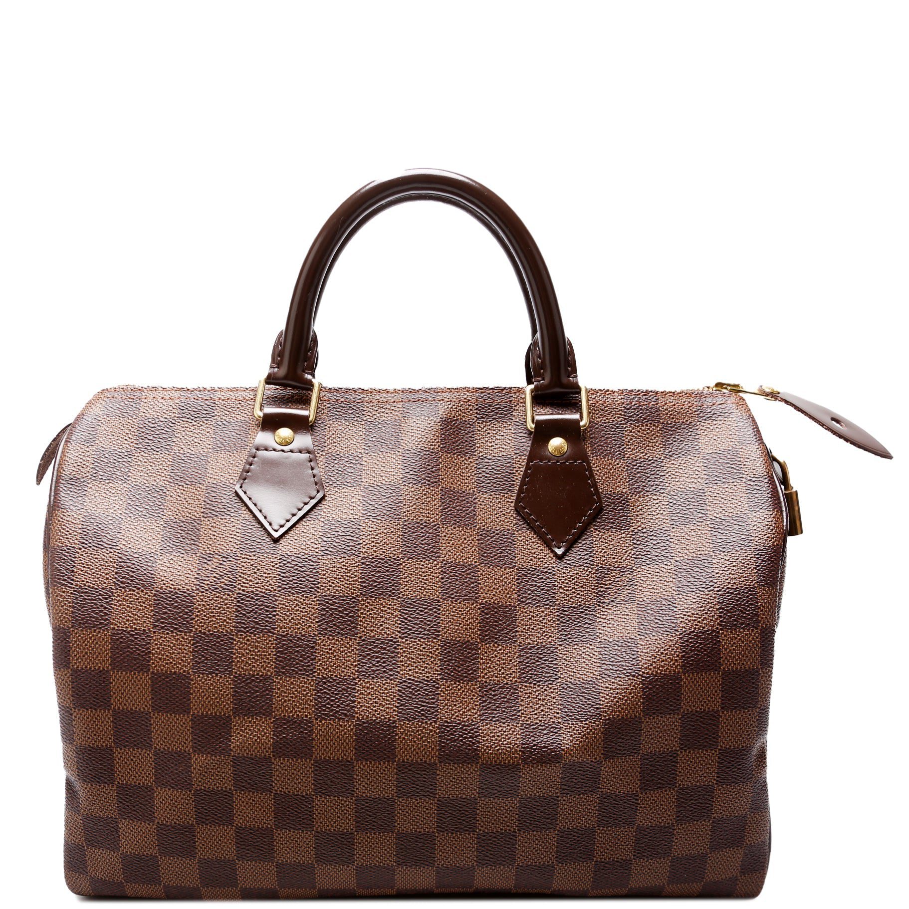 Louis Vuitton Speedy 30. The exterior is in the classic Louis Vuitton Damier Ebene coated canvas. Â