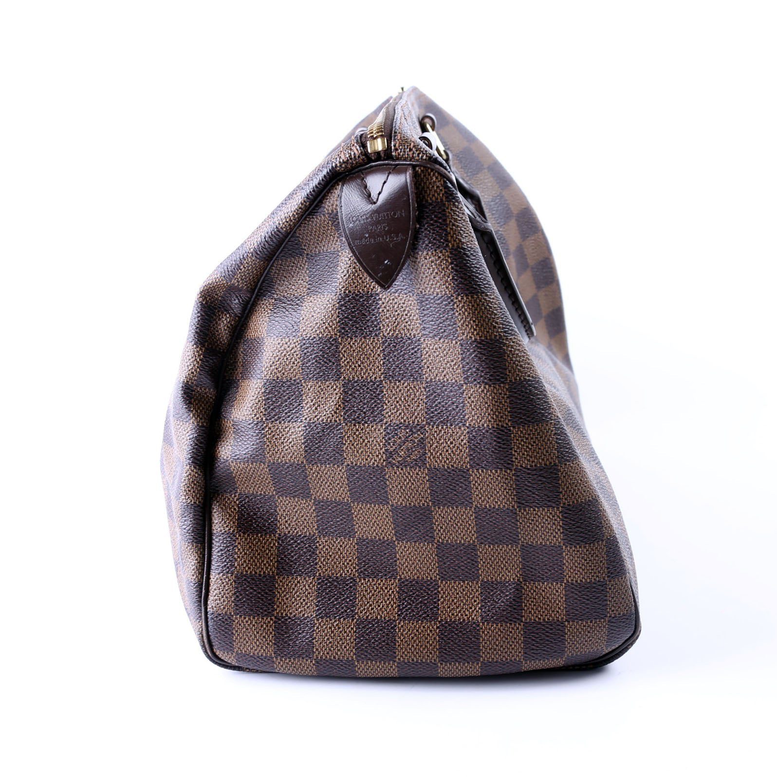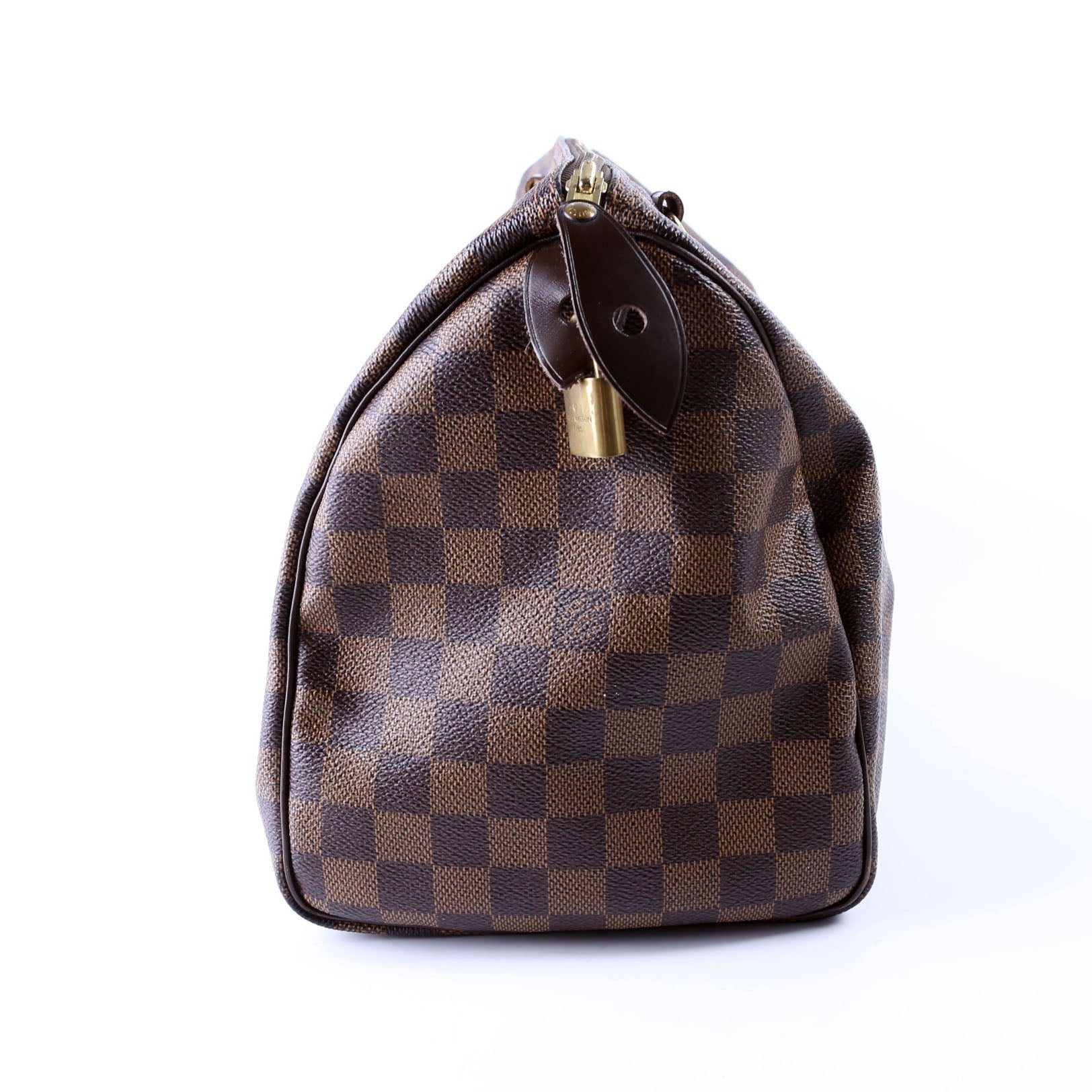 Louis Vuitton Speedy 30 . The exterior is in the classic Louis Vuitton Damier Ebene coated canvas.