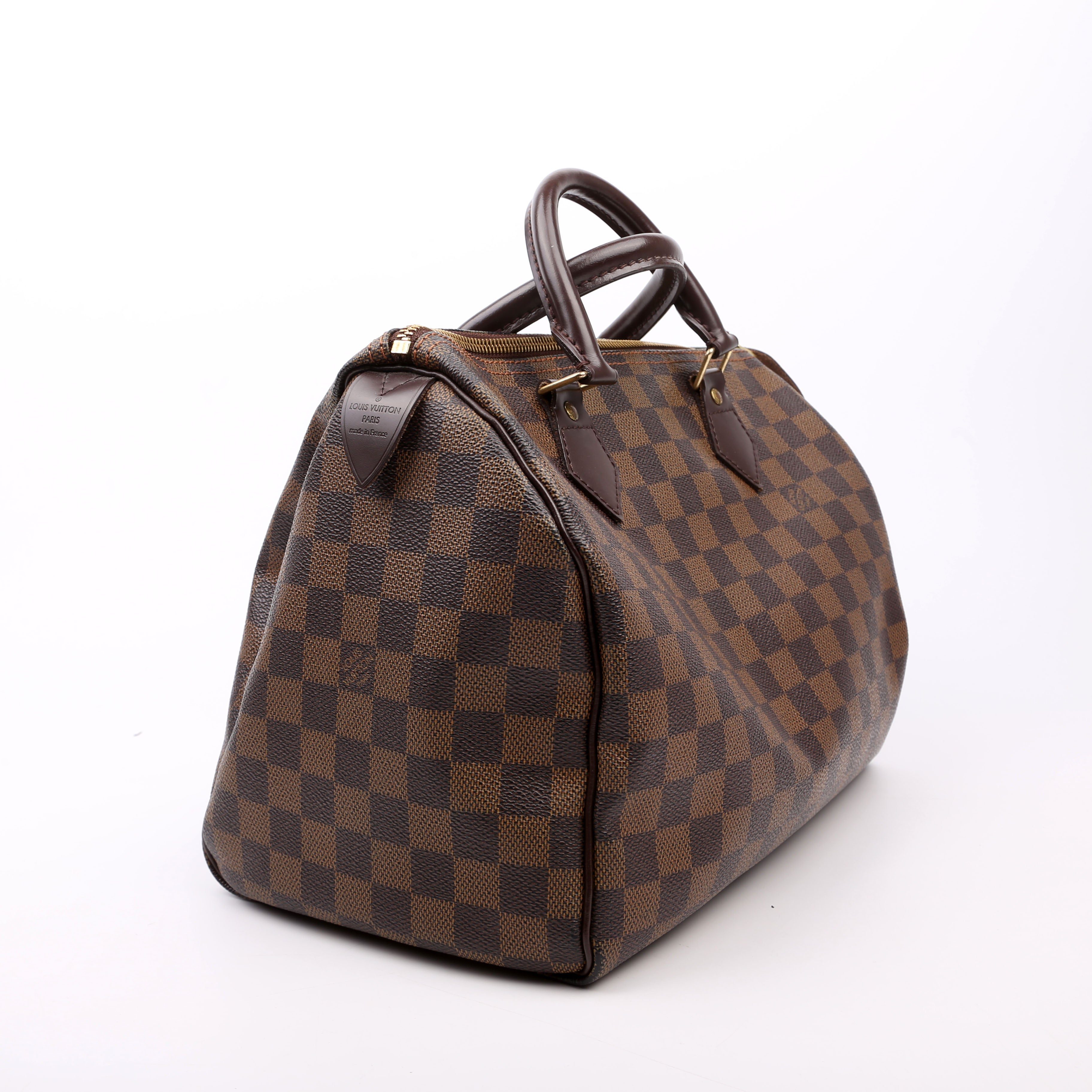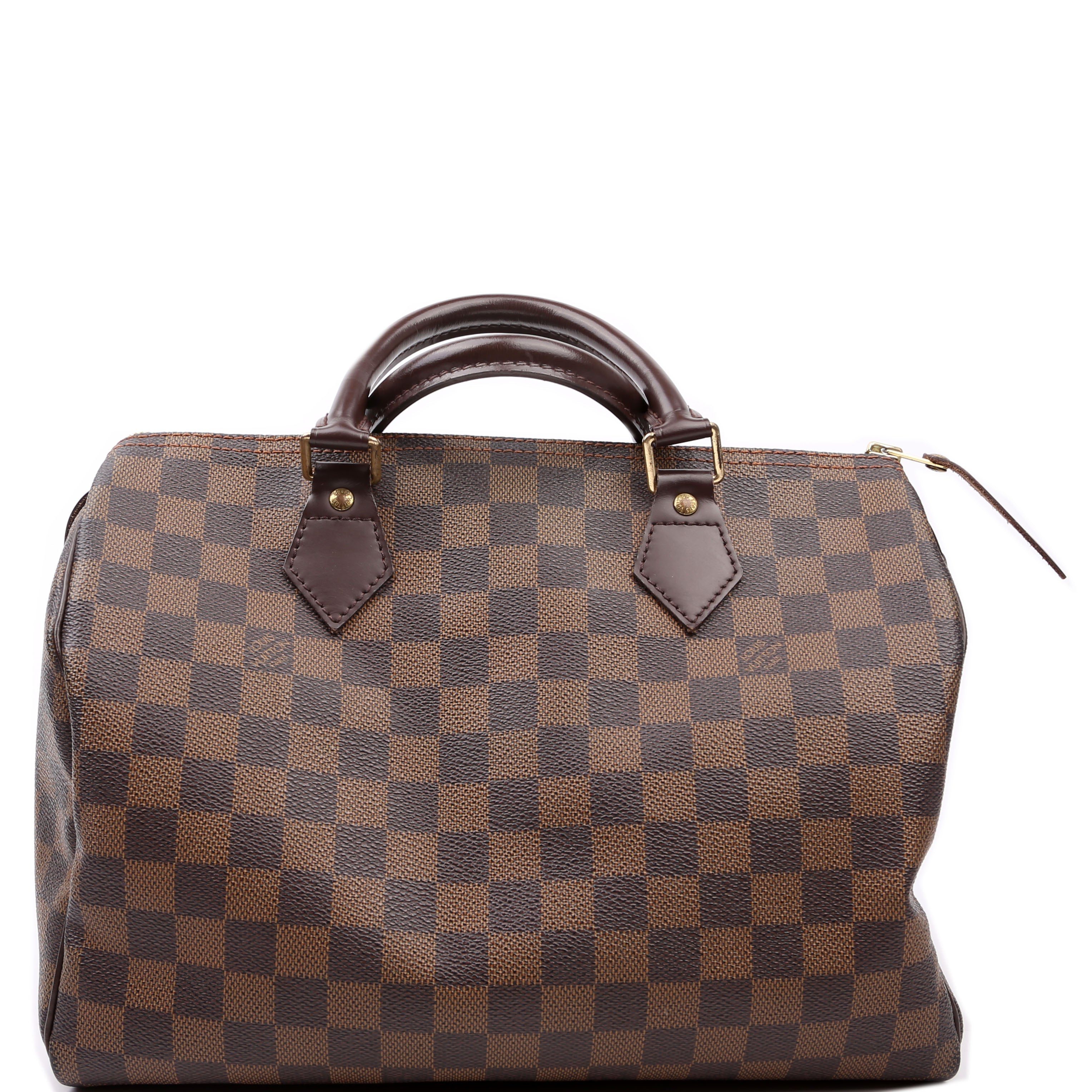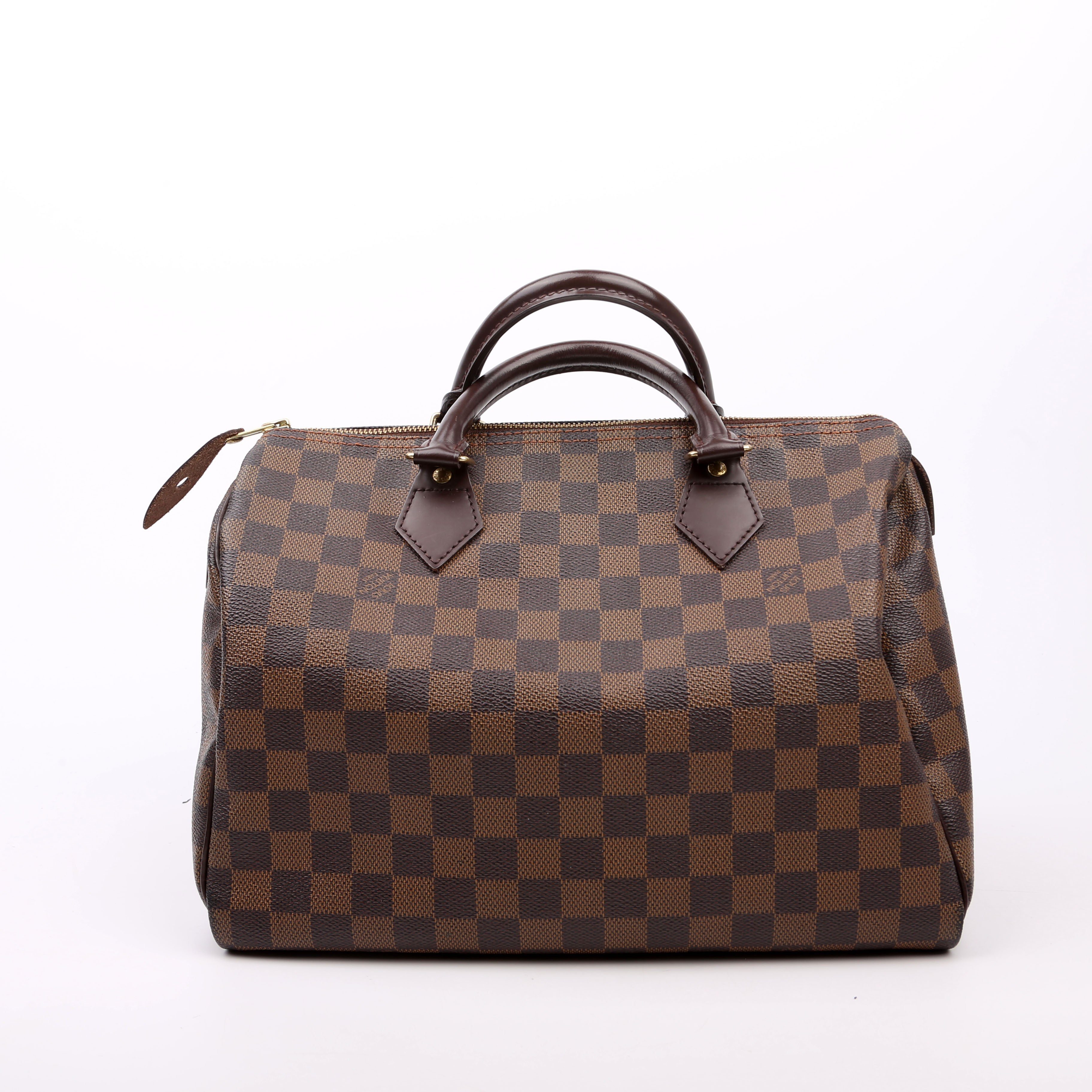 Louis Vuitton Speedy 30 . The exterior is in the classic Louis Vuitton Damier Ebene coated canvas. Â