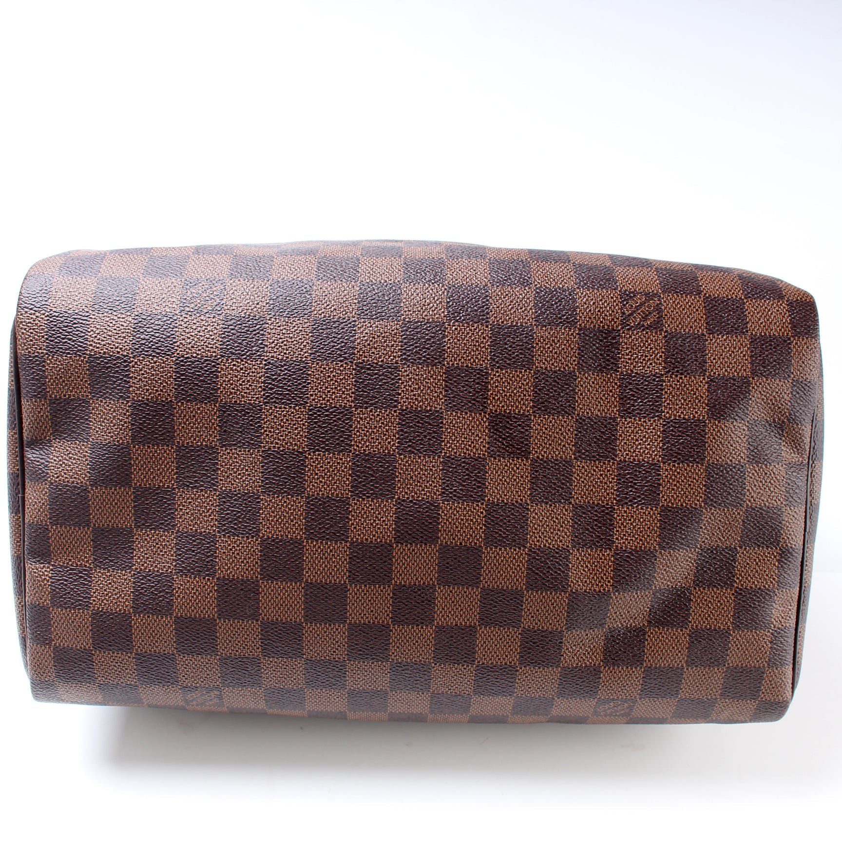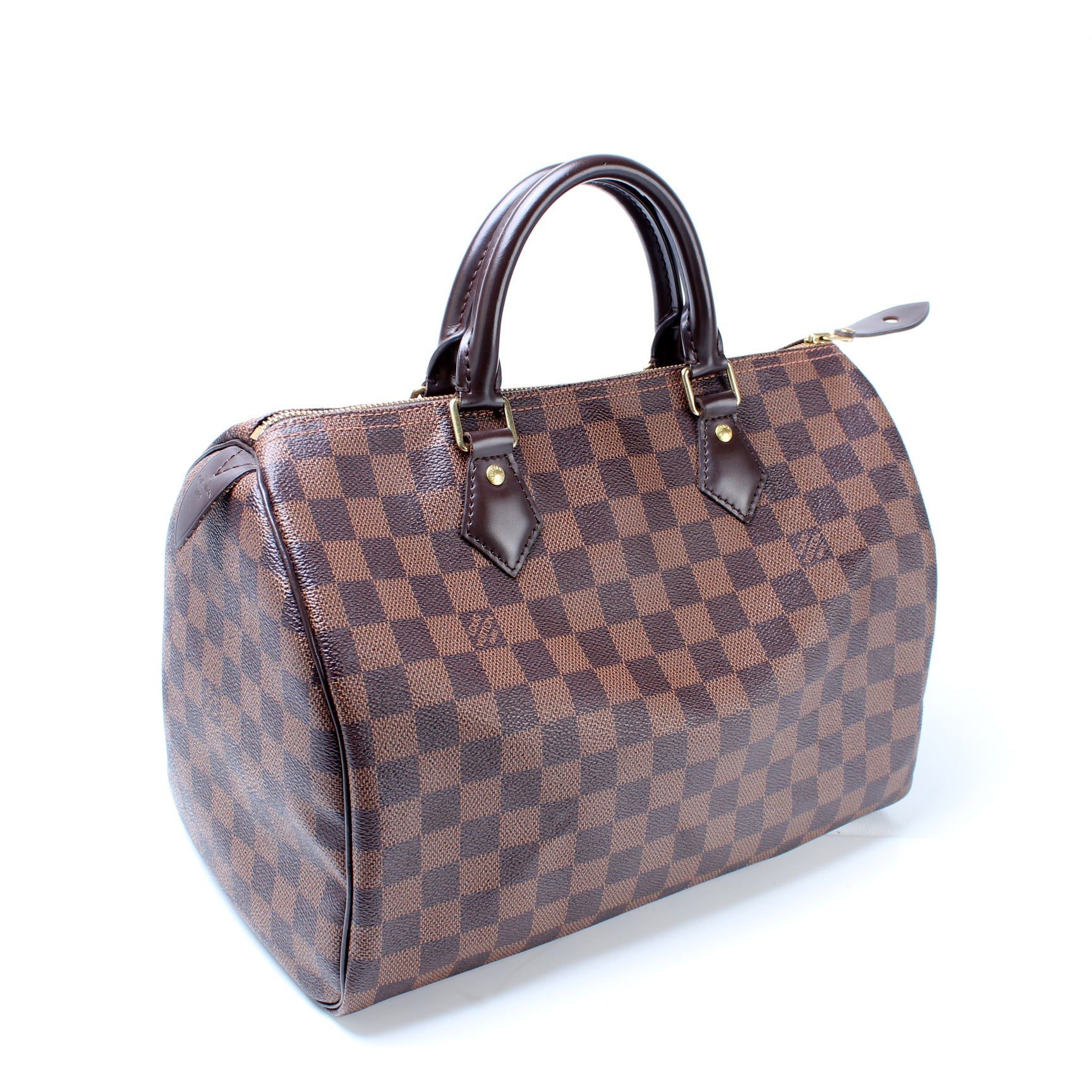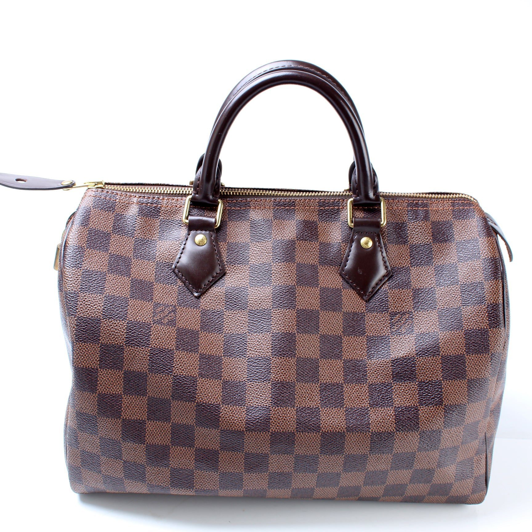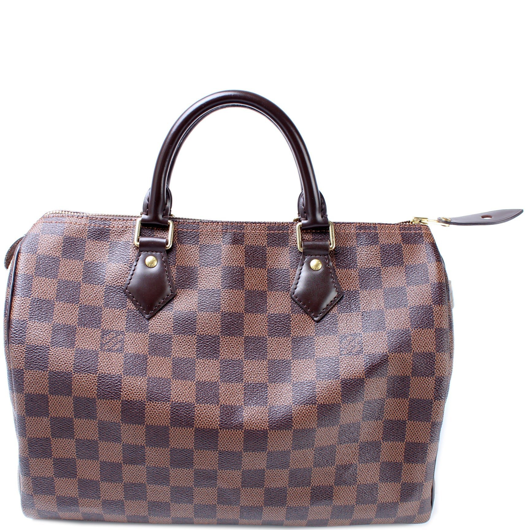 Louis Vuitton Speedy 30. The exterior is in the classic Louis Vuitton Damier Ebene coated canvas.Â