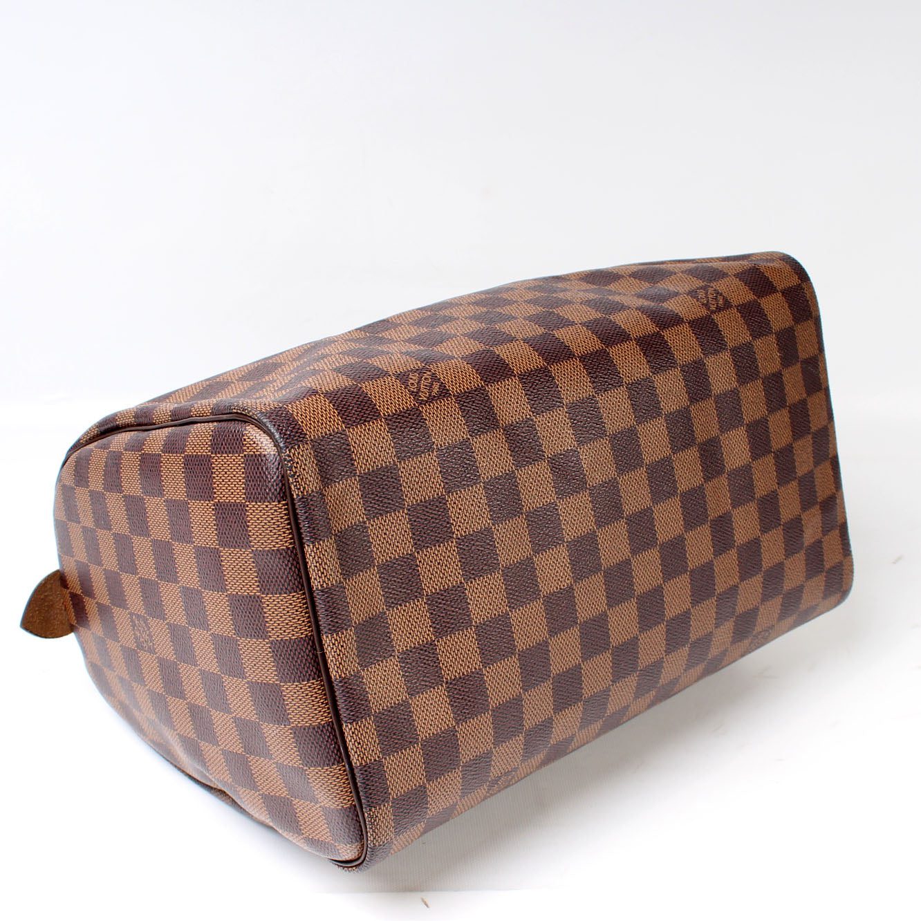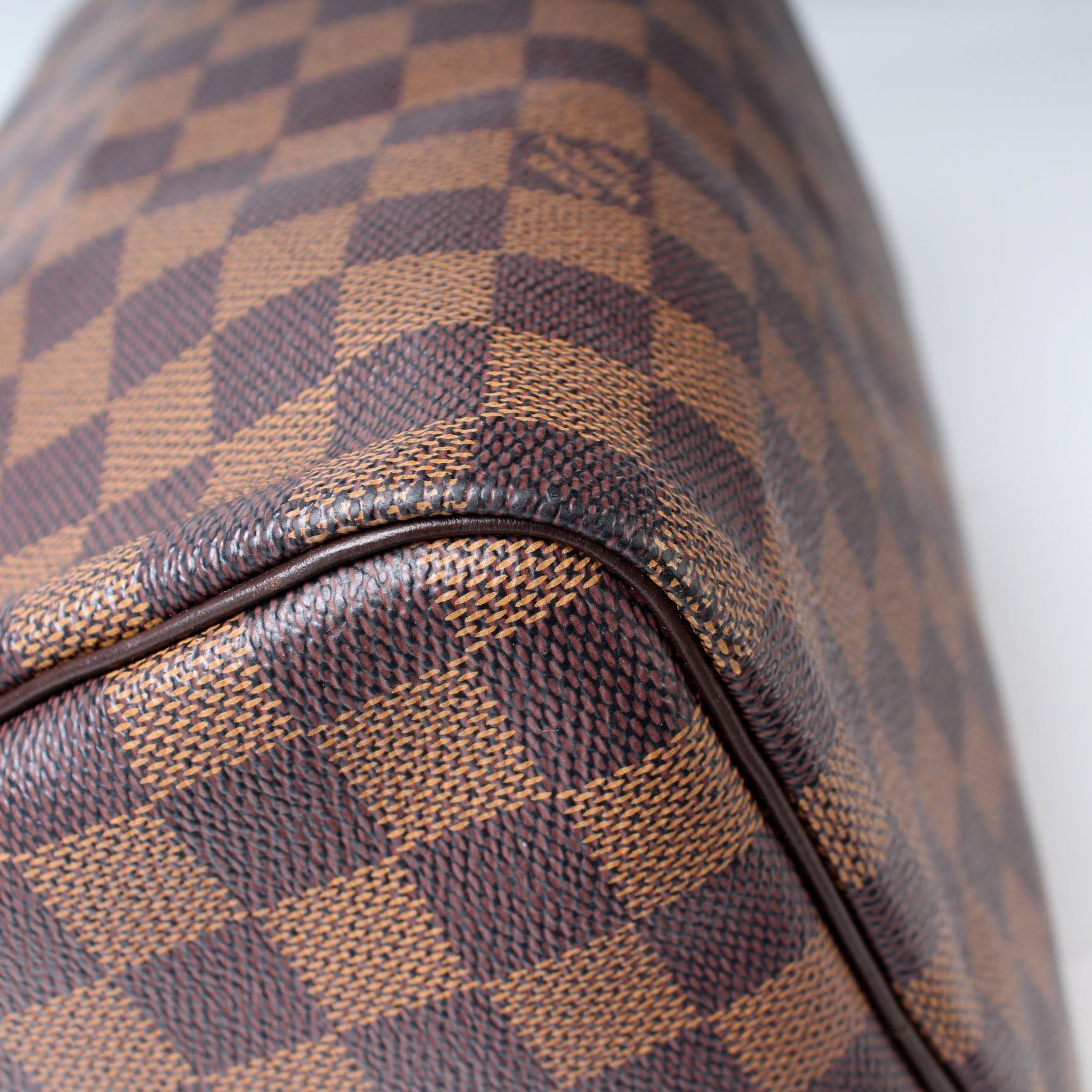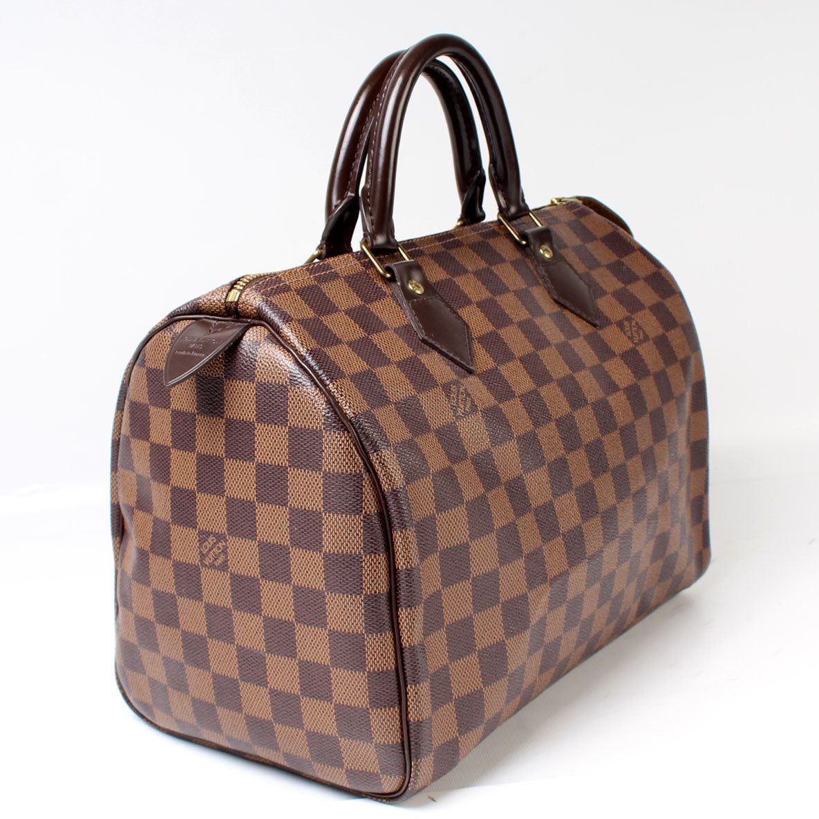 Louis Vuitton Speedy 30. The exterior is in the classic Louis Vuitton Damier Ebene coated canvas.Â