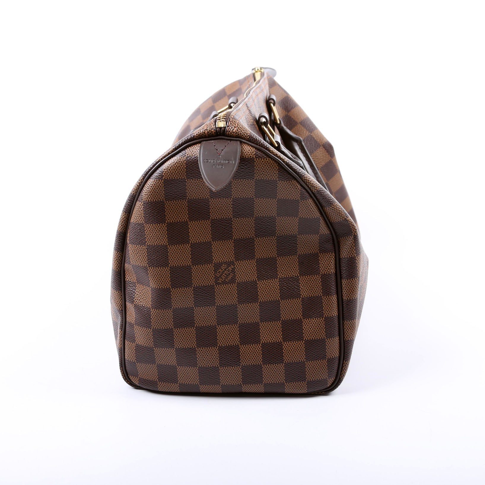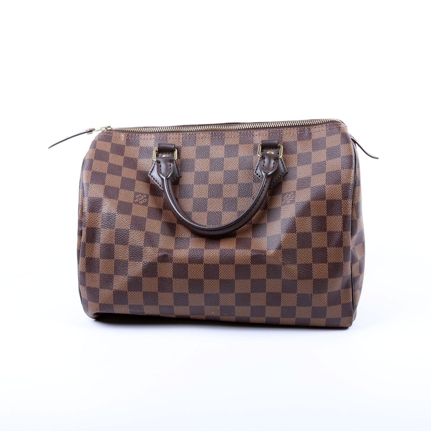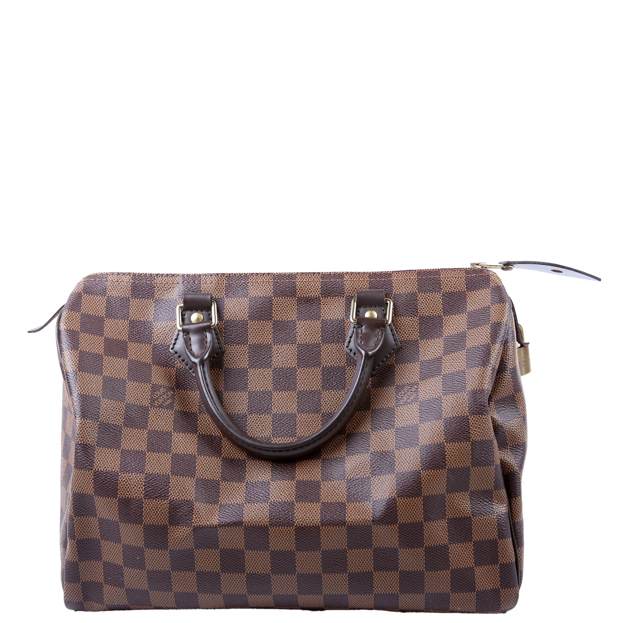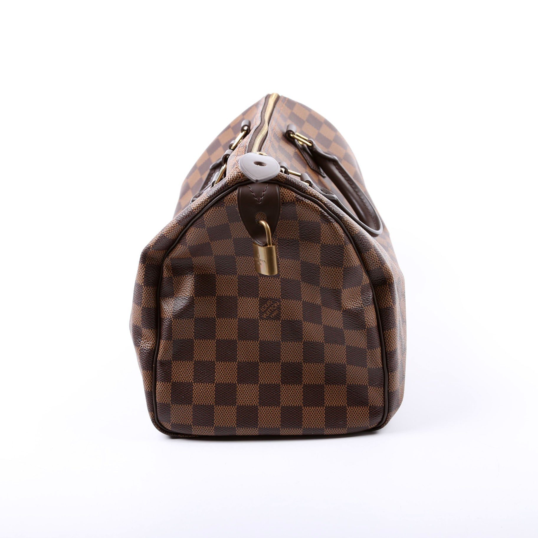 Louis Vuitton Speedy 30 . The exterior is in the classic Louis Vuitton Damier Ebene coated canvas. Â