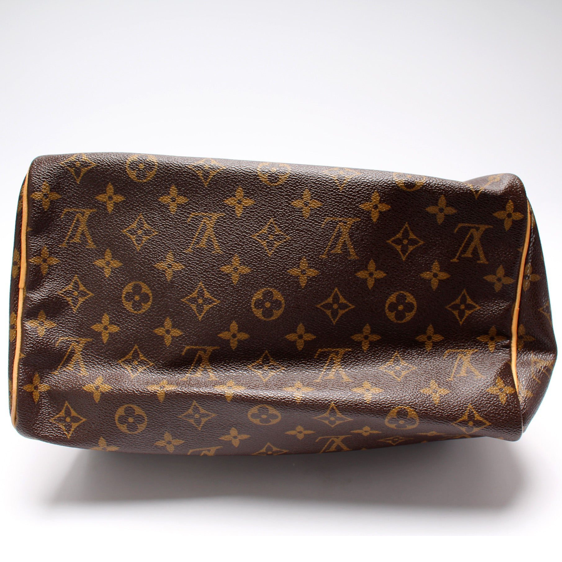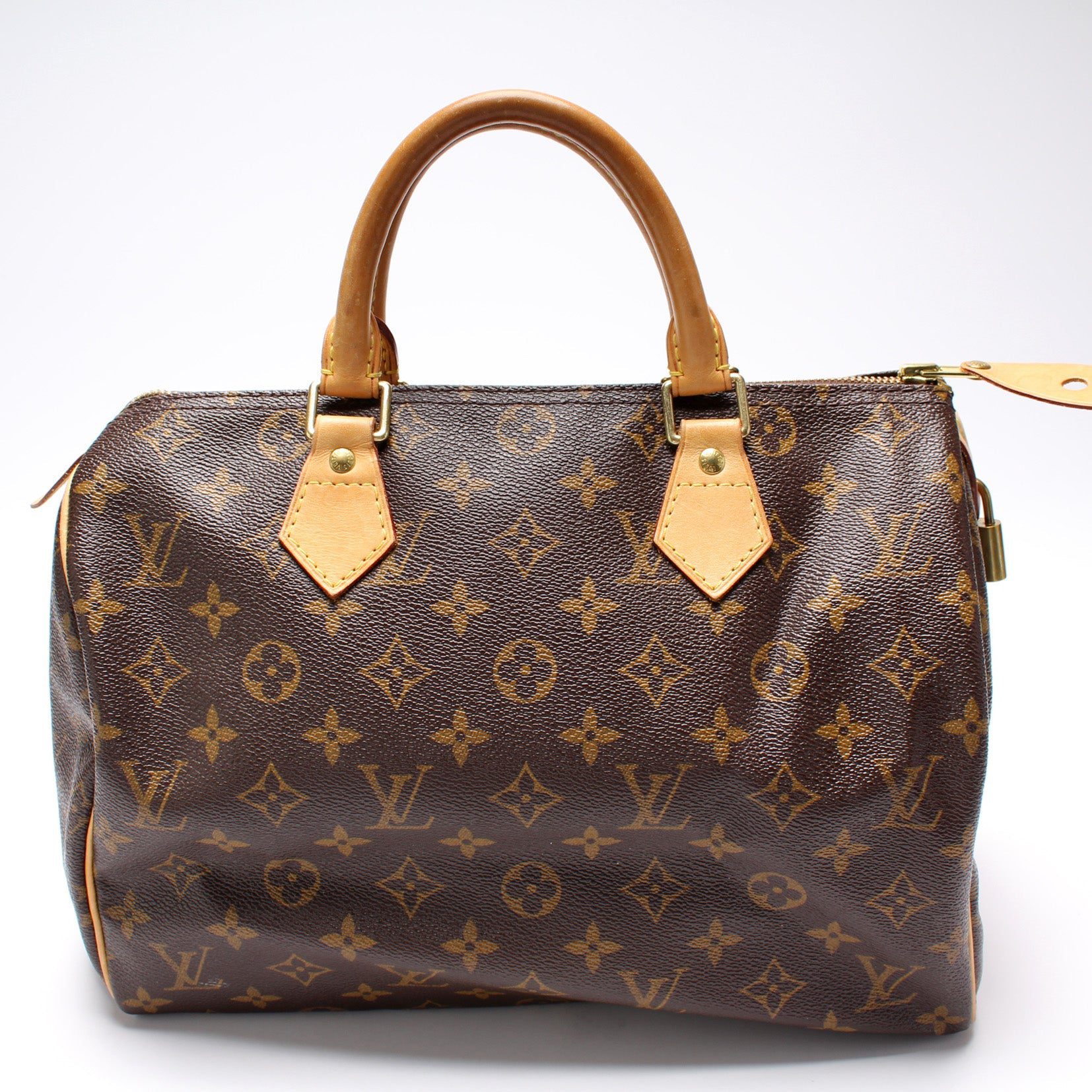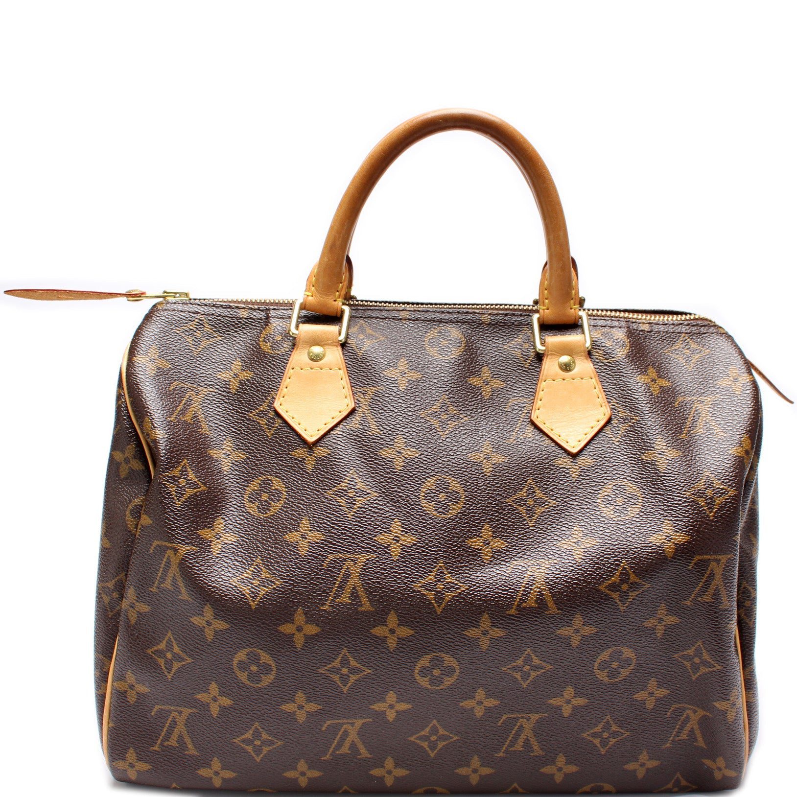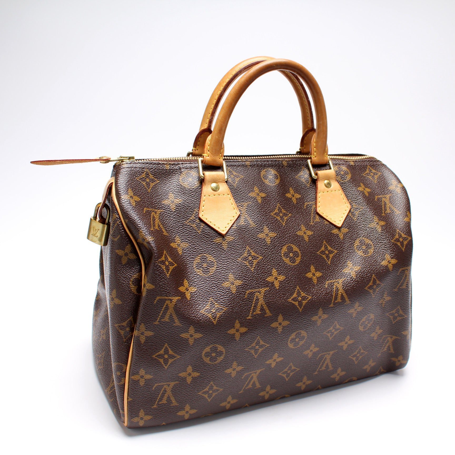 Louis Vuitton Speedy 30. The exterior is in the classic Louis Vuitton Monogram coated canvas.Â