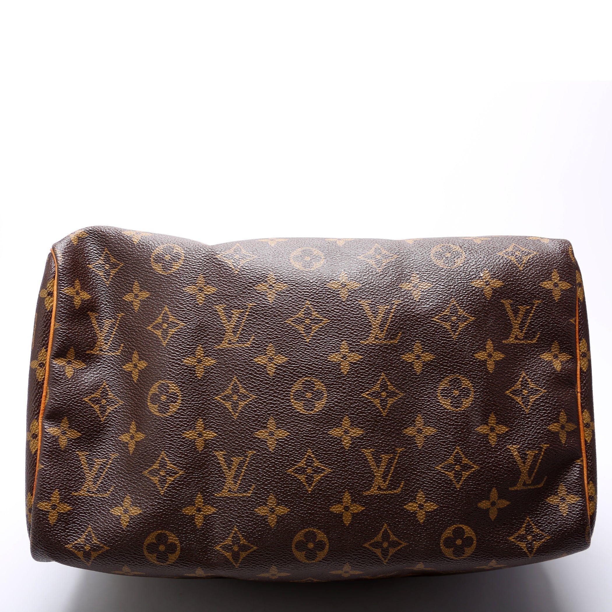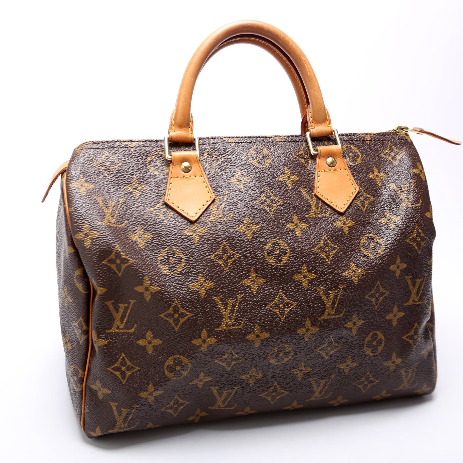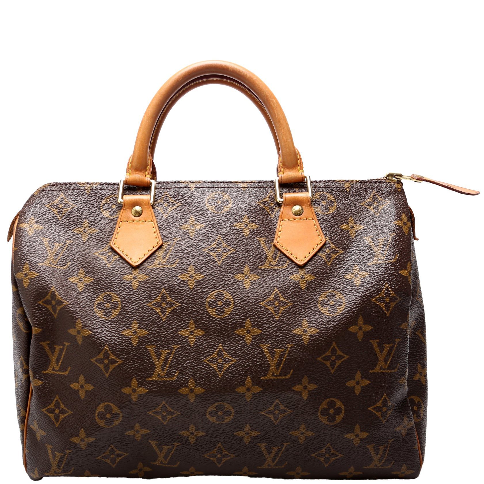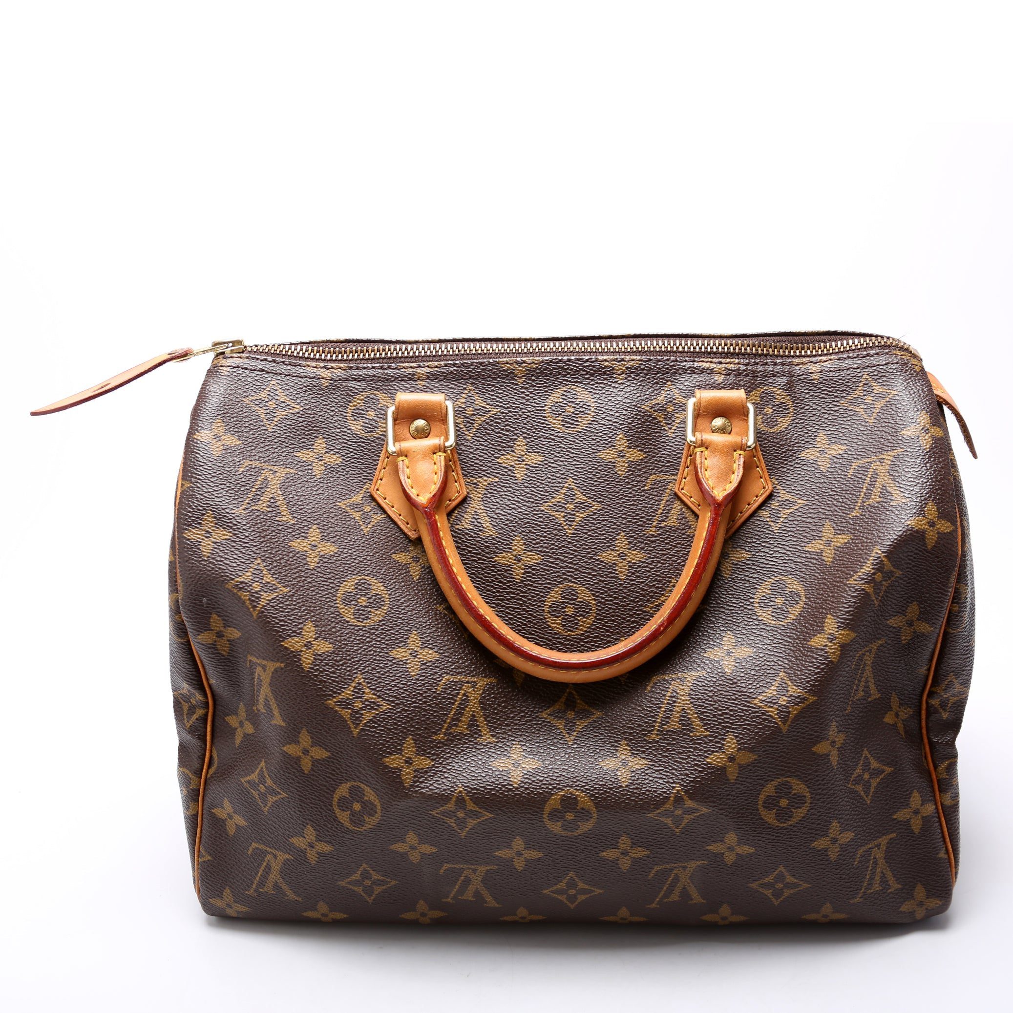 Louis Vuitton Speedy 30. The exterior is in the classic Louis Vuitton Monogram coated canvas.Â