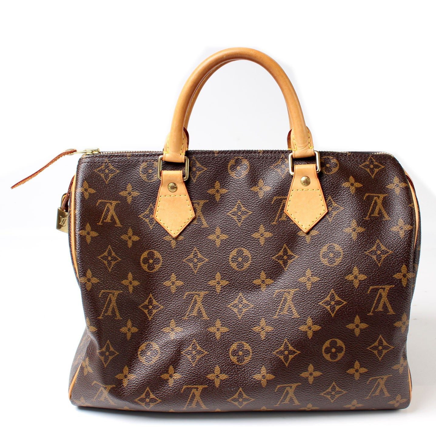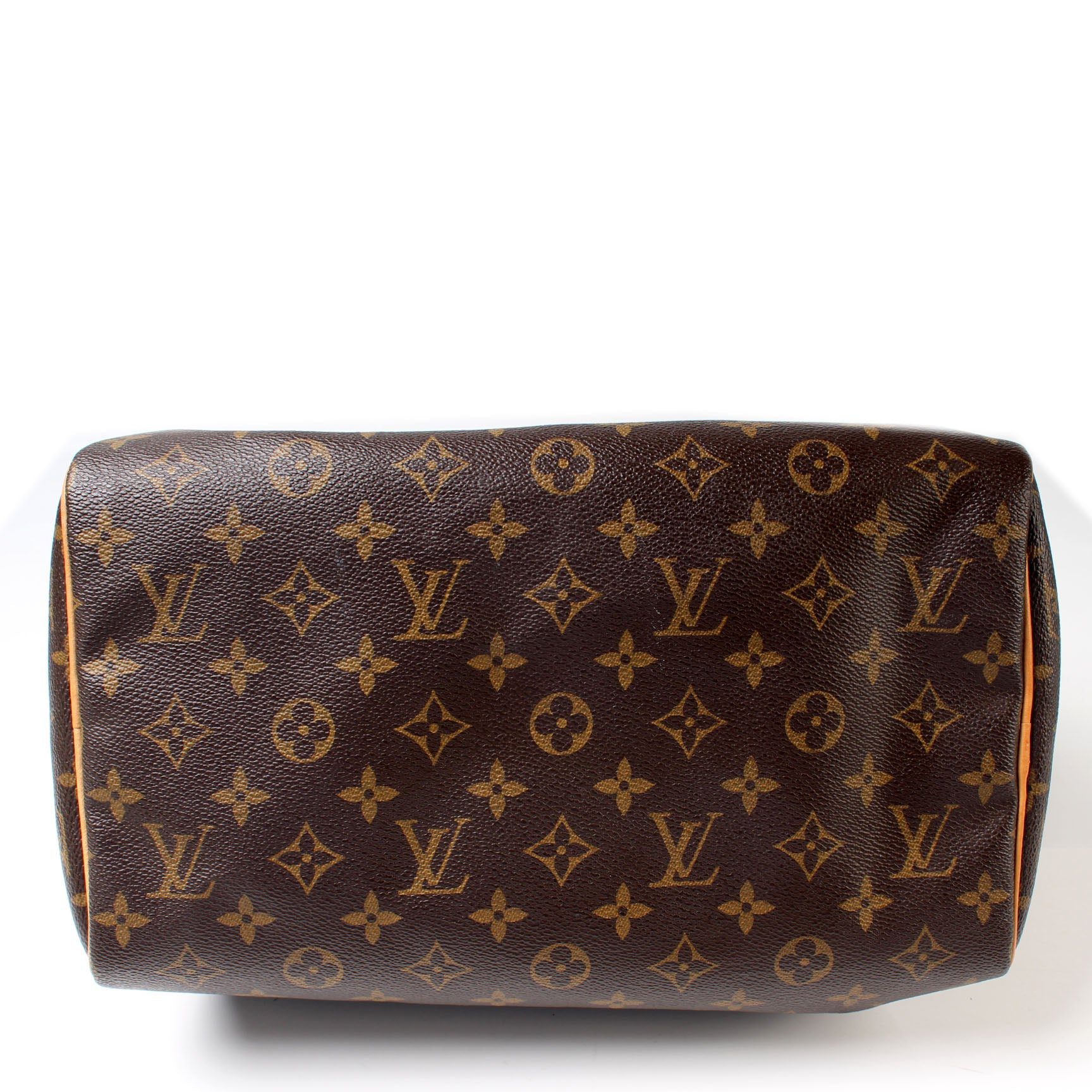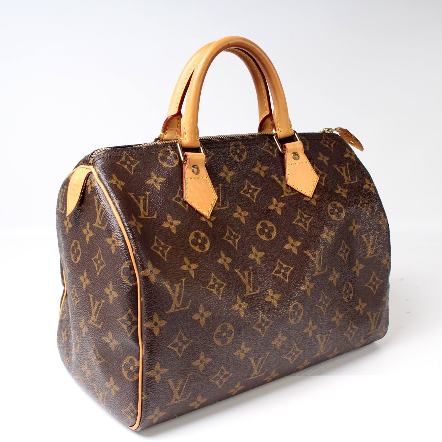 Louis Vuitton Speedy 30. The exterior is in the classic Louis Vuitton Monogram coated canvas.Â