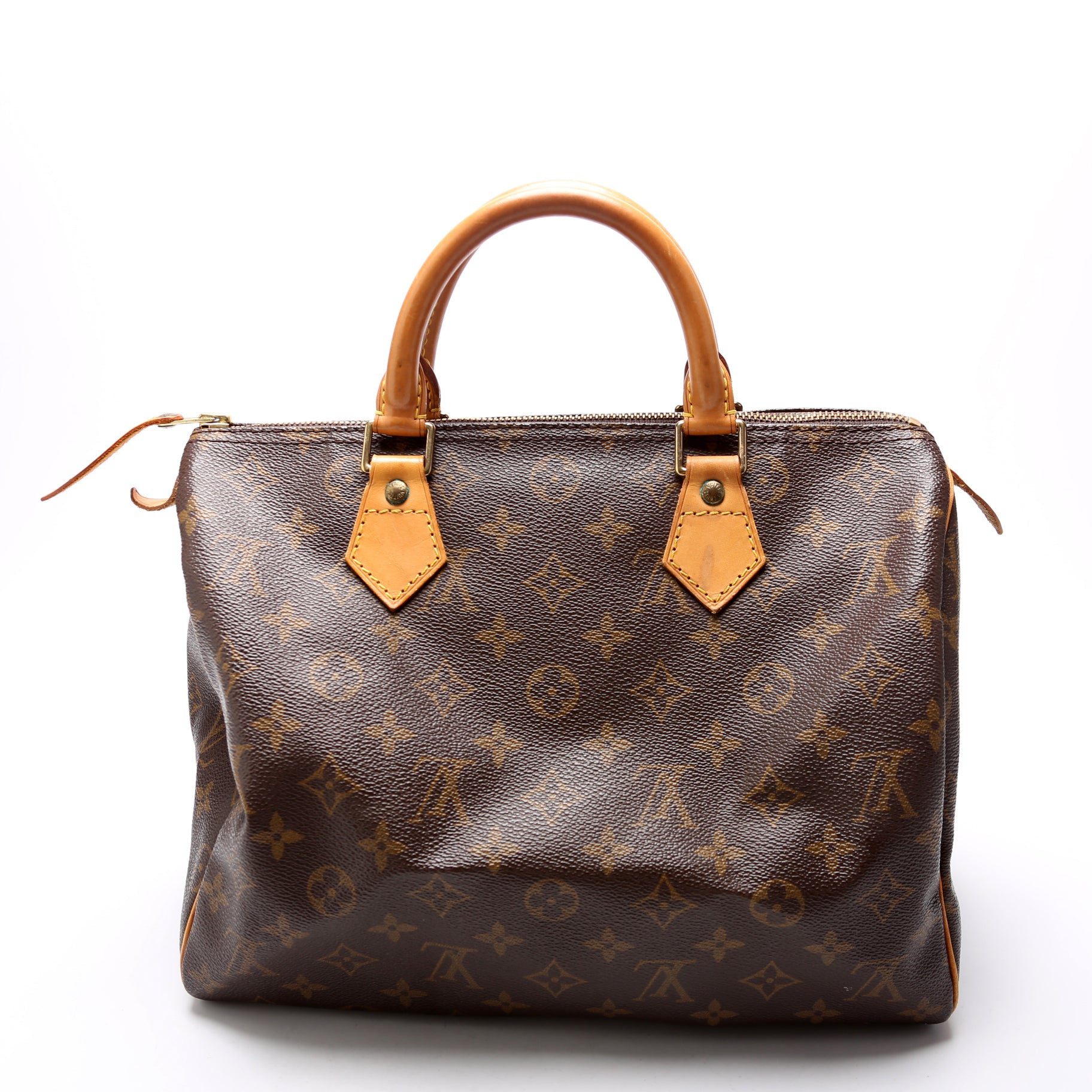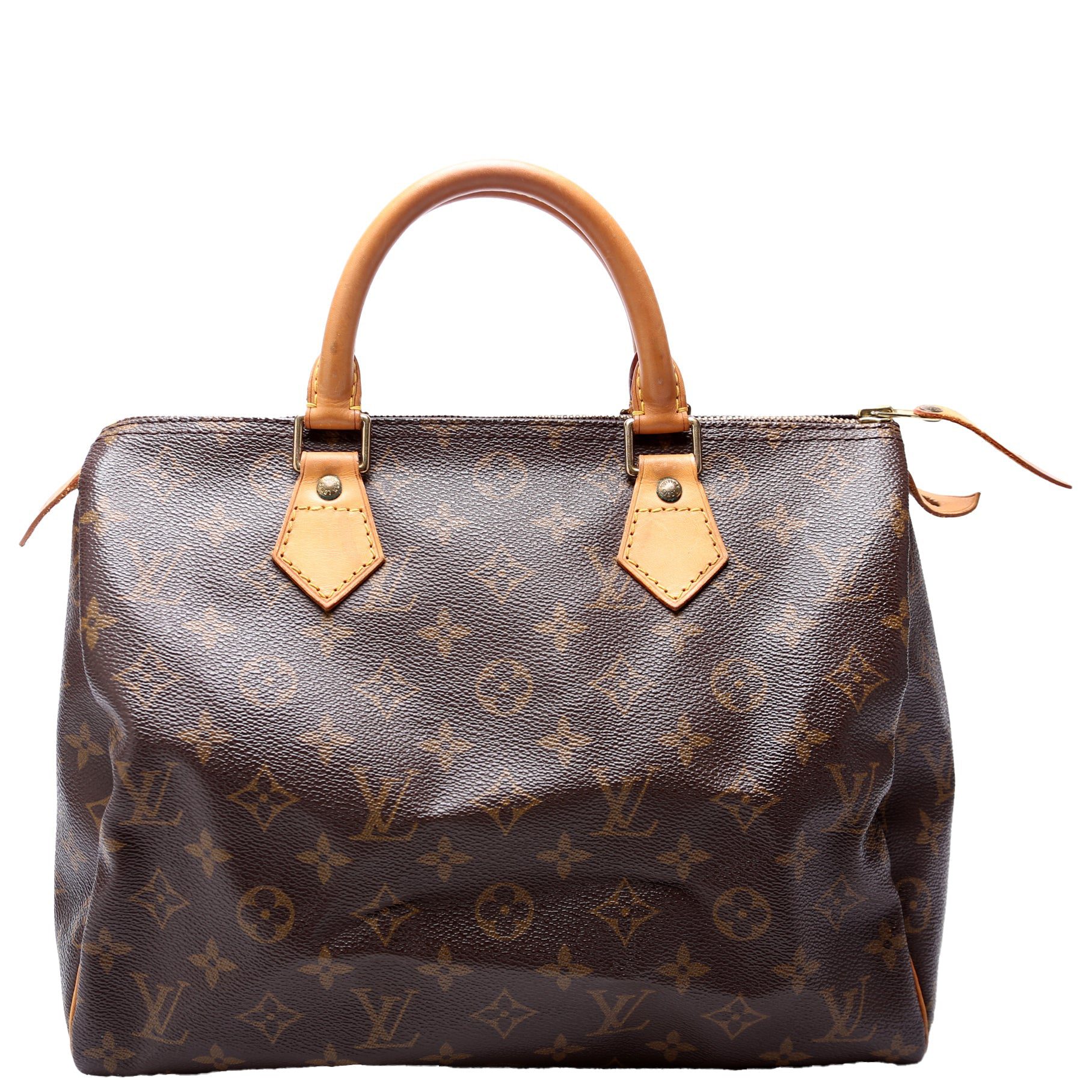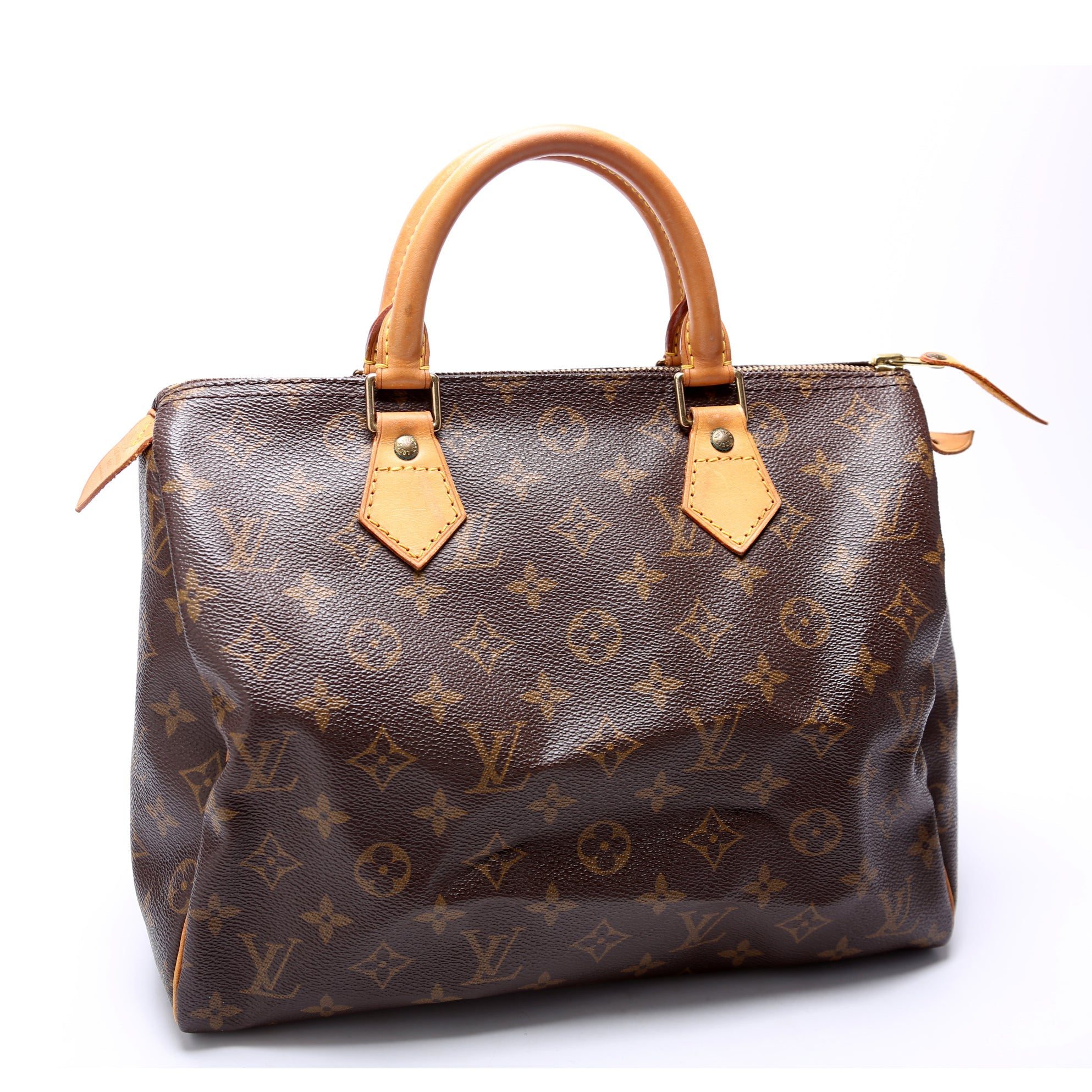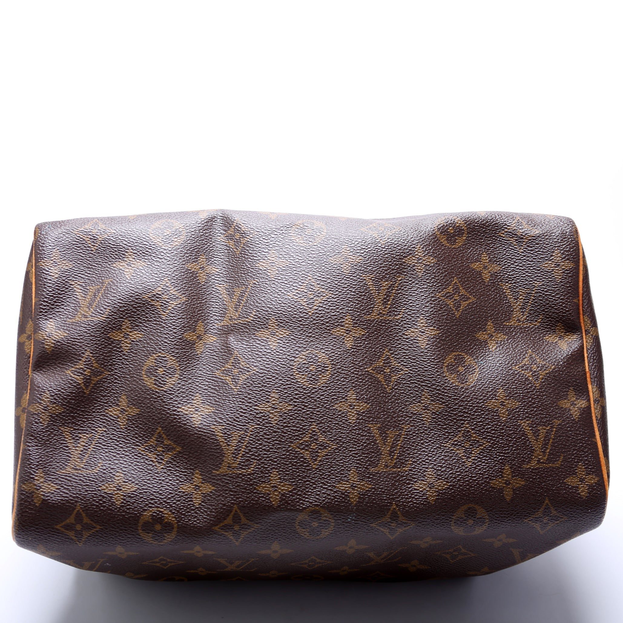 Louis Vuitton Speedy 30. The exterior is in the classic Louis Vuitton Monogram coated canvas.Â