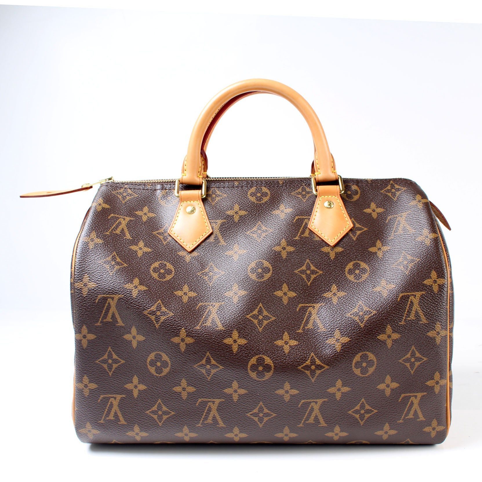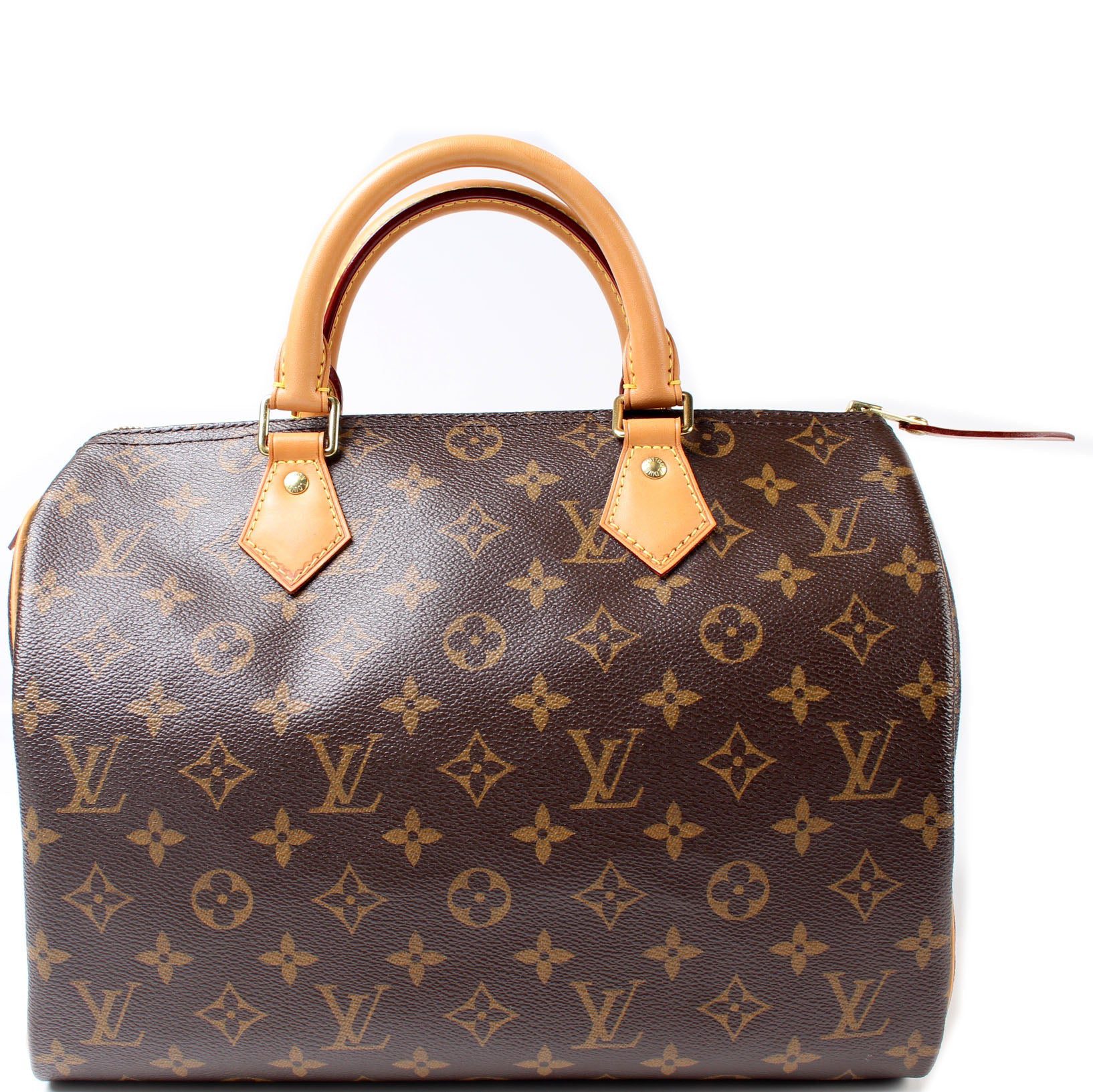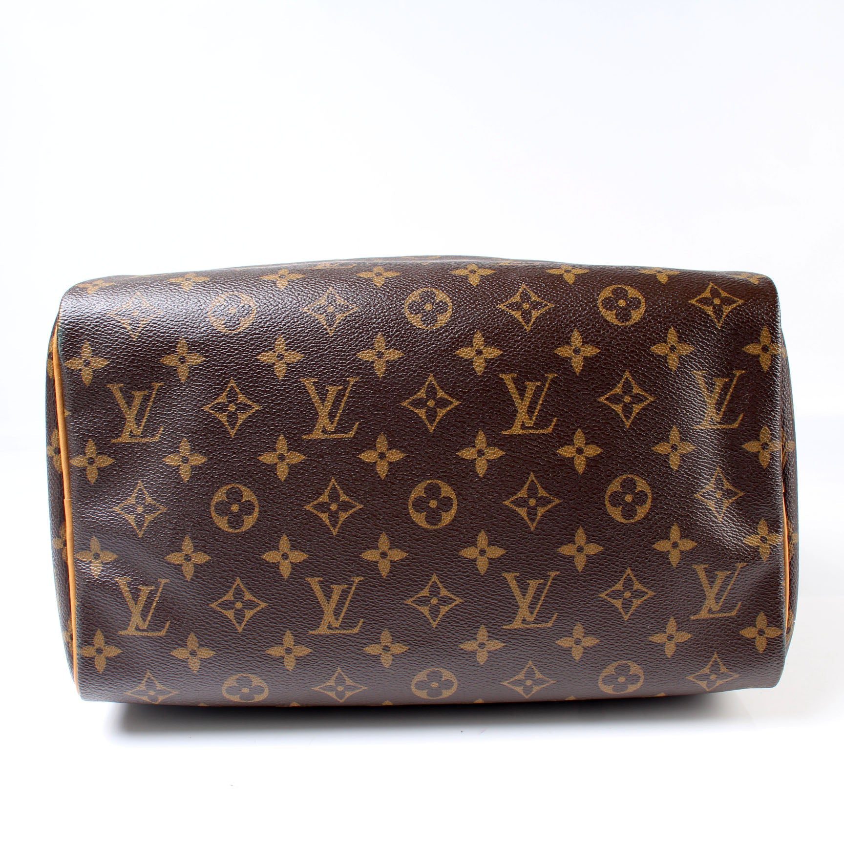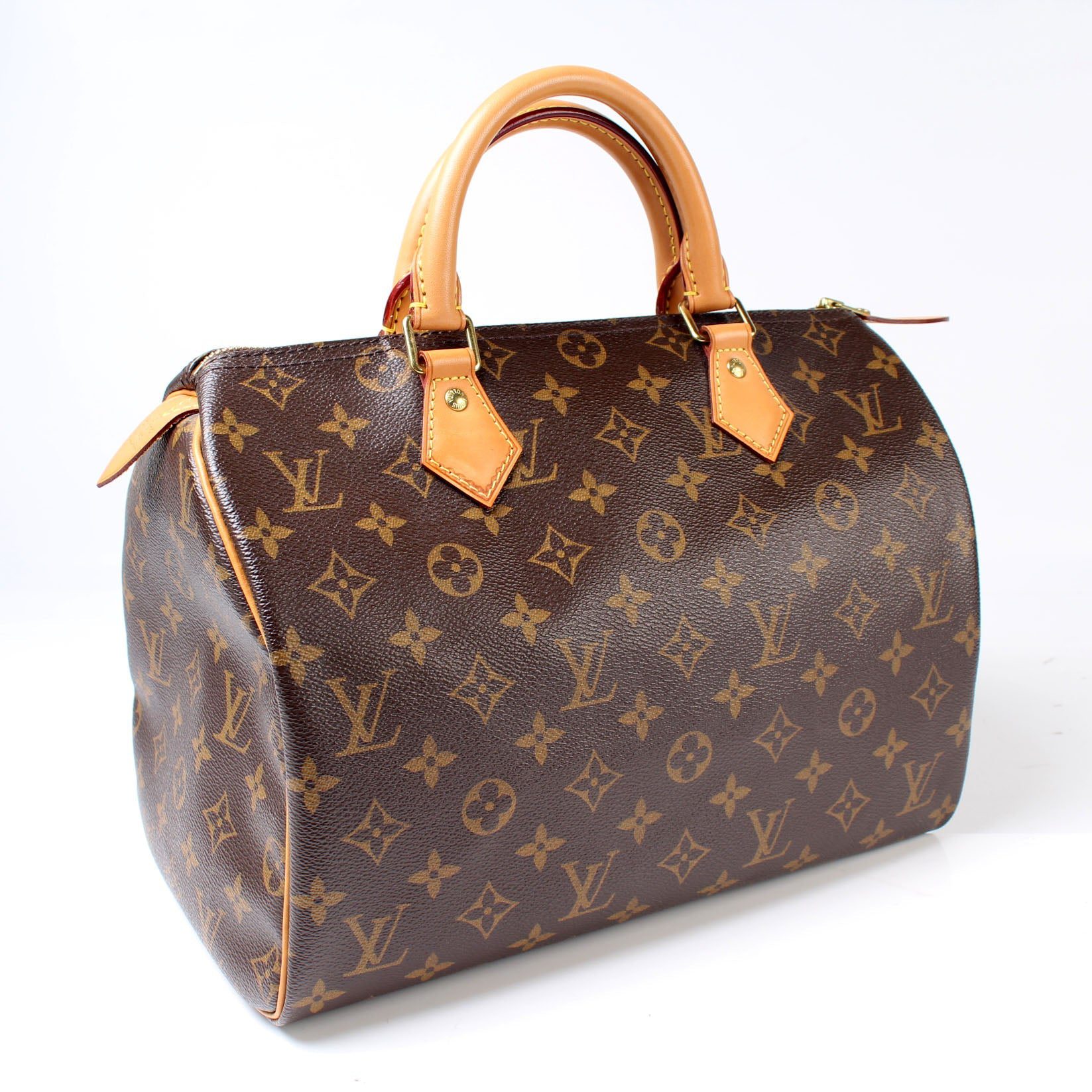 Louis Vuitton Speedy 30. The exterior is in the classic Louis Vuitton Monogram coated canvas.Â