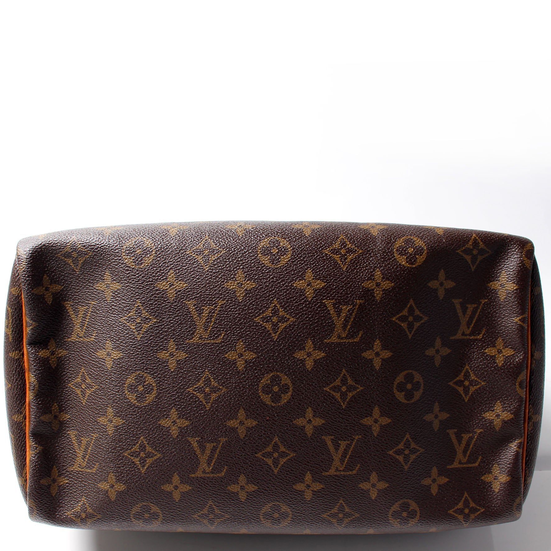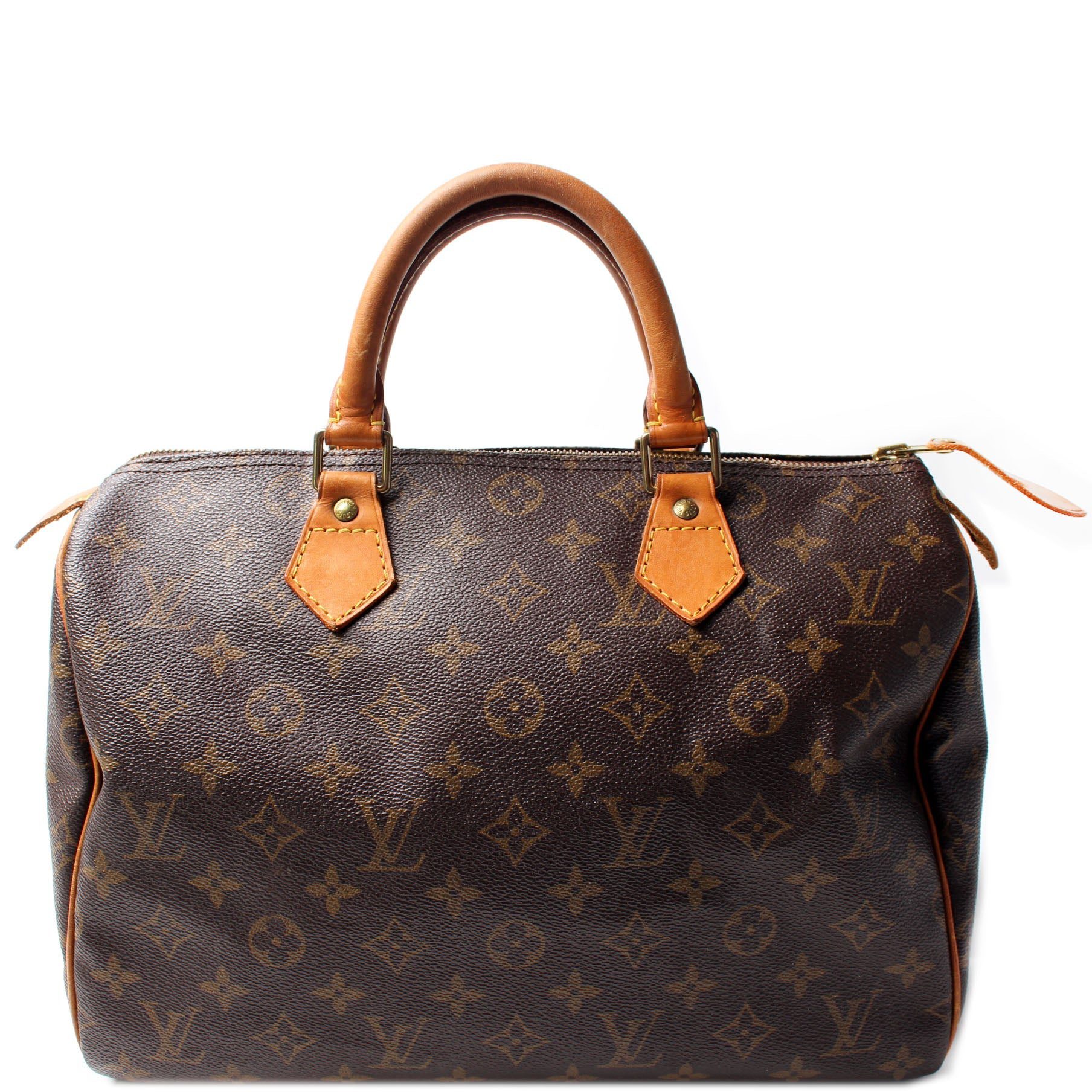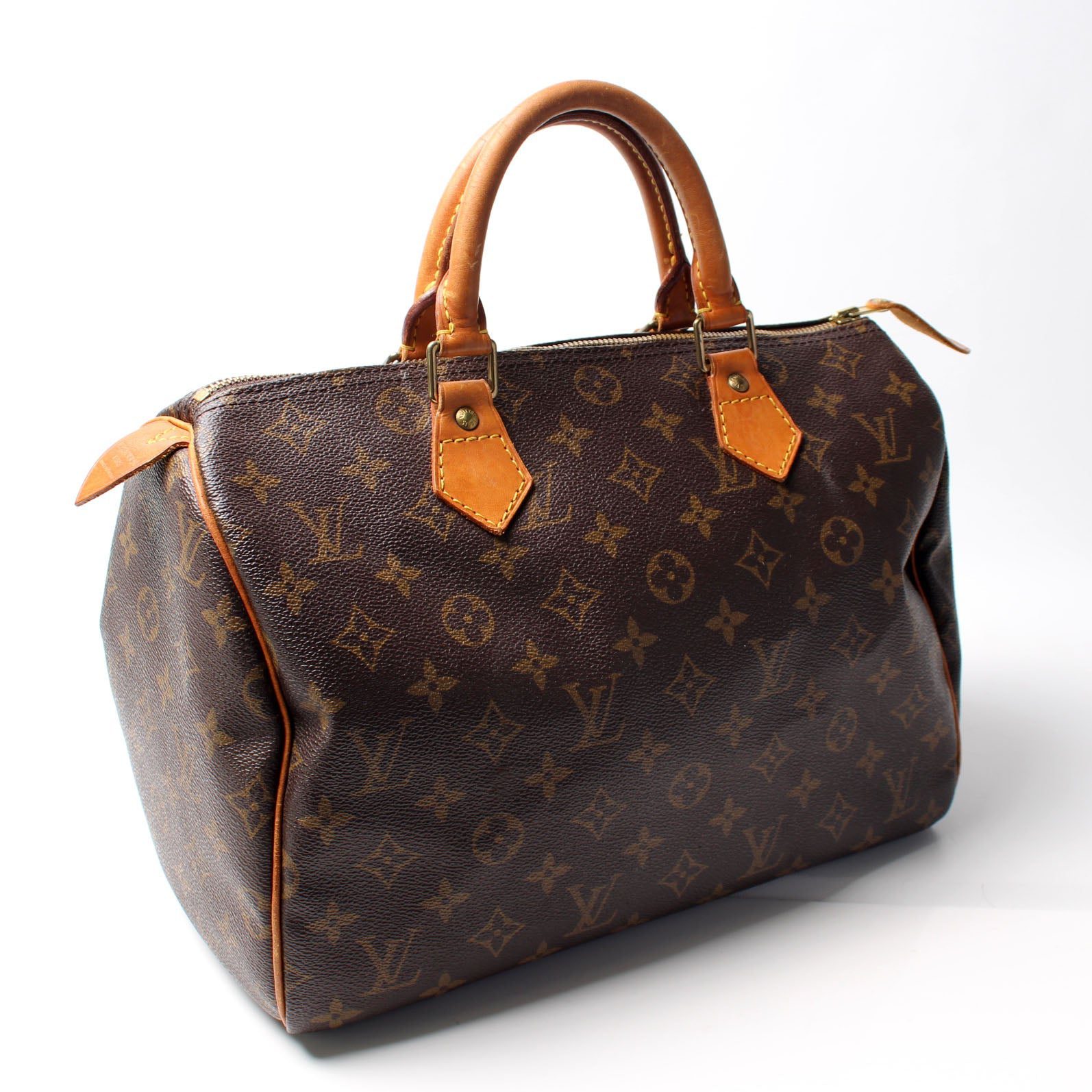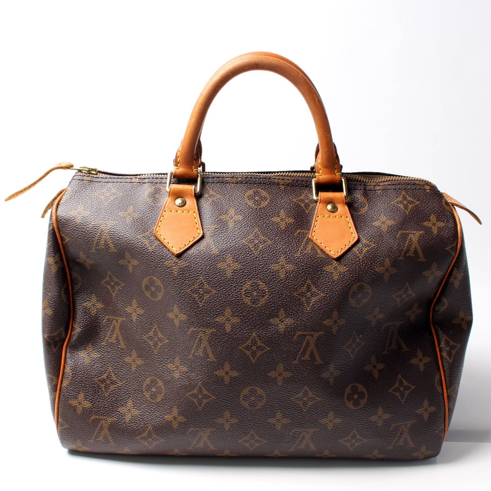 Louis Vuitton Speedy 30. The exterior is in the classic Louis Vuitton Monogram coated canvas.Â