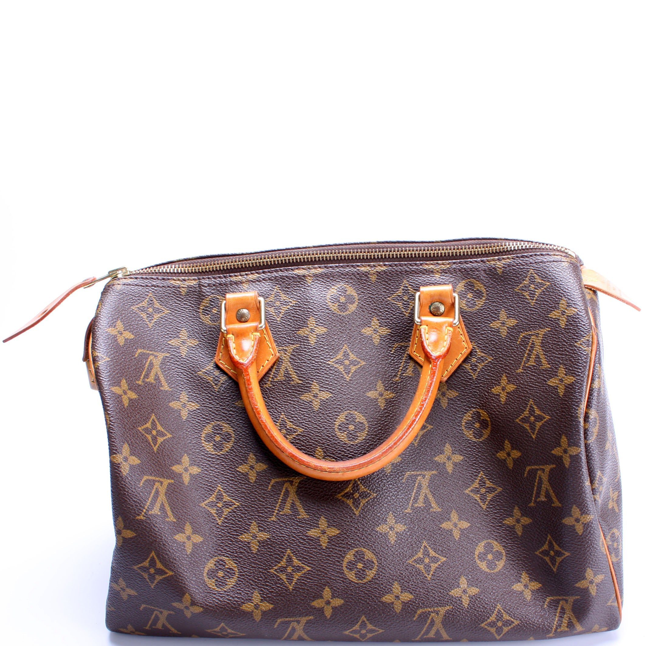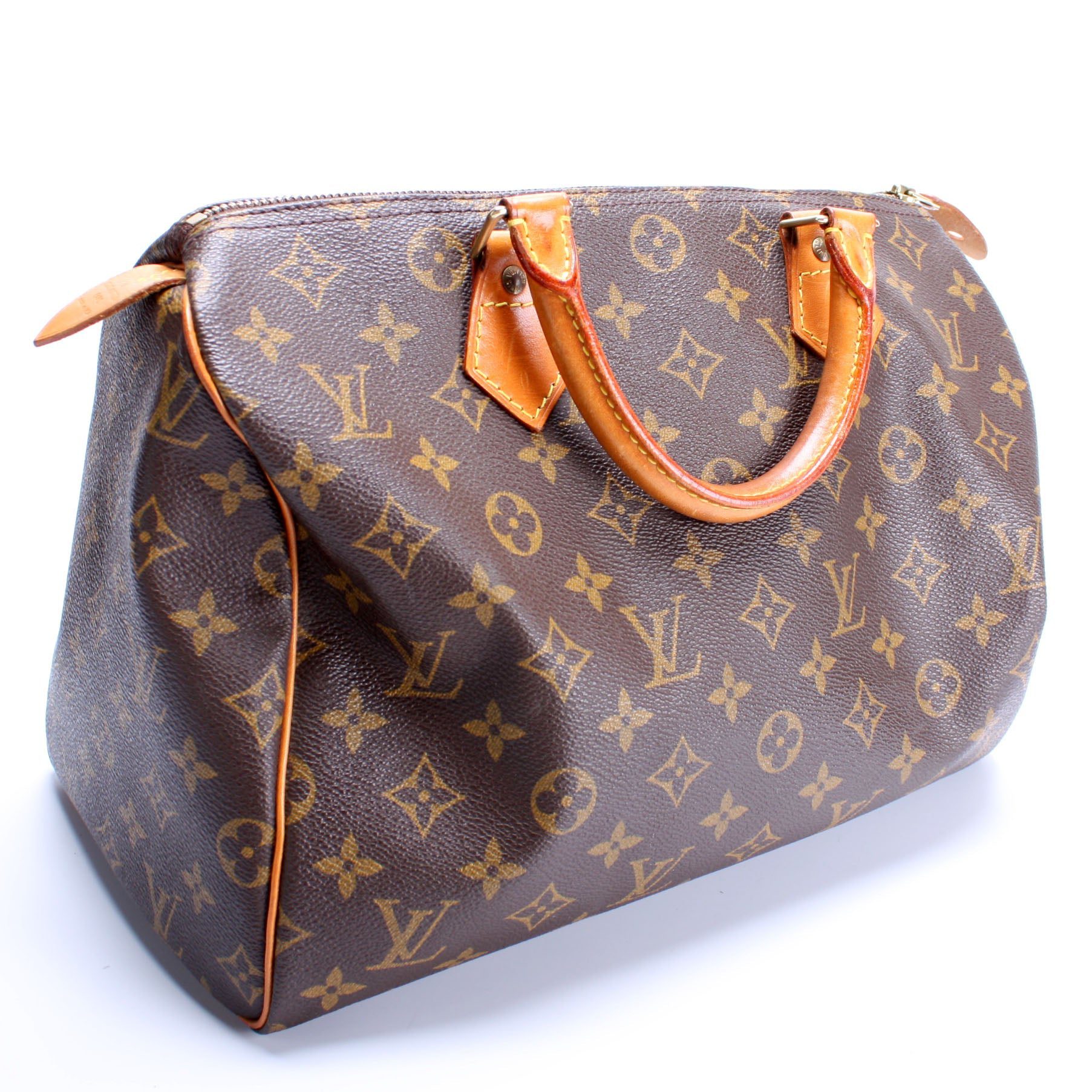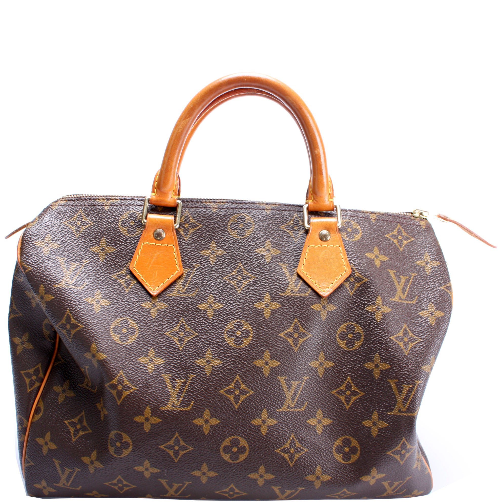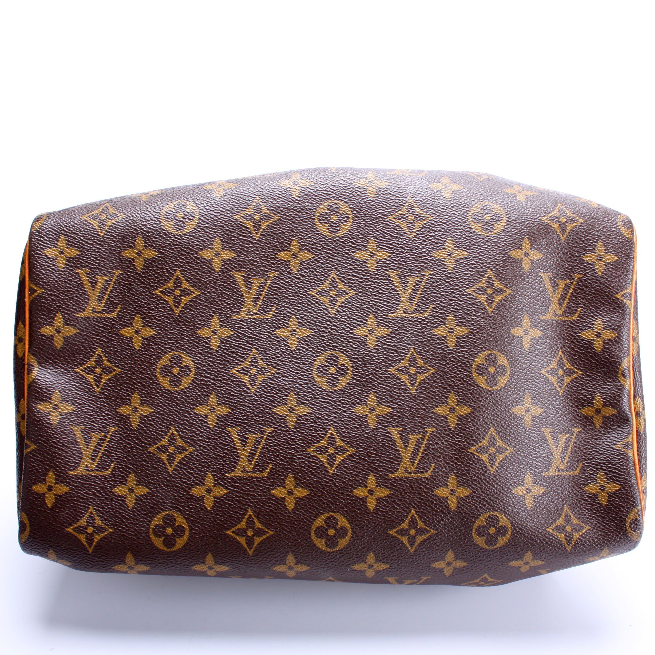Louis Vuitton Speedy 30. The exterior is in the classic Louis Vuitton Monogram coated canvas.Â