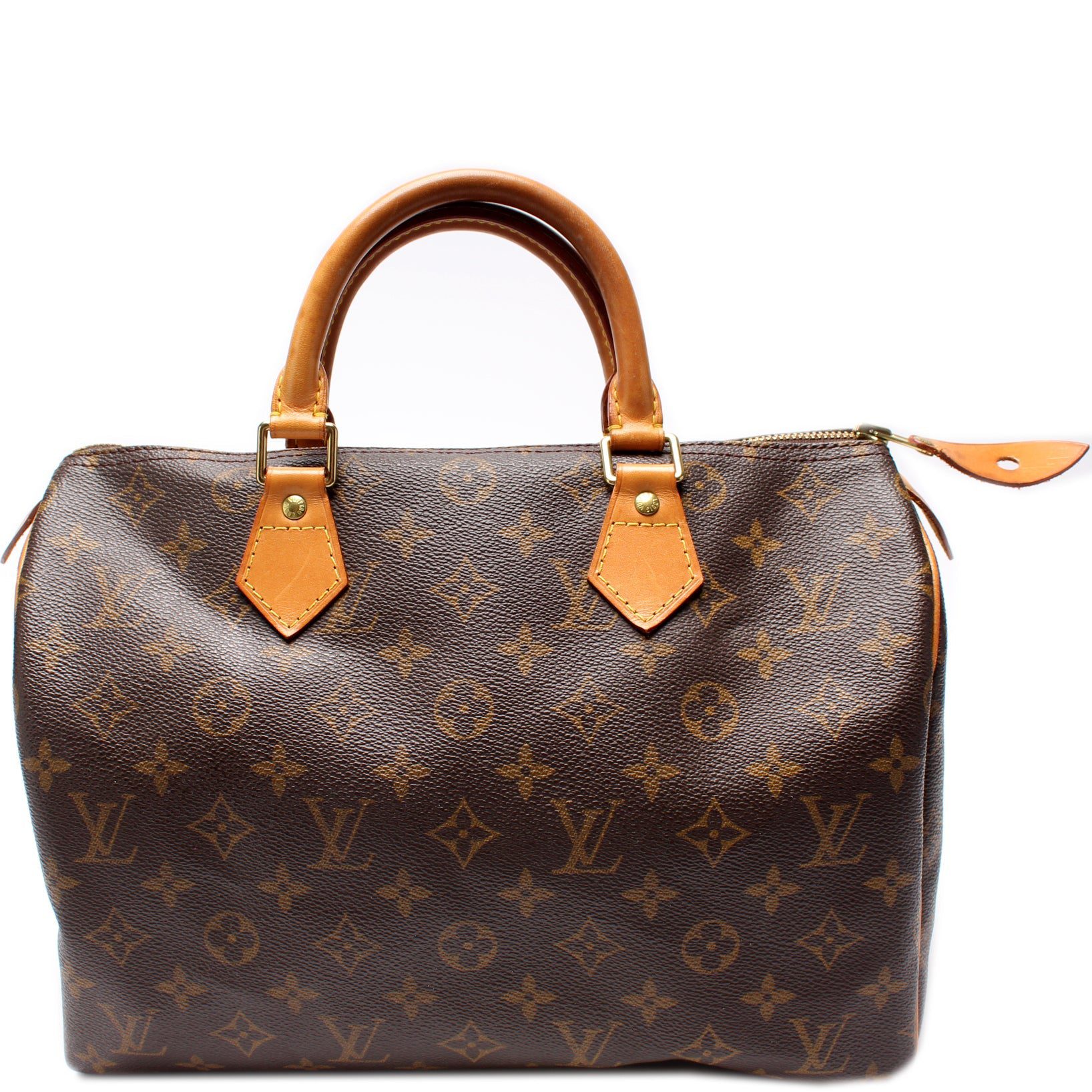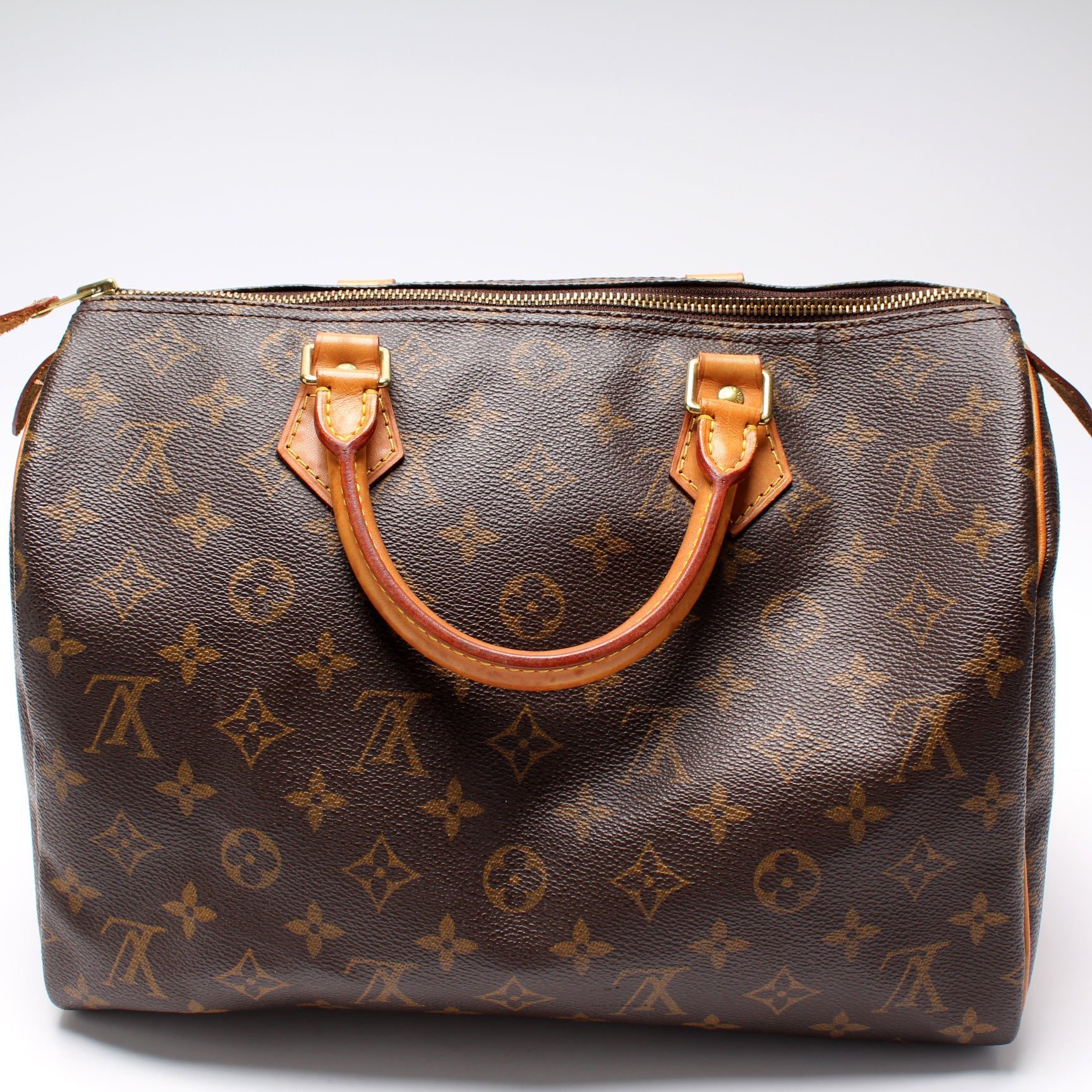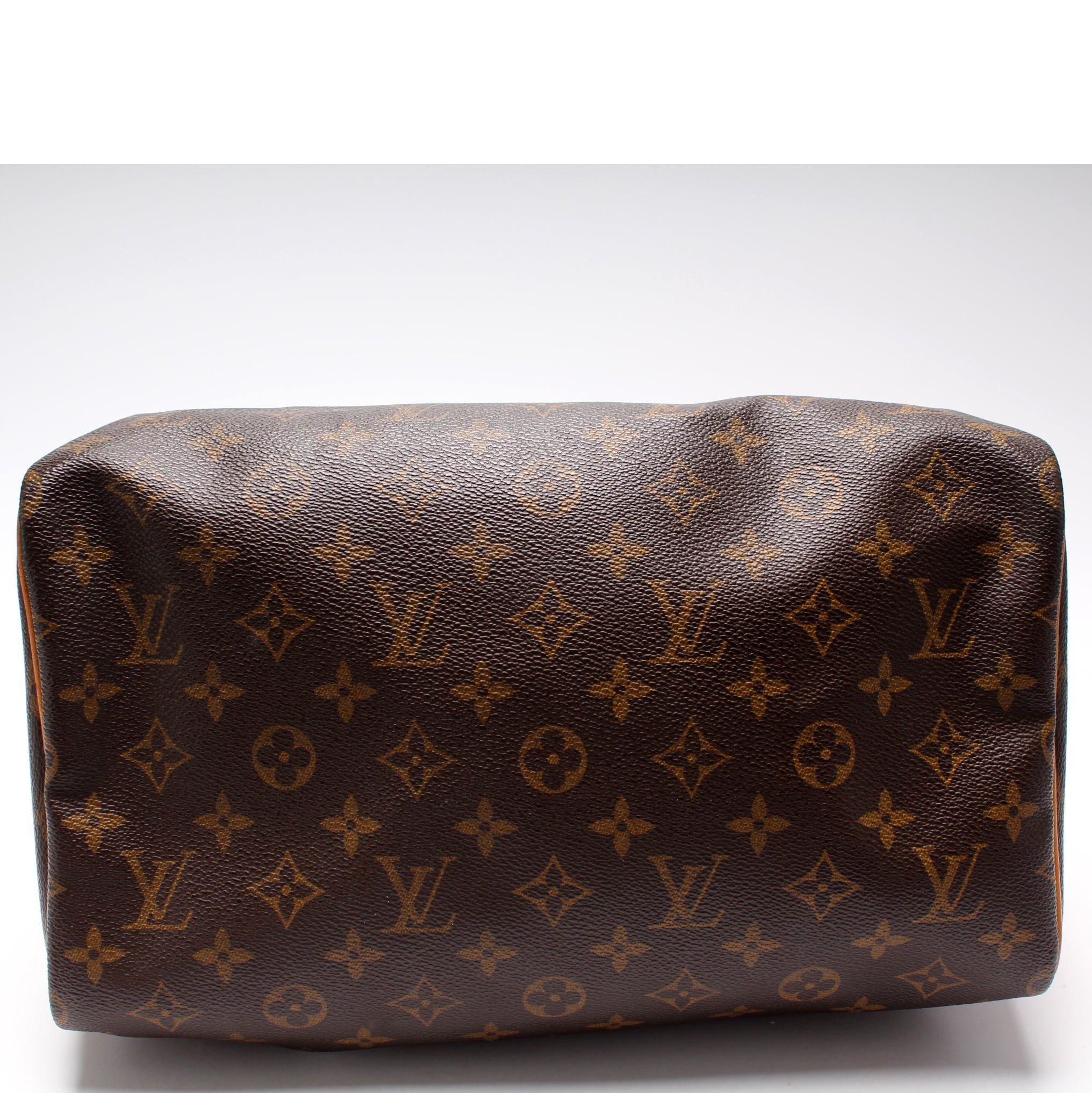 Louis Vuitton Speedy 30. The exterior is in the classic Louis Vuitton Monogram coated canvas.Â