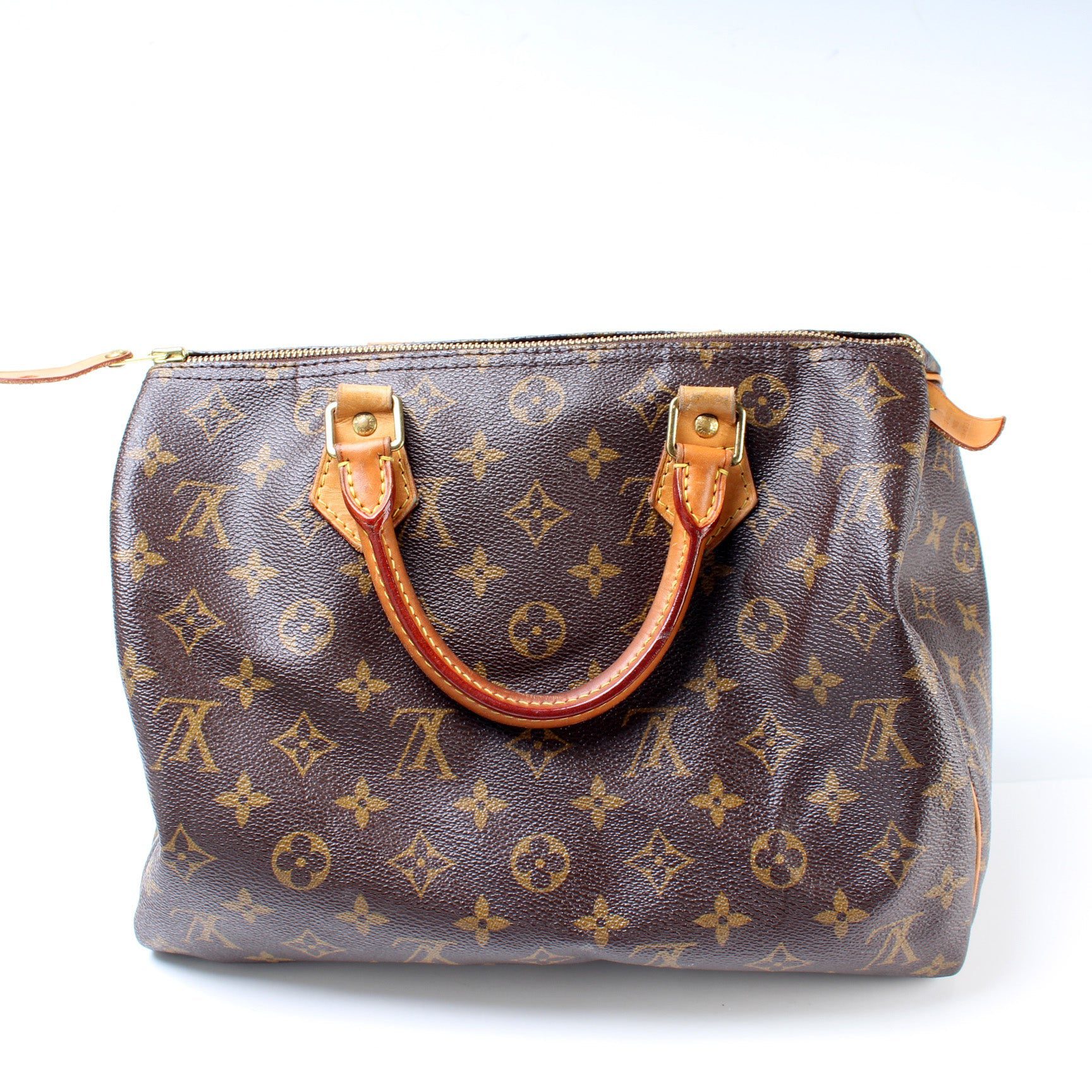 Louis Vuitton Speedy 30. The exterior is in the classic Louis Vuitton Monogram coated canvas.Â
