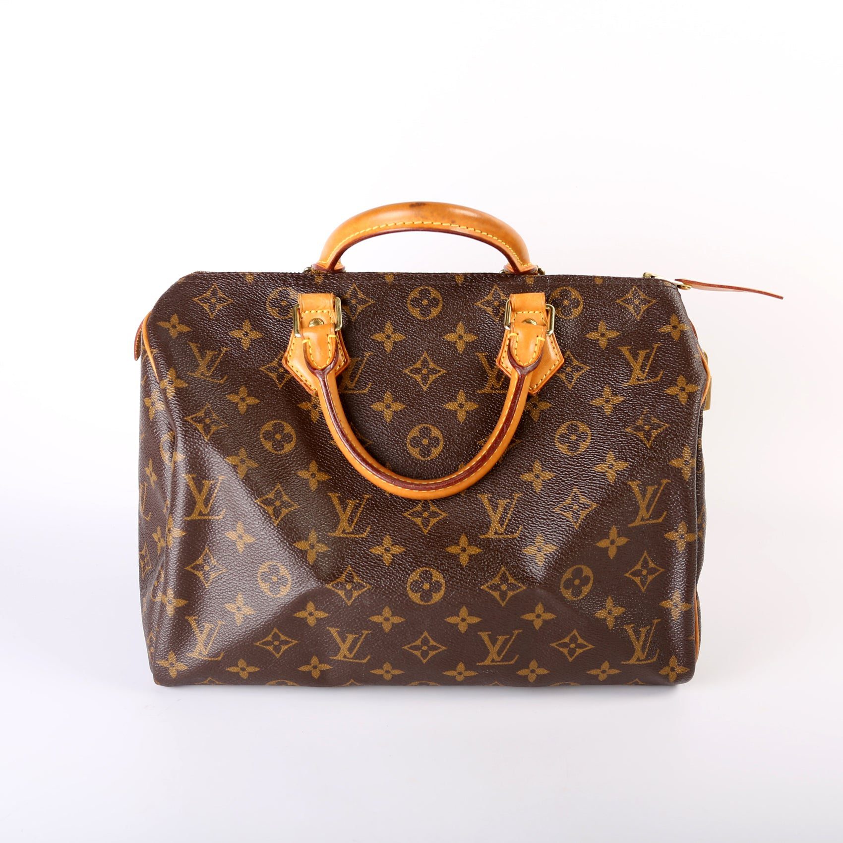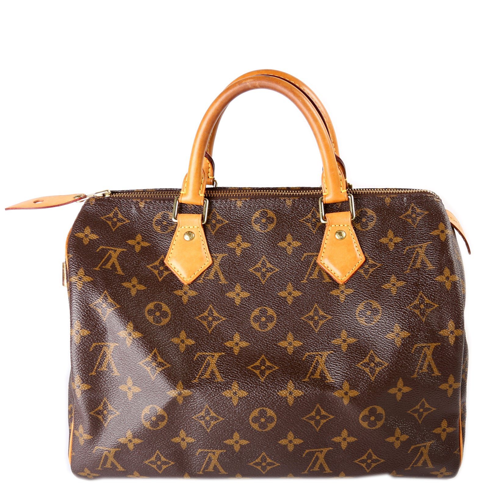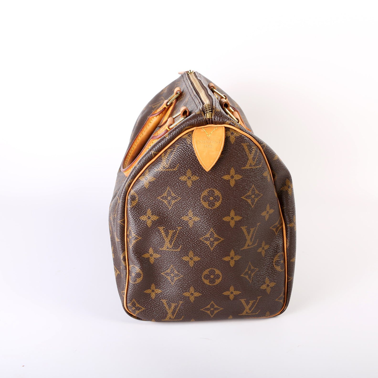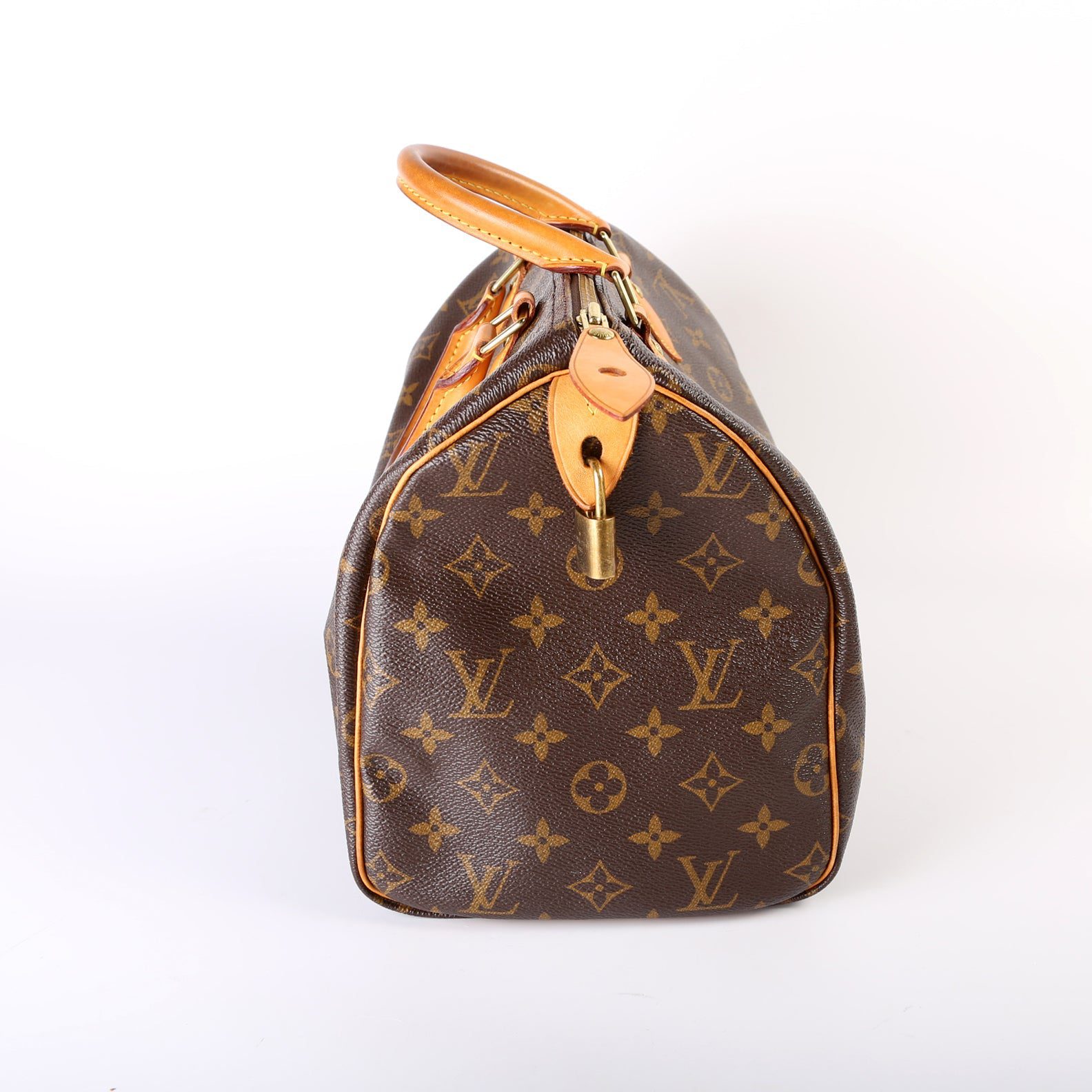 Louis Vuitton Speedy 30. The exterior is in the classic Louis Vuitton Monogram coated canvas.Â