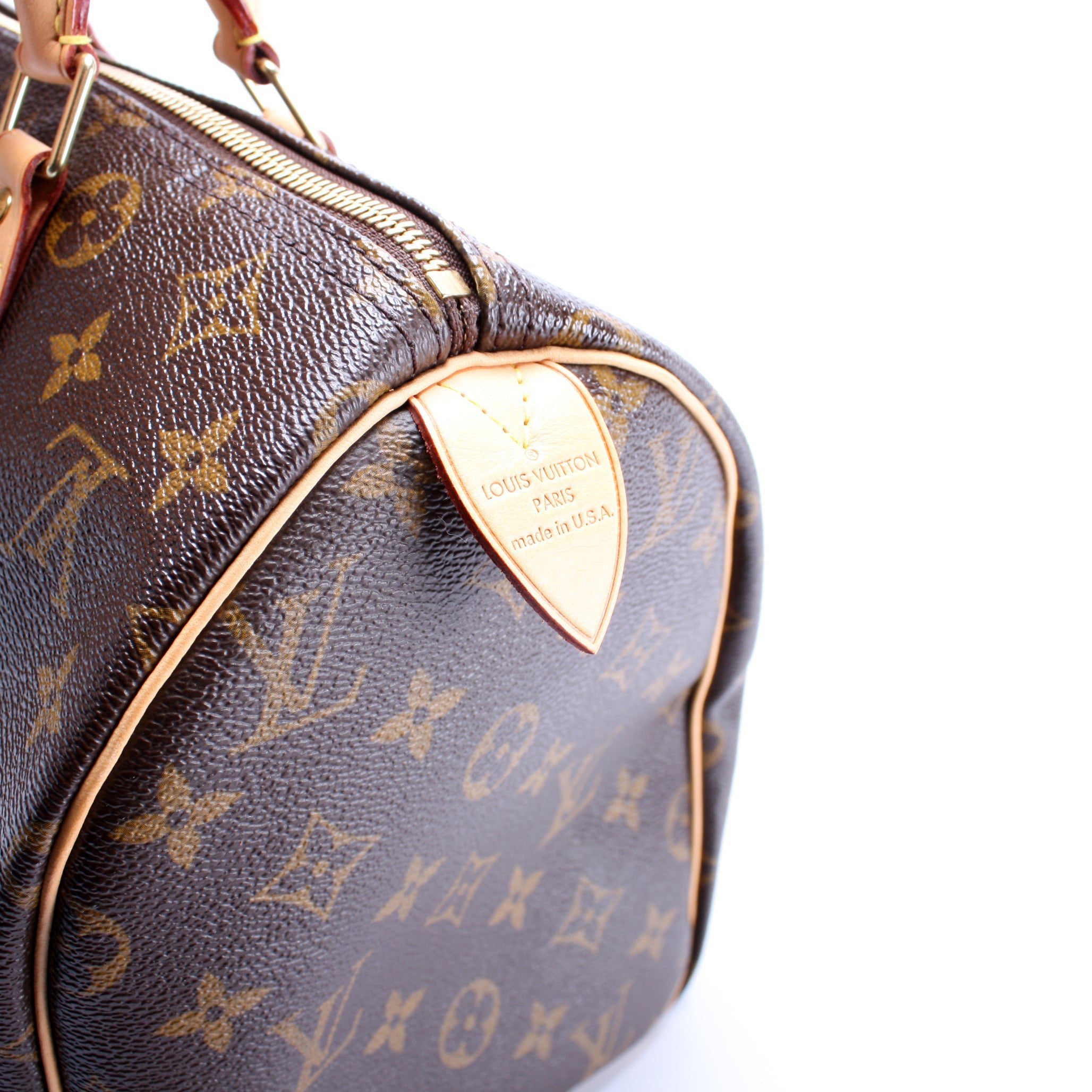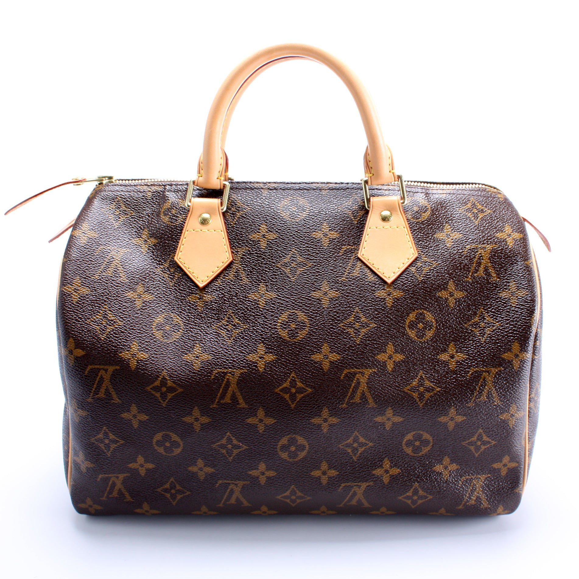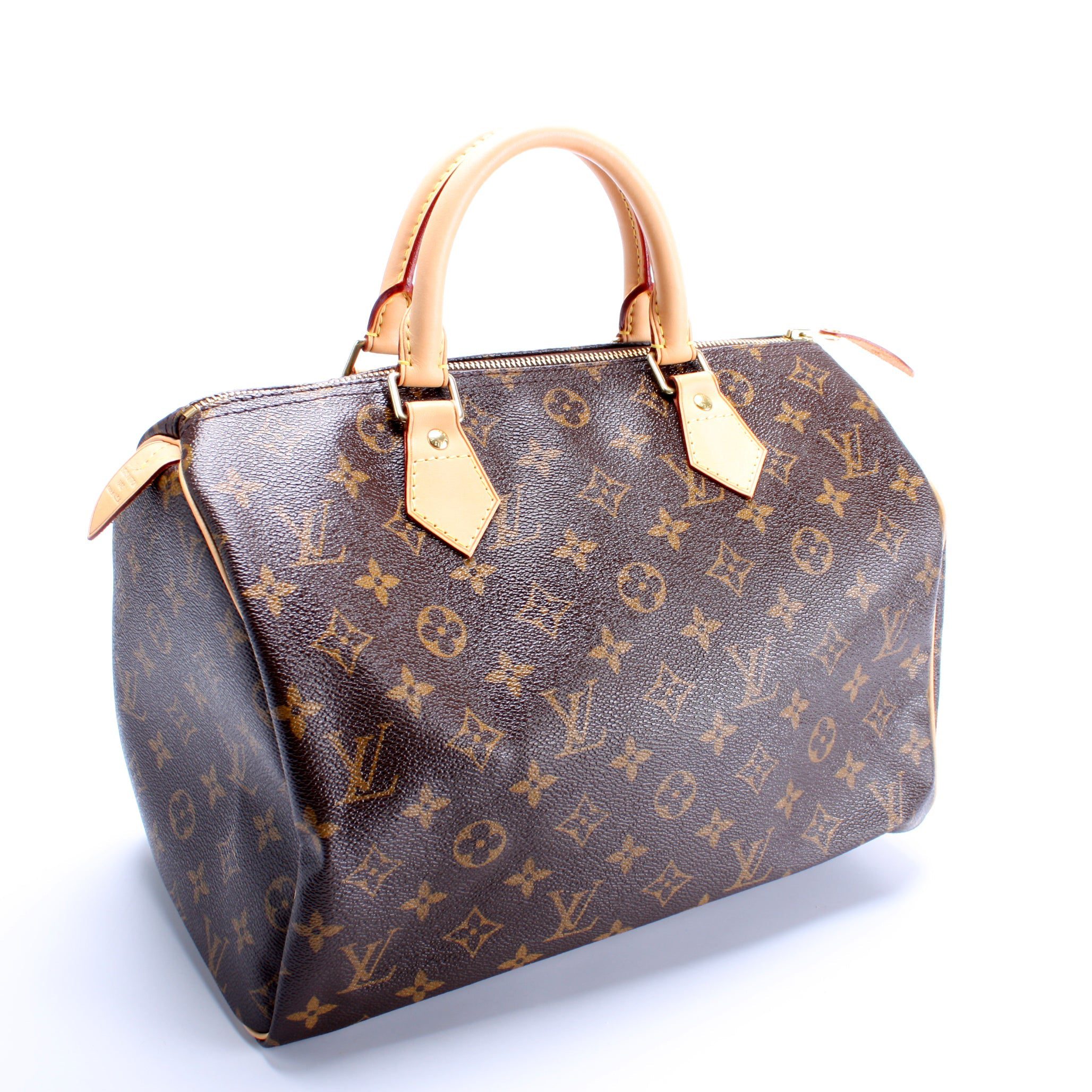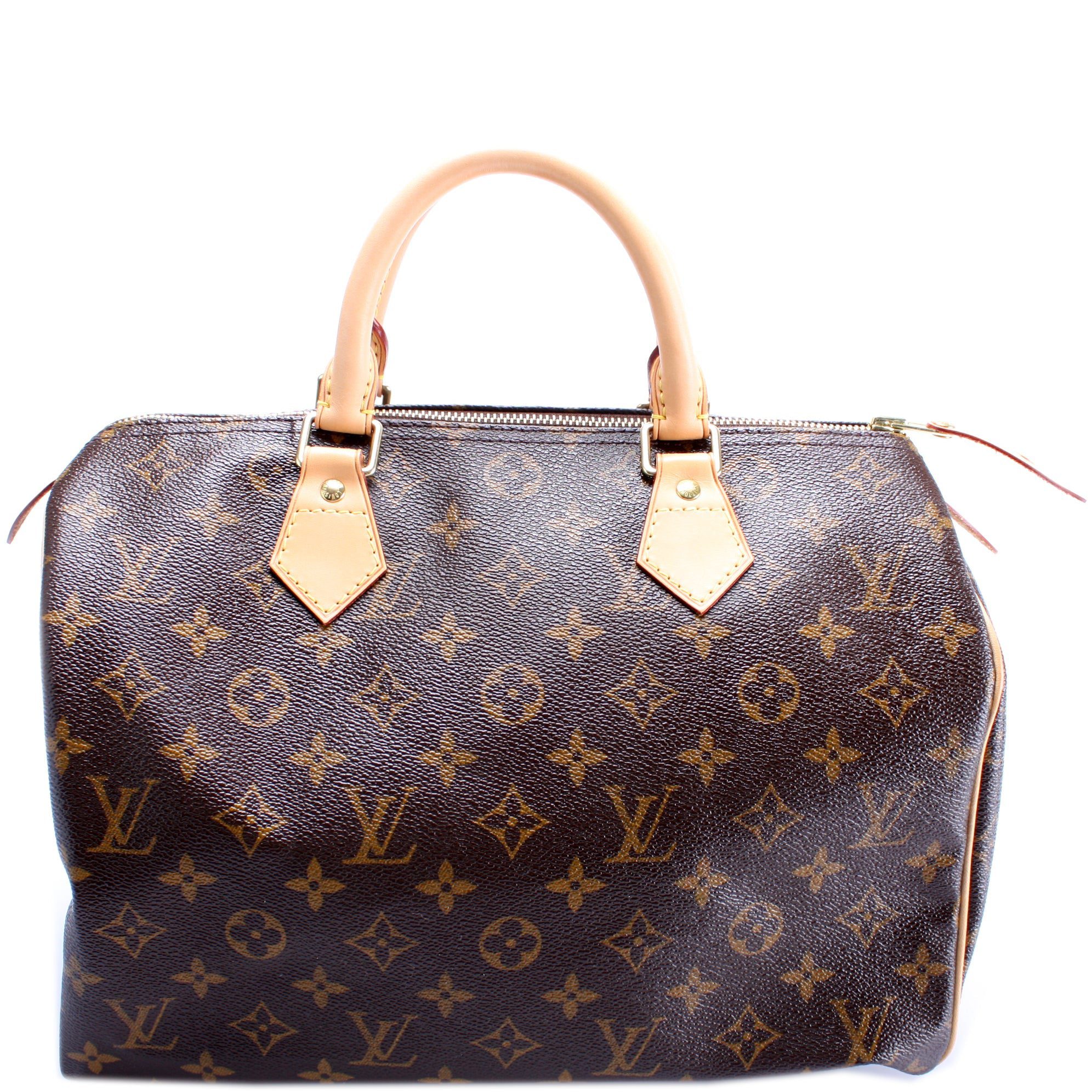 Louis Vuitton Speedy 30. The exterior is in the classic Louis Vuitton Monogram coated canvas.Â
