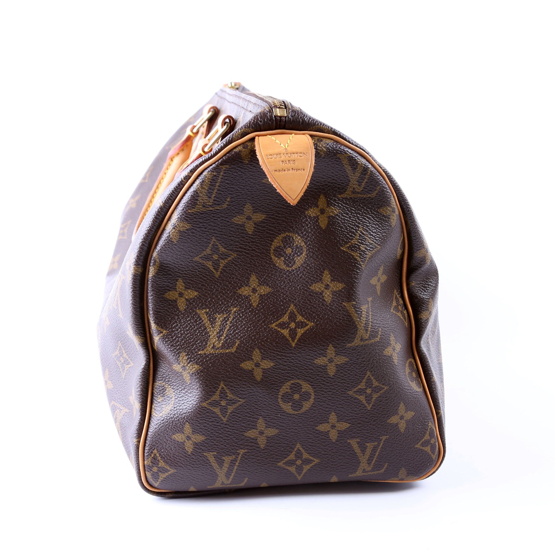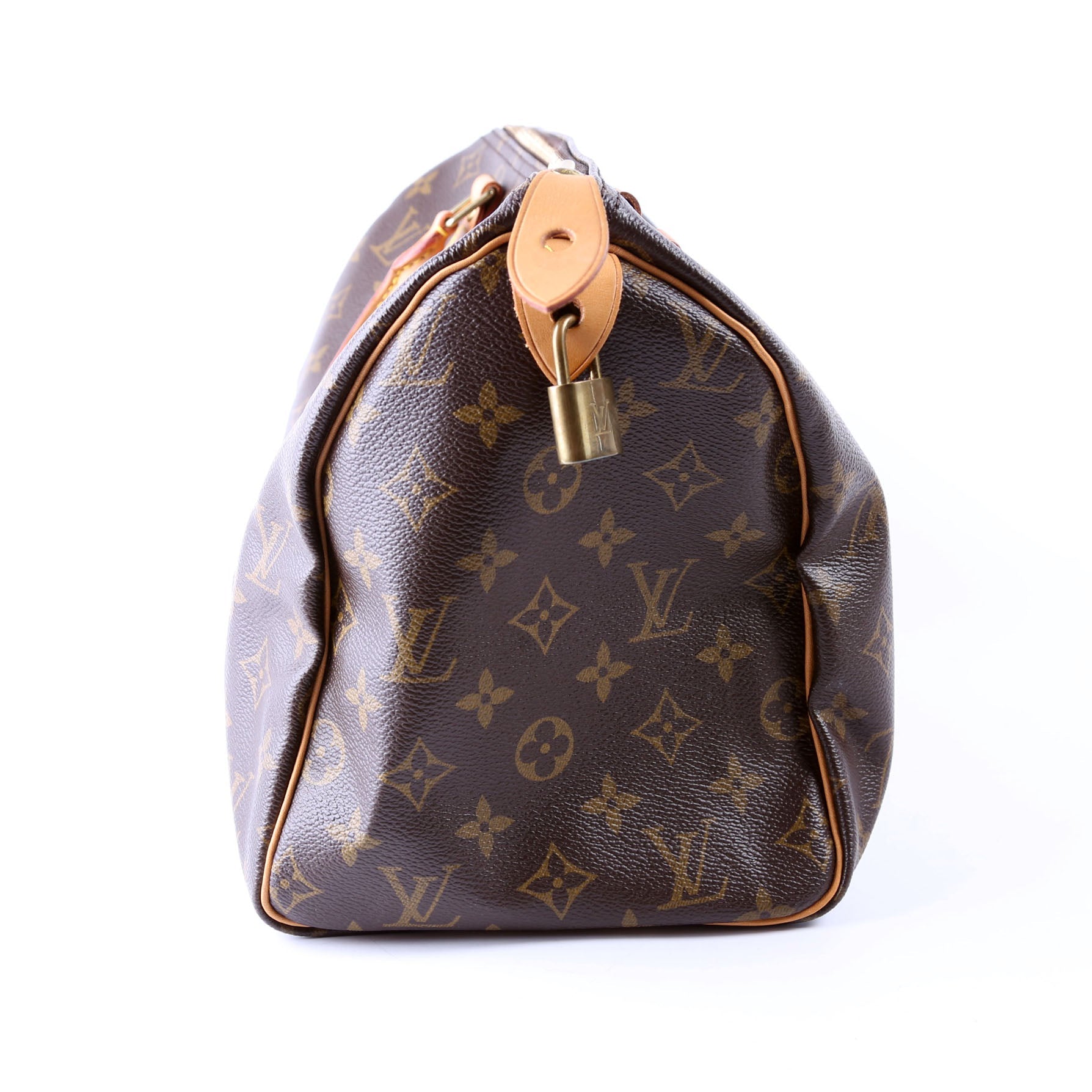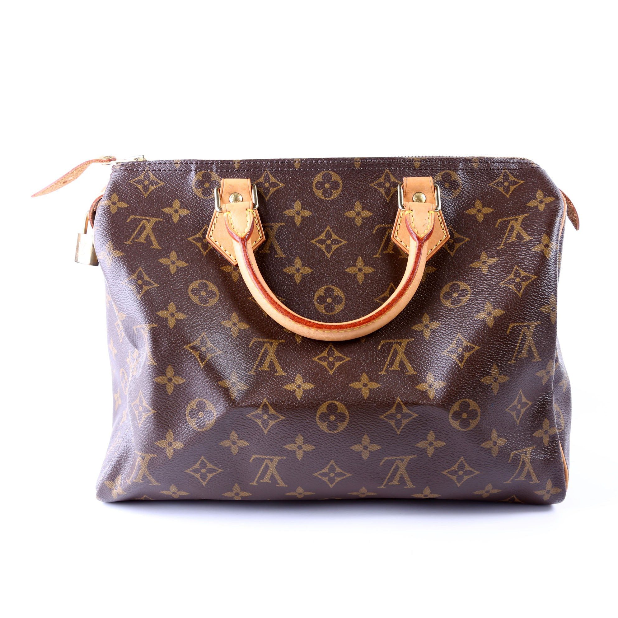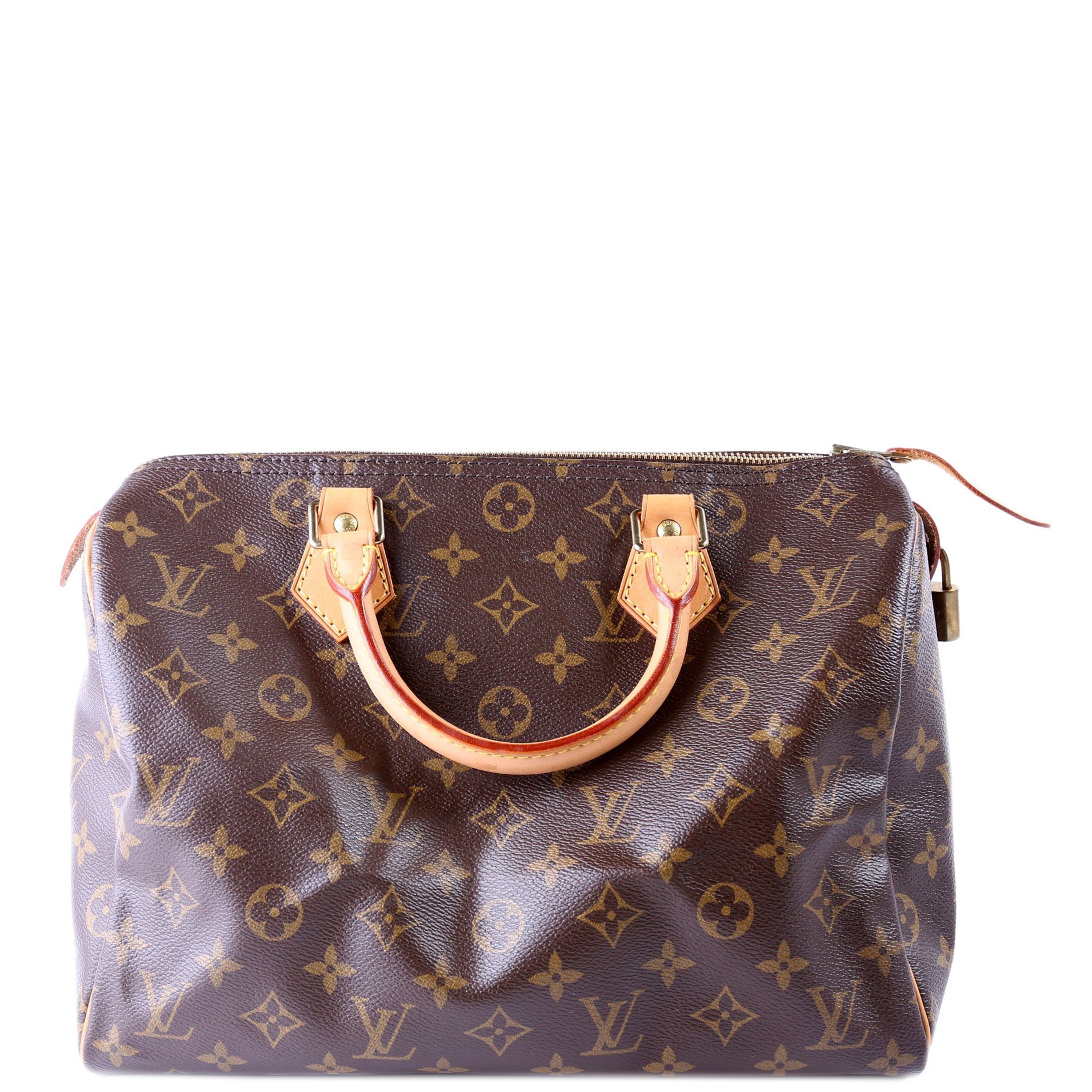 Louis Vuitton Speedy 30. The exterior is in the classic Louis Vuitton Monogram coated canvas.Â
