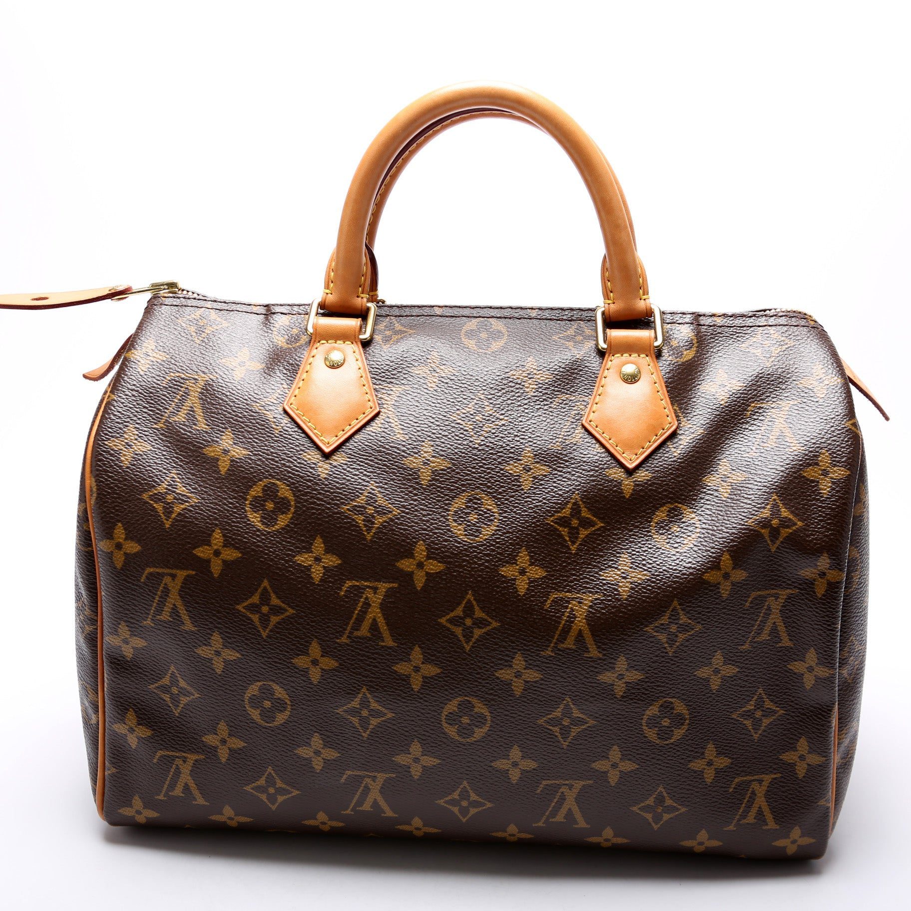 Louis Vuitton Speedy 30. The exterior is in the classic Louis Vuitton Monogram coated canvas.