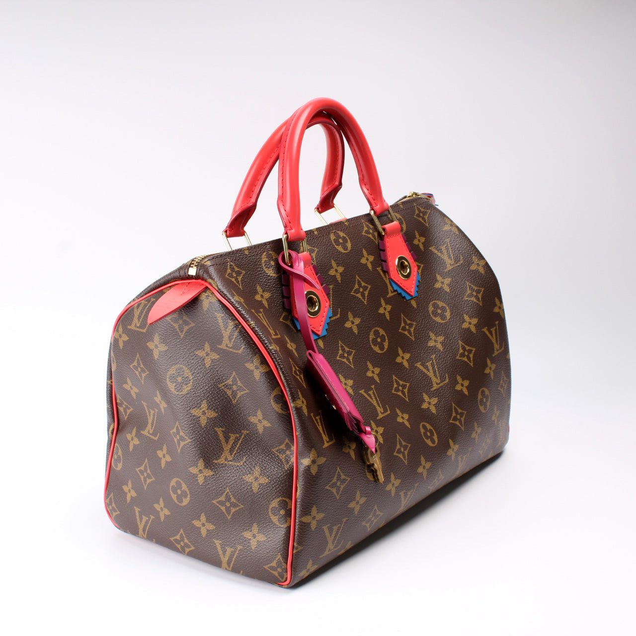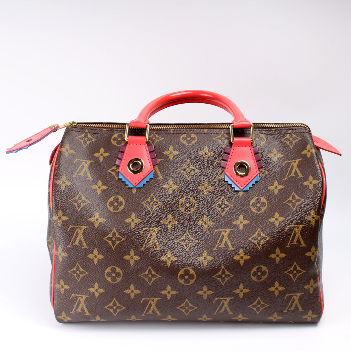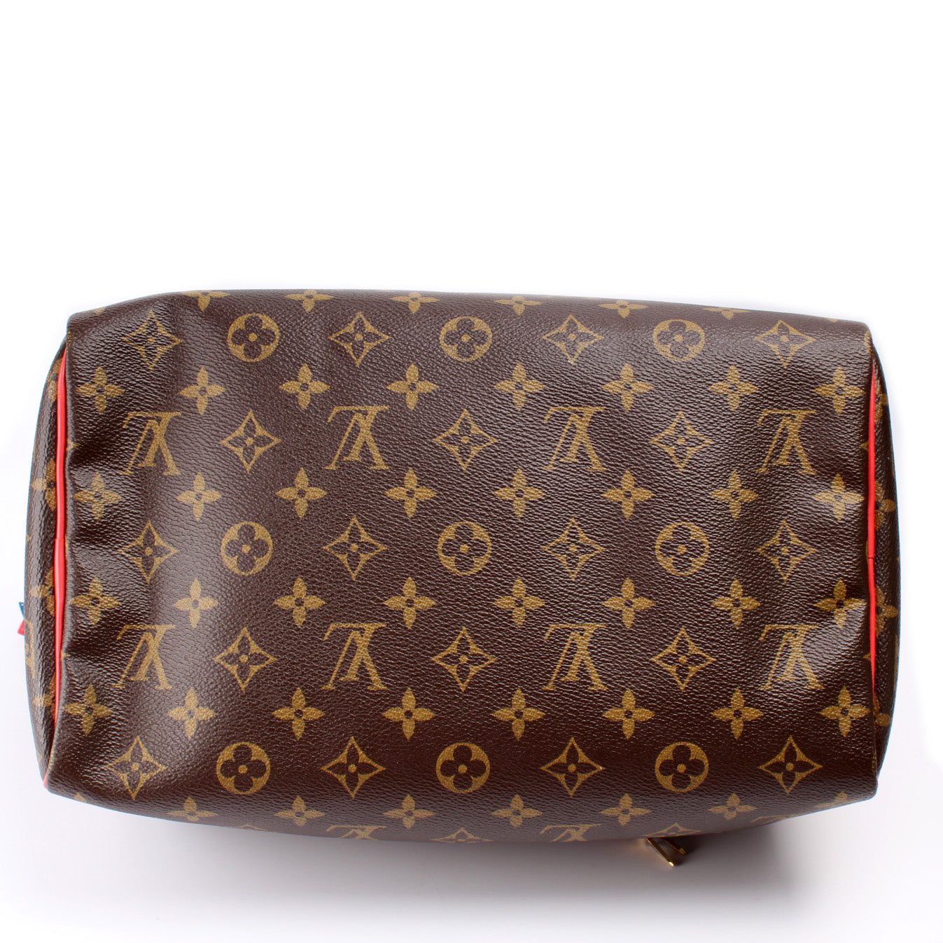Louis Vuitton Speedy 30. The exterior is in the classic Damier Azur coated canvas. Â