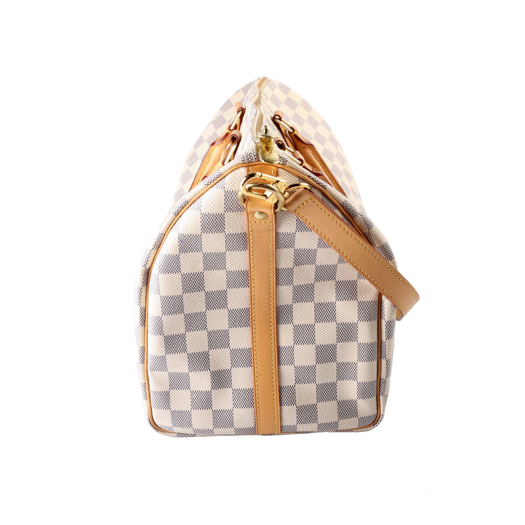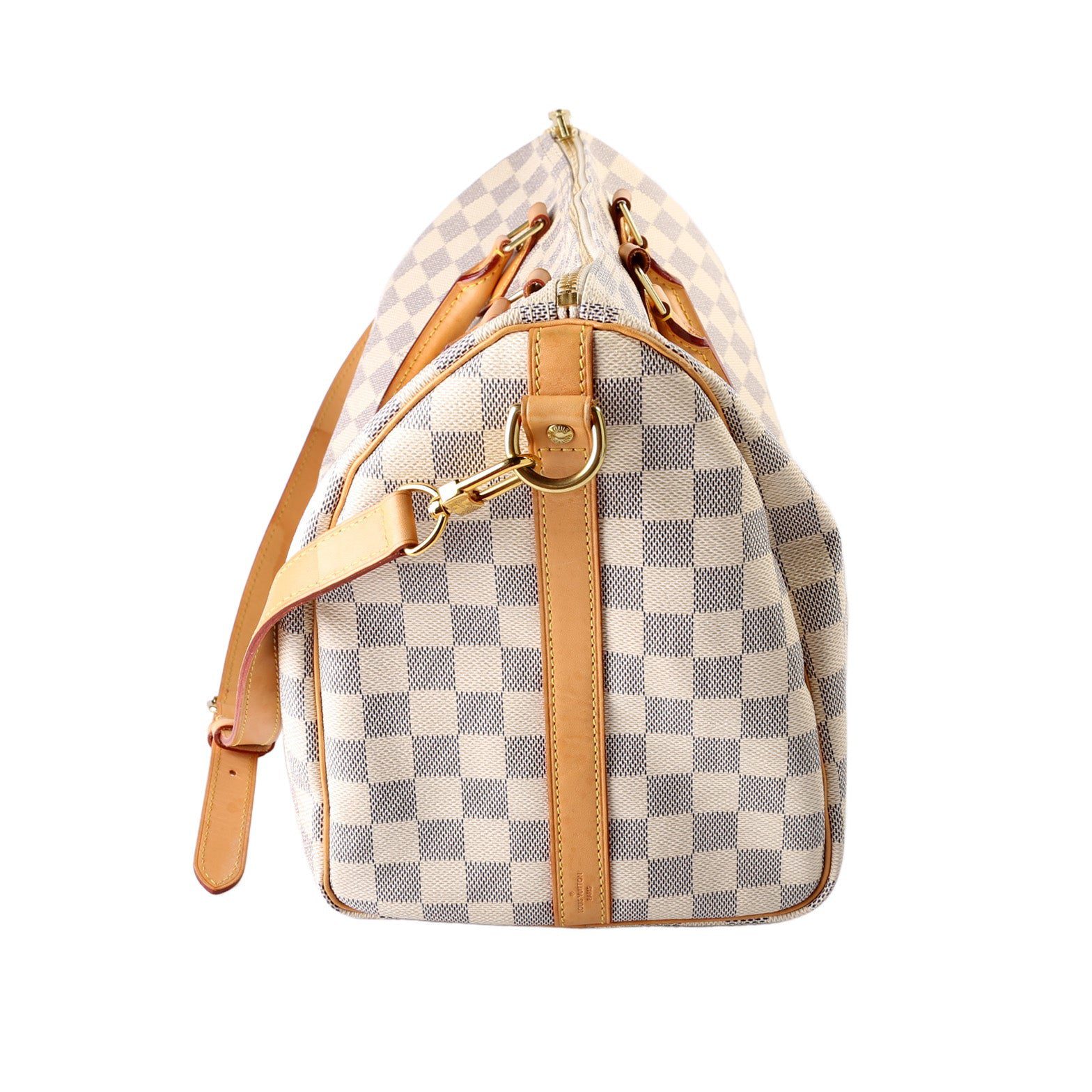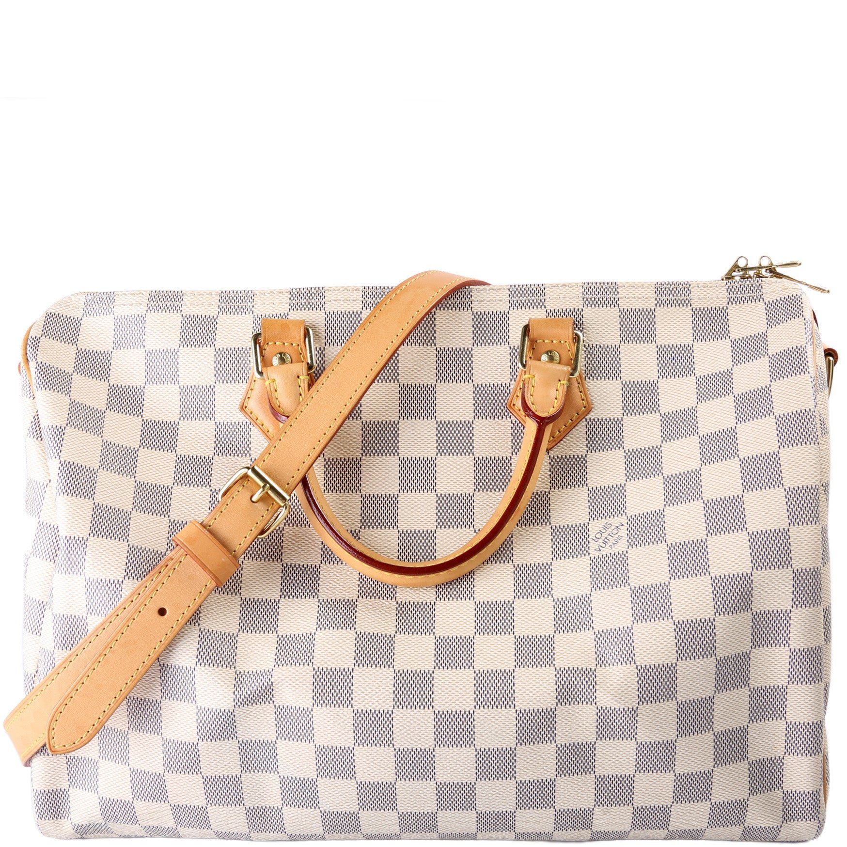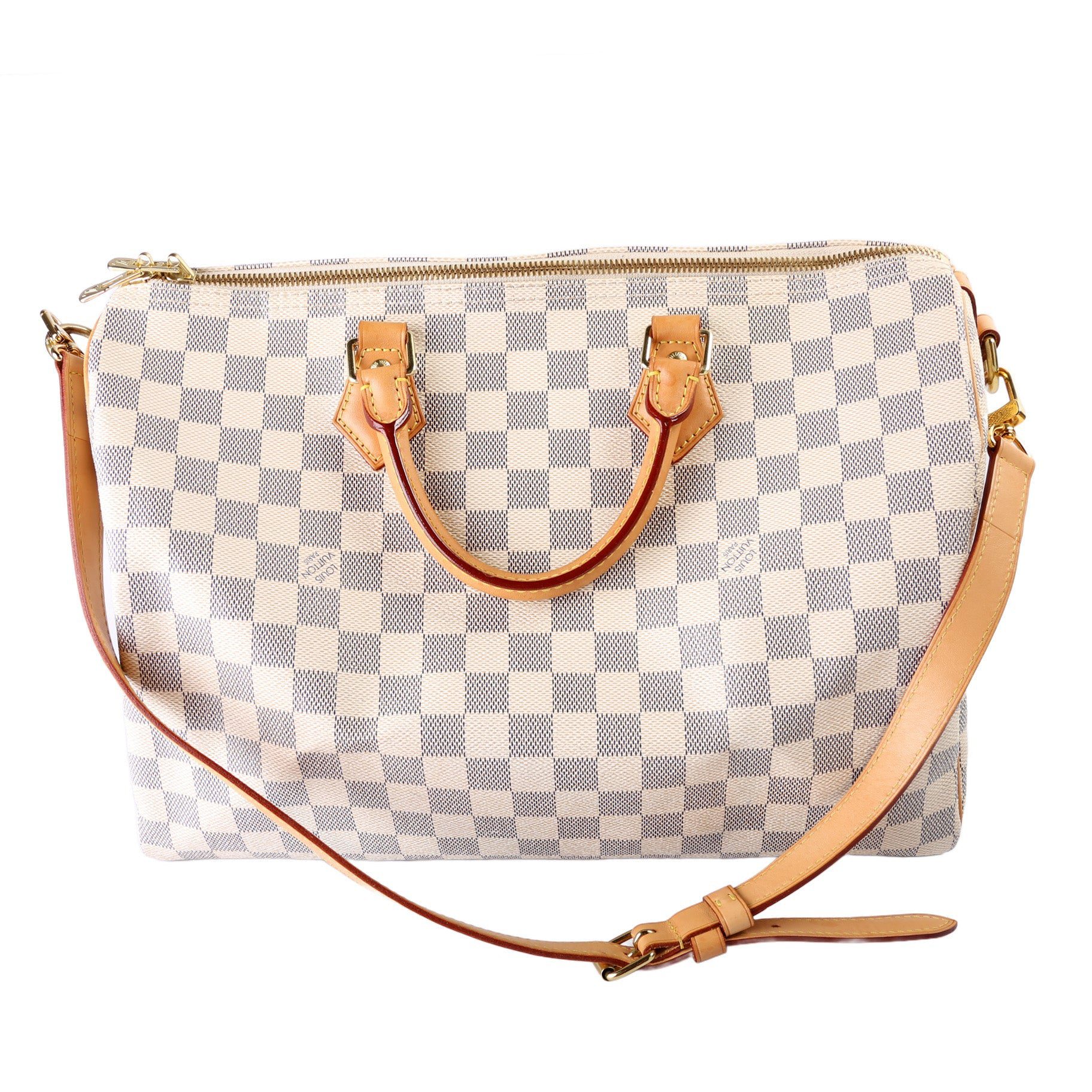 Louis Vuitton Speedy 35 Bandouliere. The exterior is in the classic Louis Vuitton Damier Azur coated canvas.Â