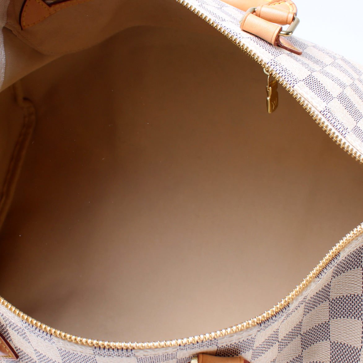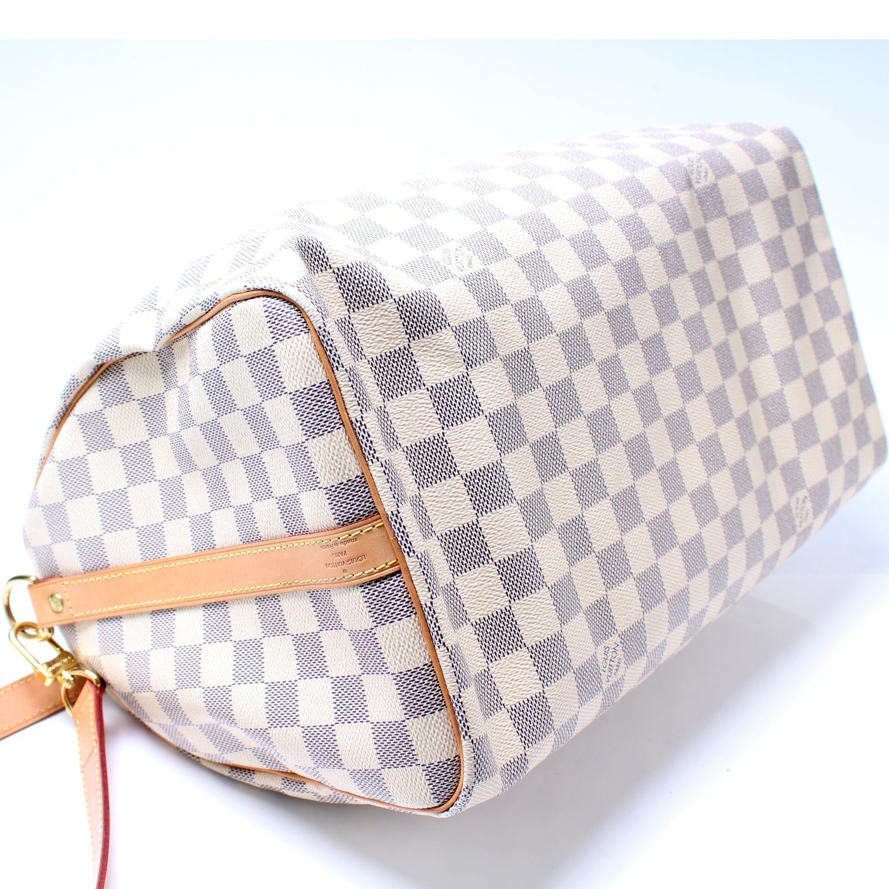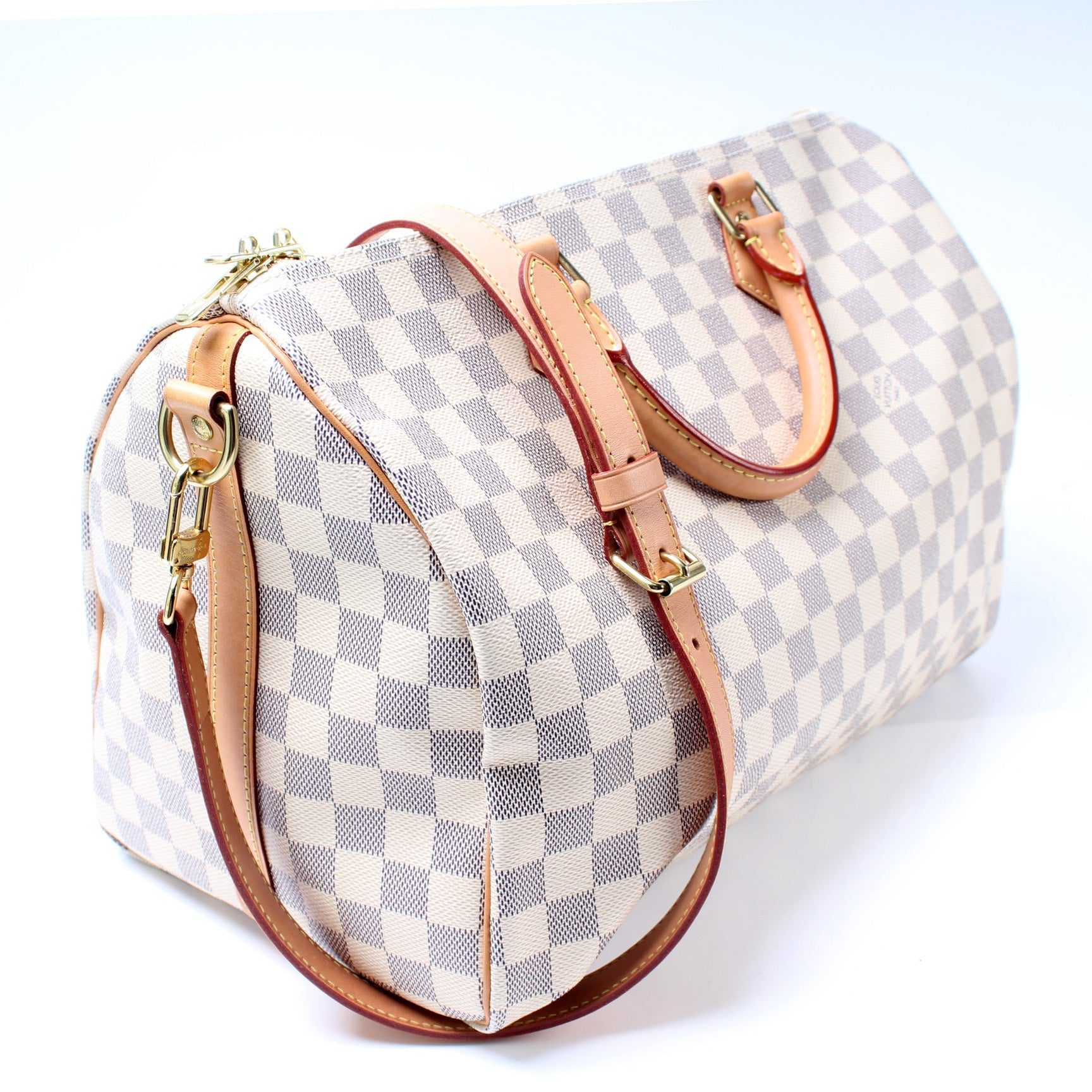 Louis Vuitton Speedy 35 W/Strap. The exterior is in the classic Louis Vuitton Damier Azur coated canvas.Â