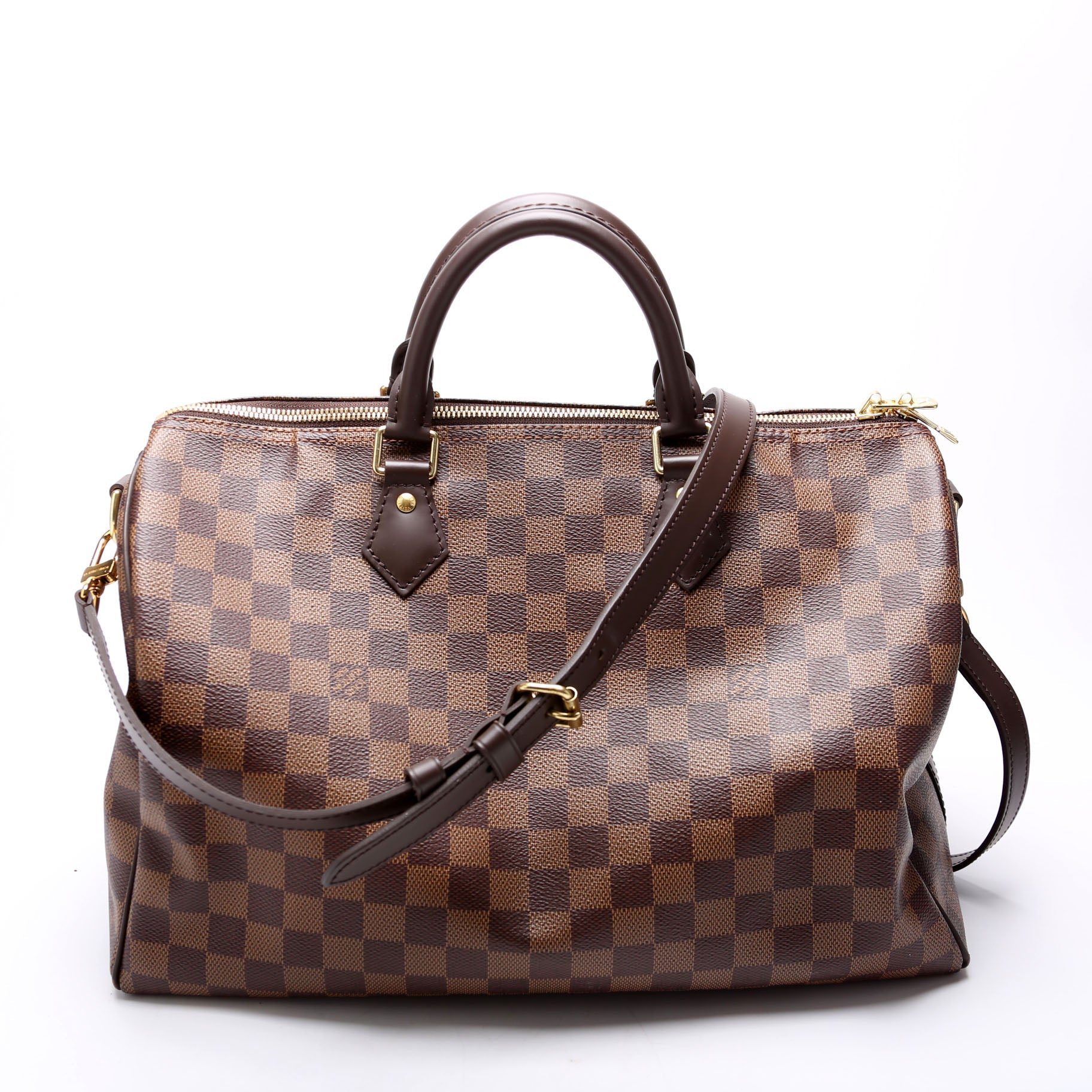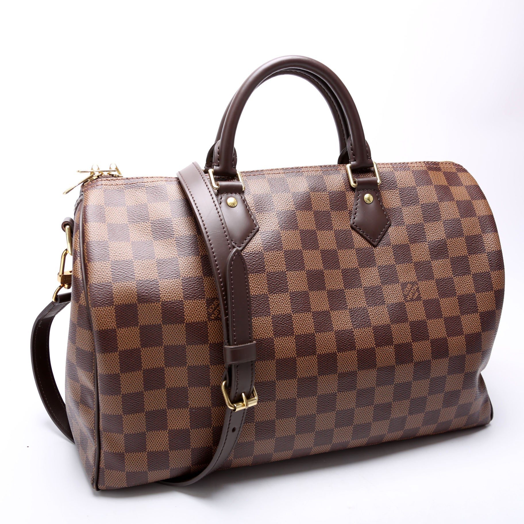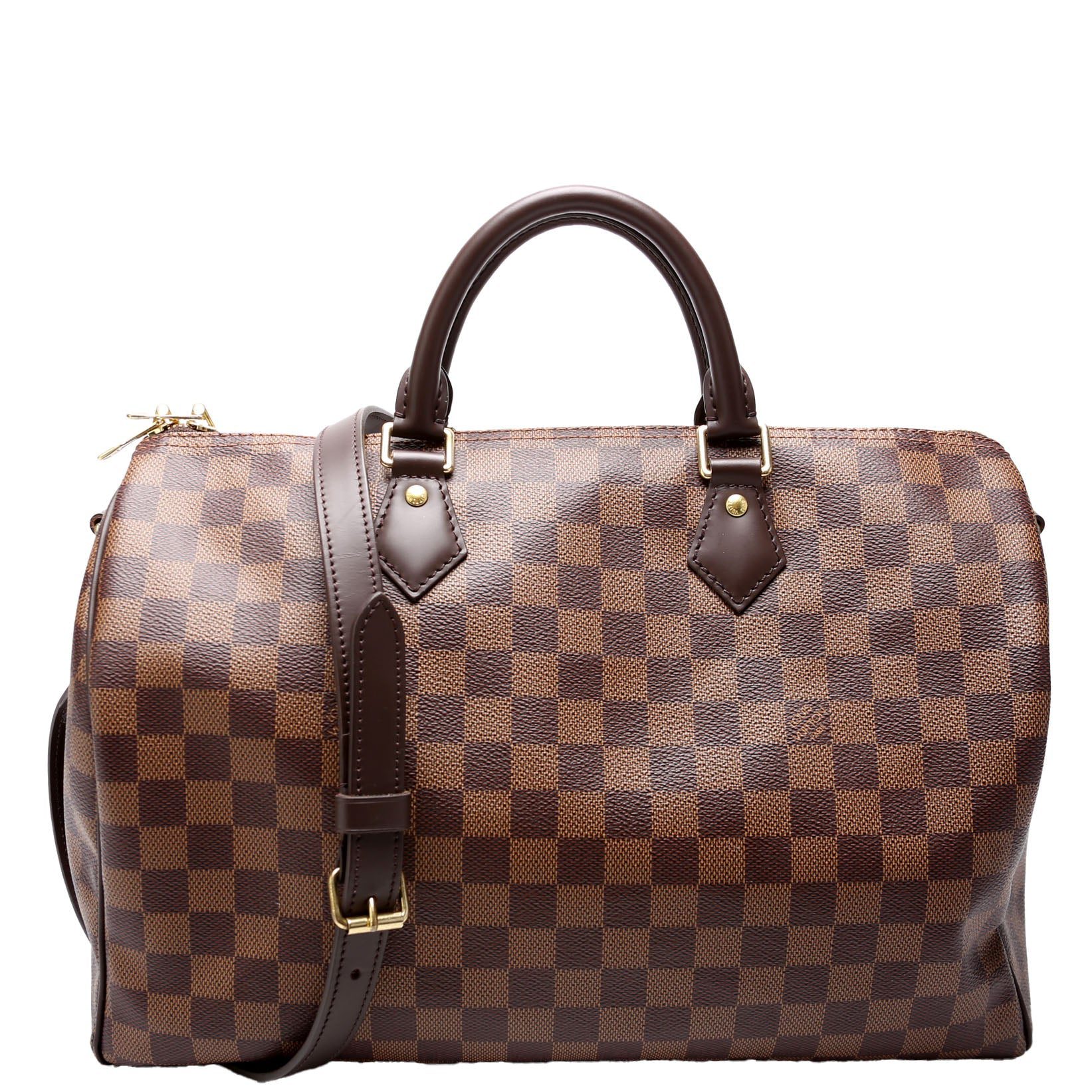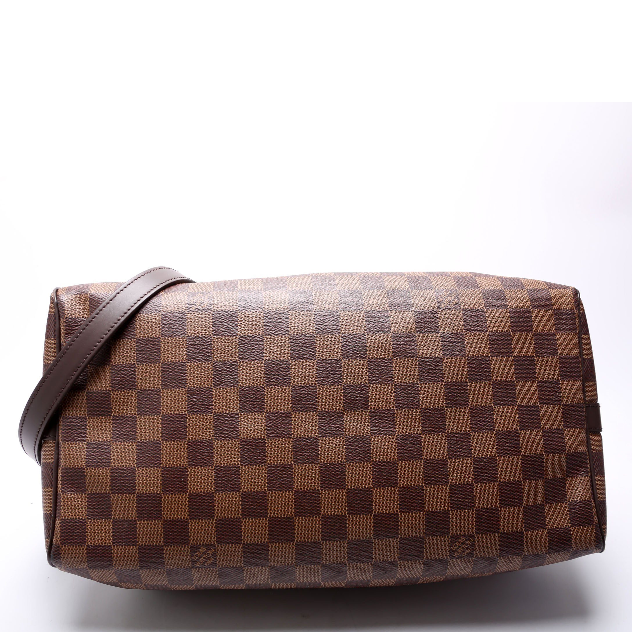 Louis Vuitton Speedy 35 Bandouliere . The exterior is in the classic Louis Vuitton Damier Ebene coated canvas. Â