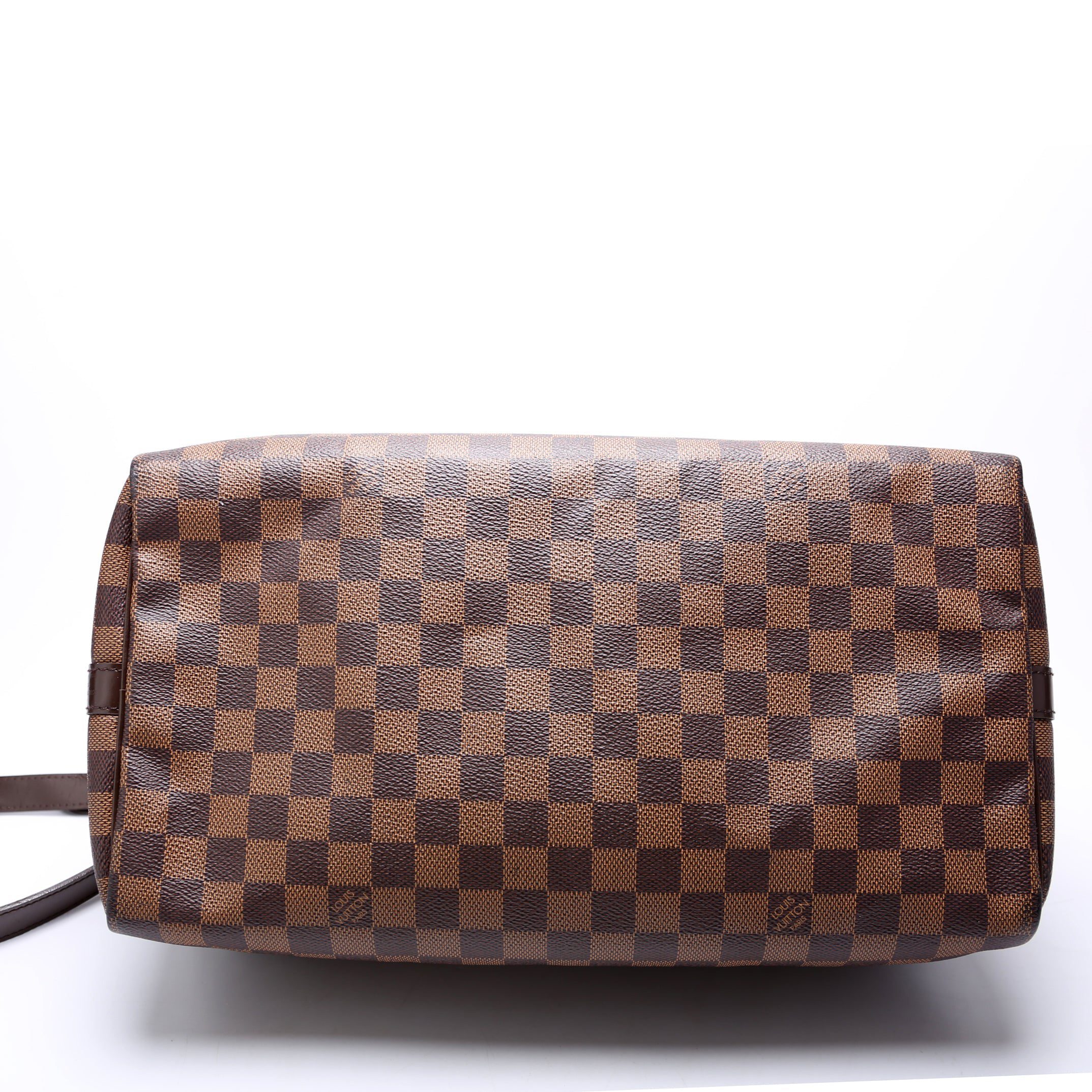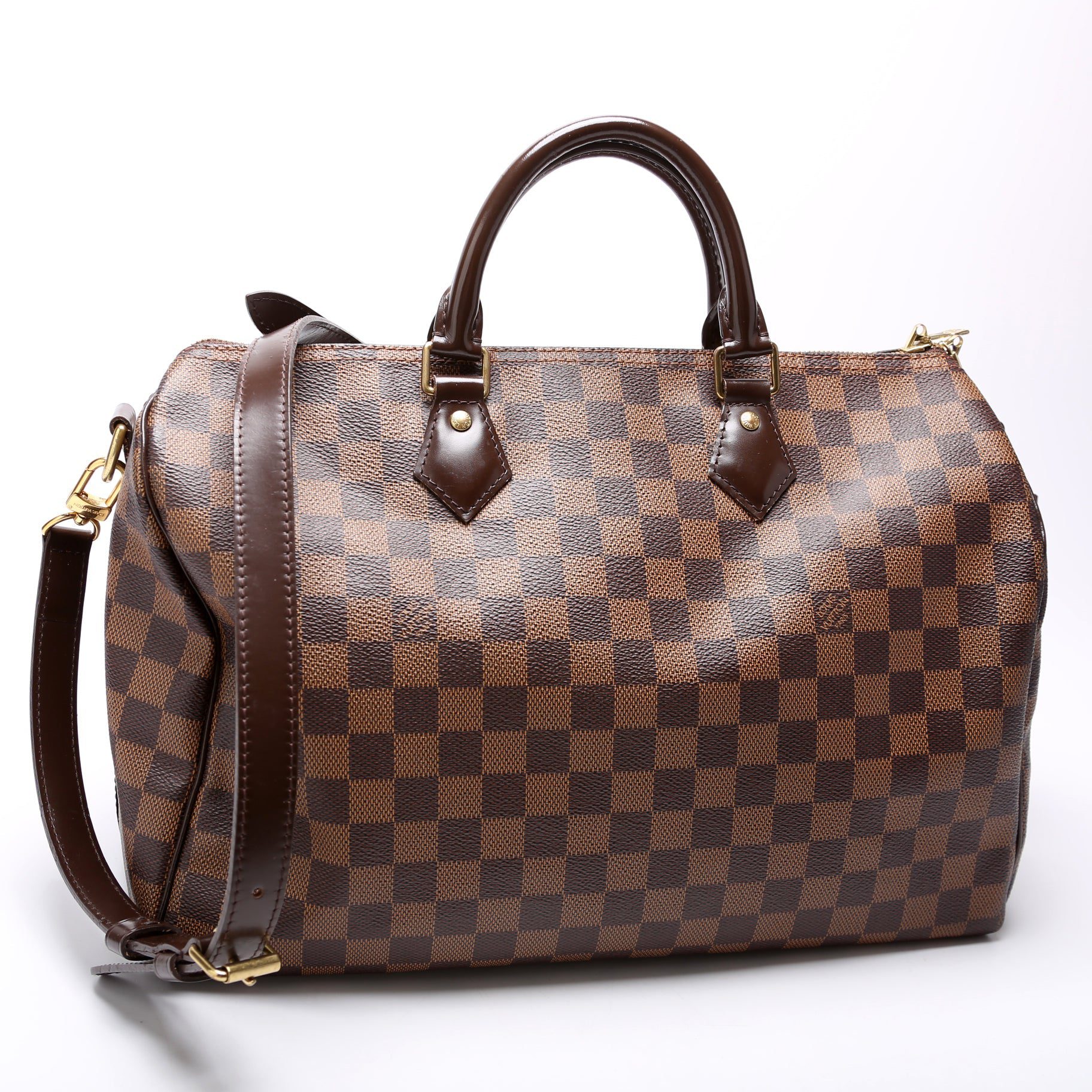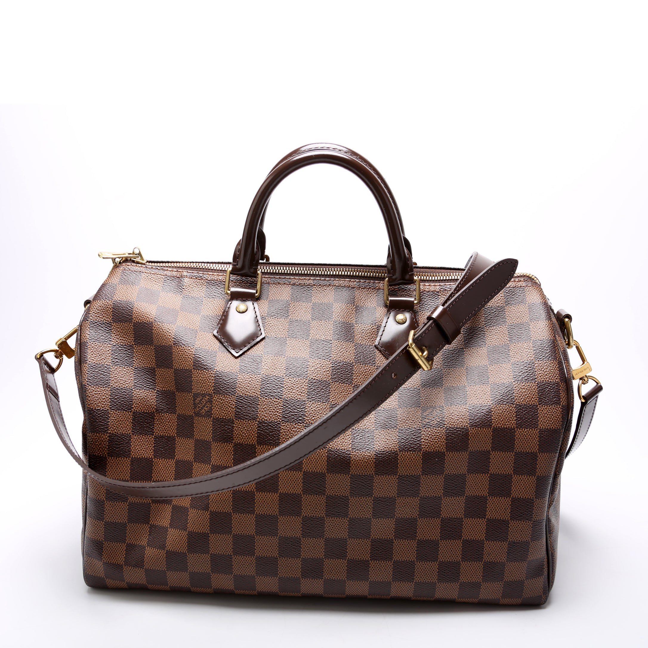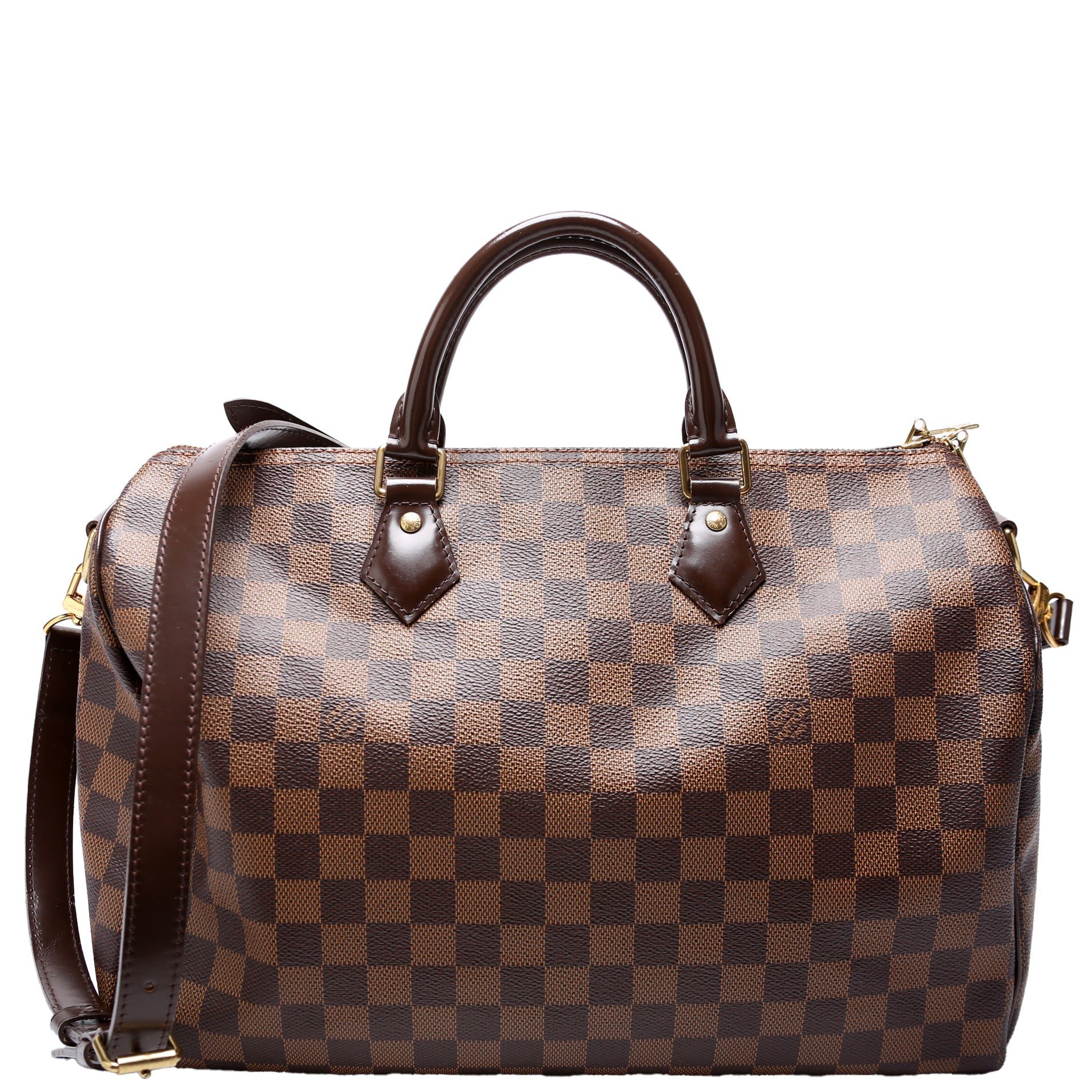 Louis Vuitton Speedy 35 Bandouliere . The exterior is in the classic Louis Vuitton Damier Ebene coated canvas.Â