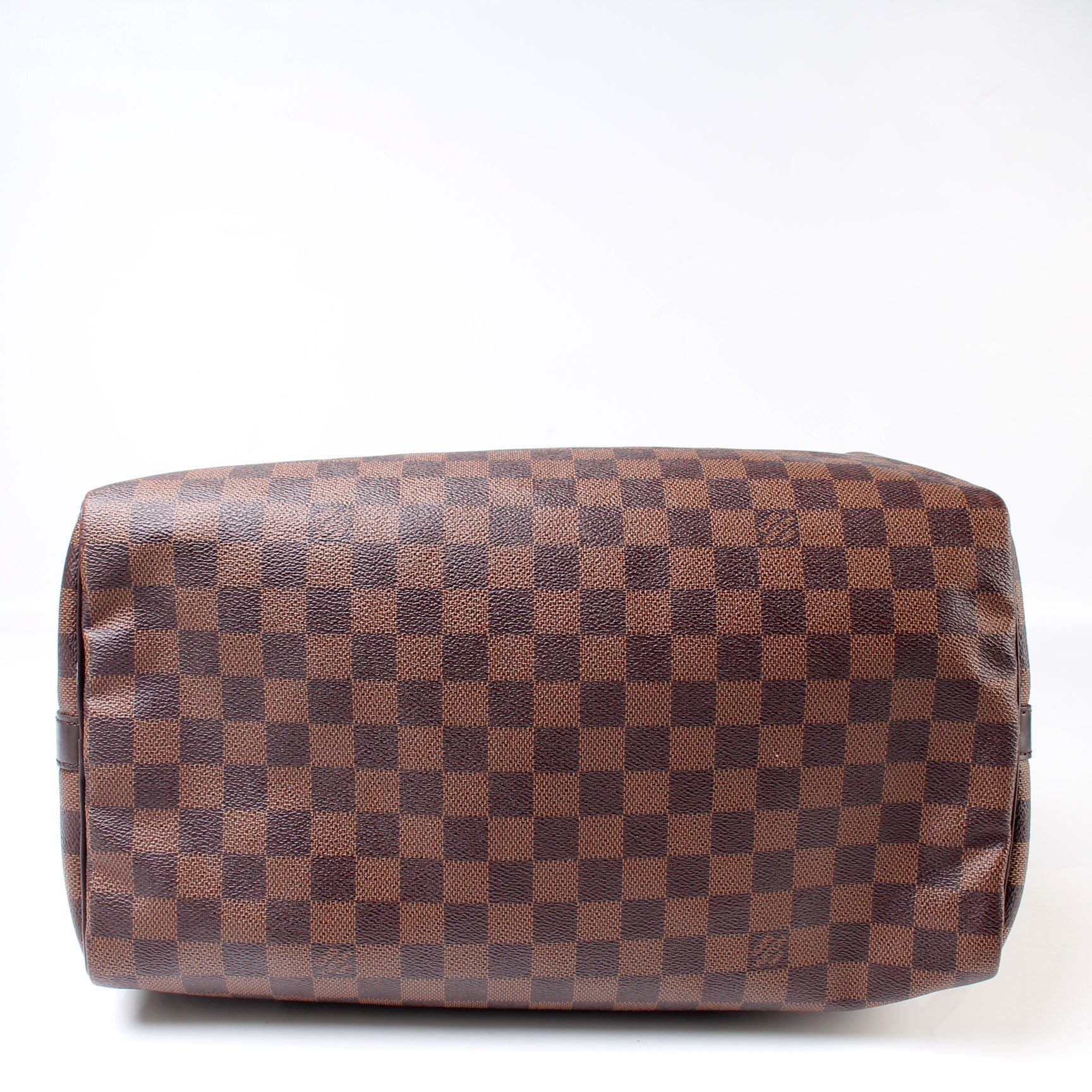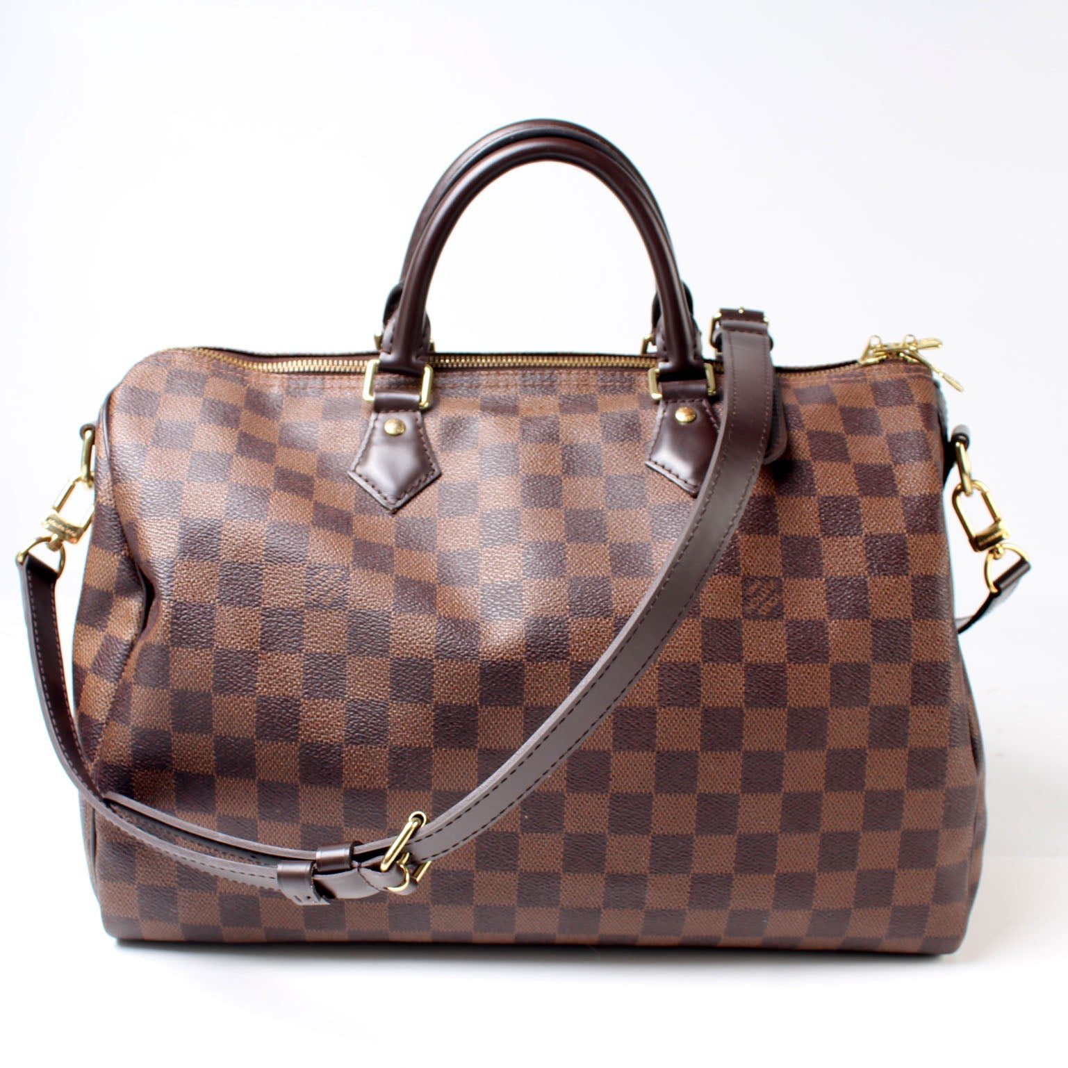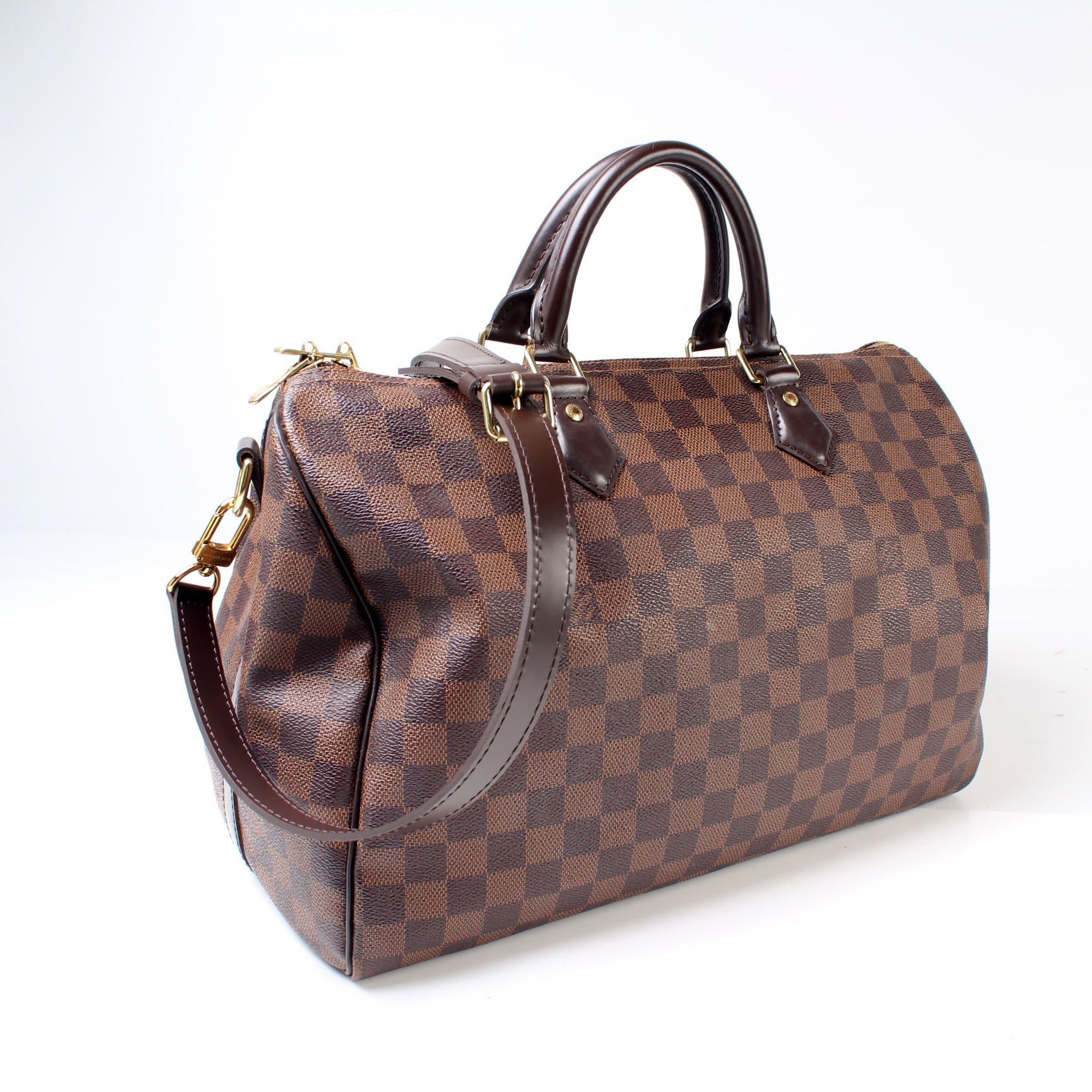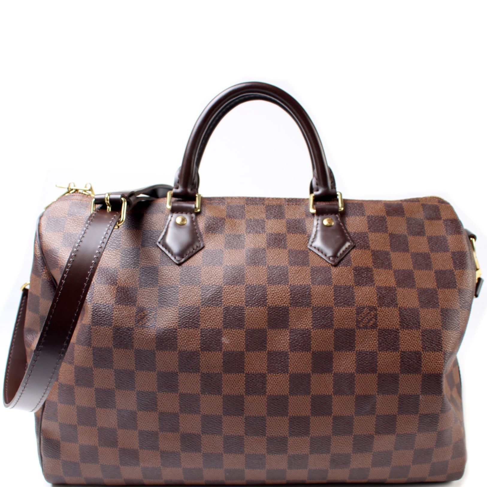 Louis Vuitton Speedy 35 Bandouliere. The exterior is in the classic Louis Vuitton Damier Ebene coated canvas.Â