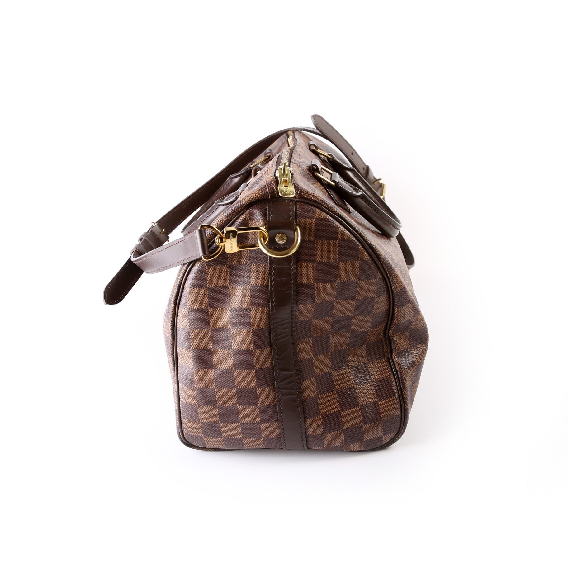 Louis Vuitton Speedy 30 Bandouliere. The exterior is in the classic Louis Vuitton Damier Ebene coated canvas.