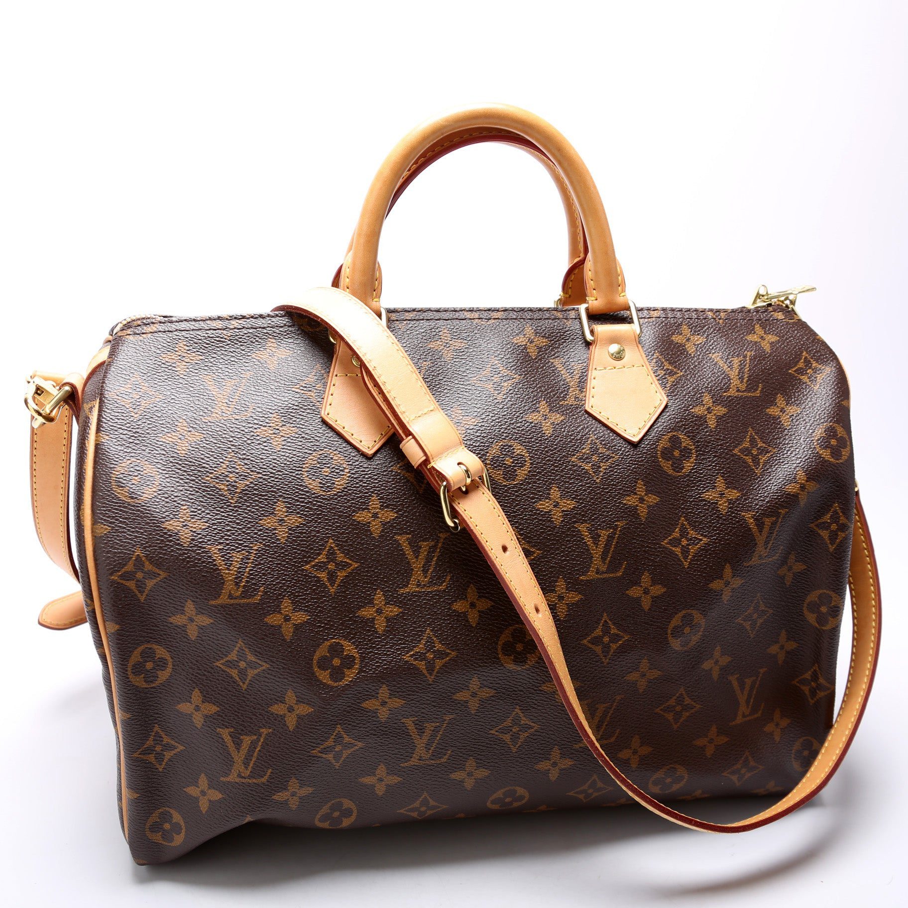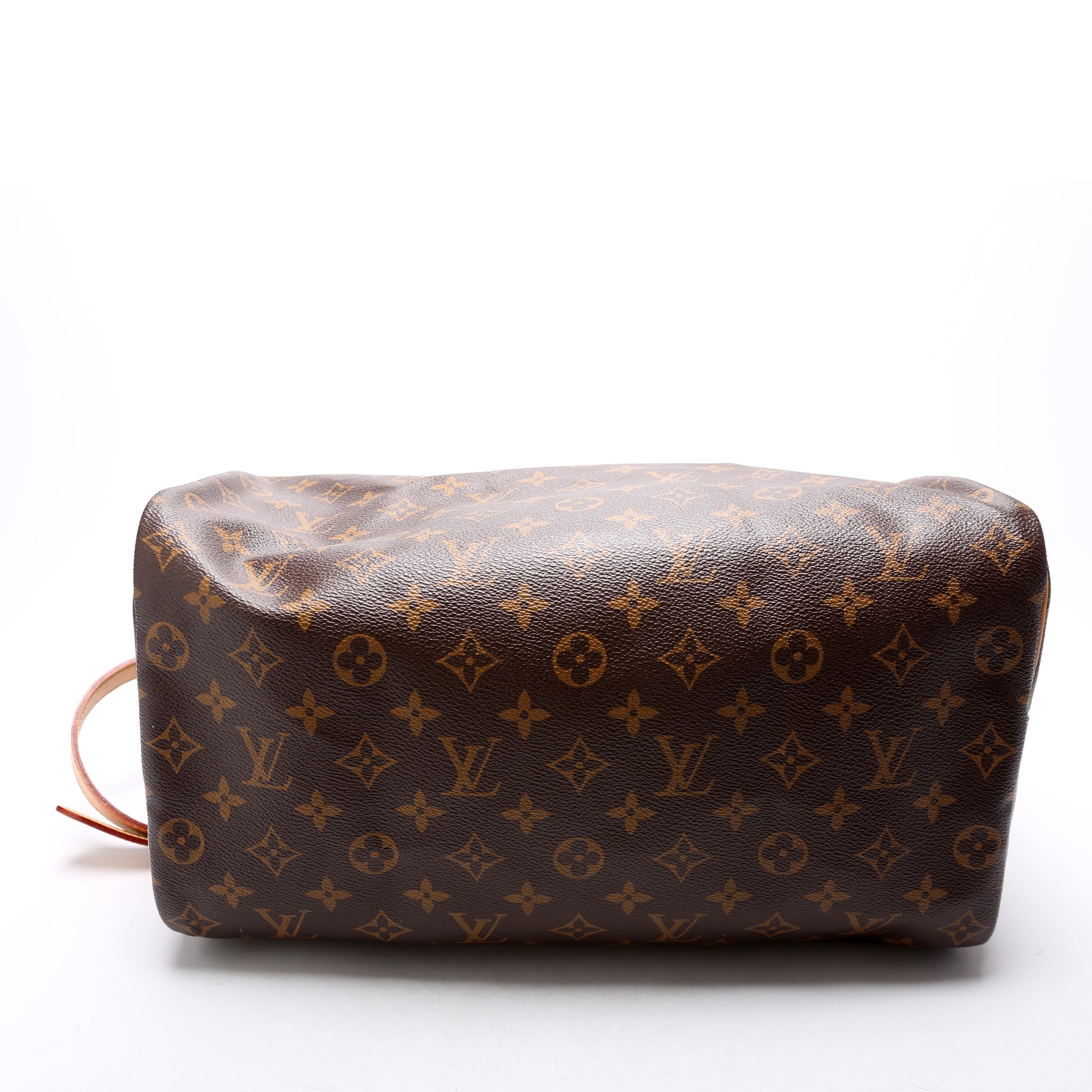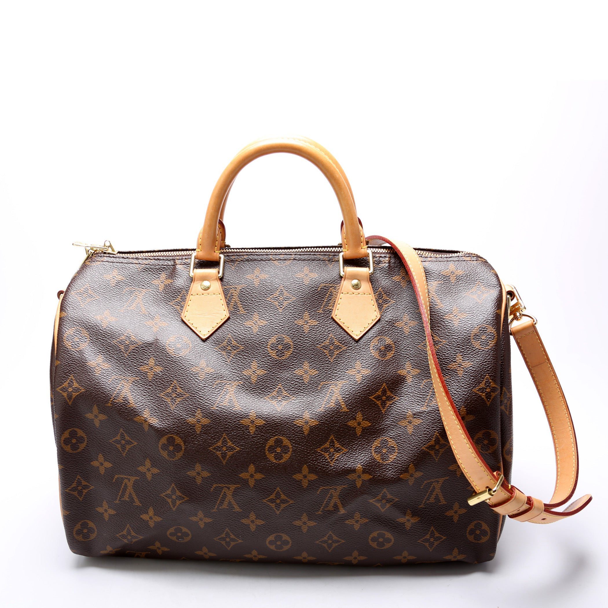 Louis Vuitton Speedy 35. The exterior is in the classic Louis Vuitton Monogram coated canvas.Â