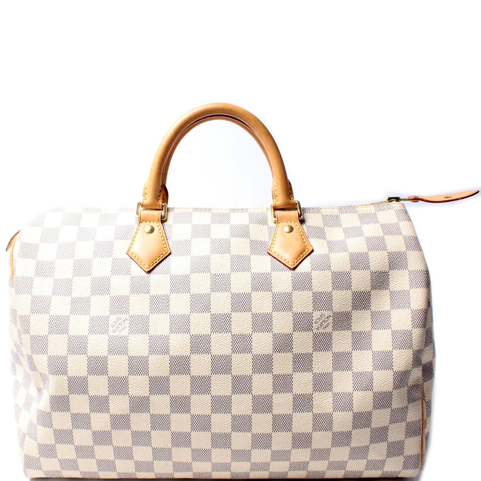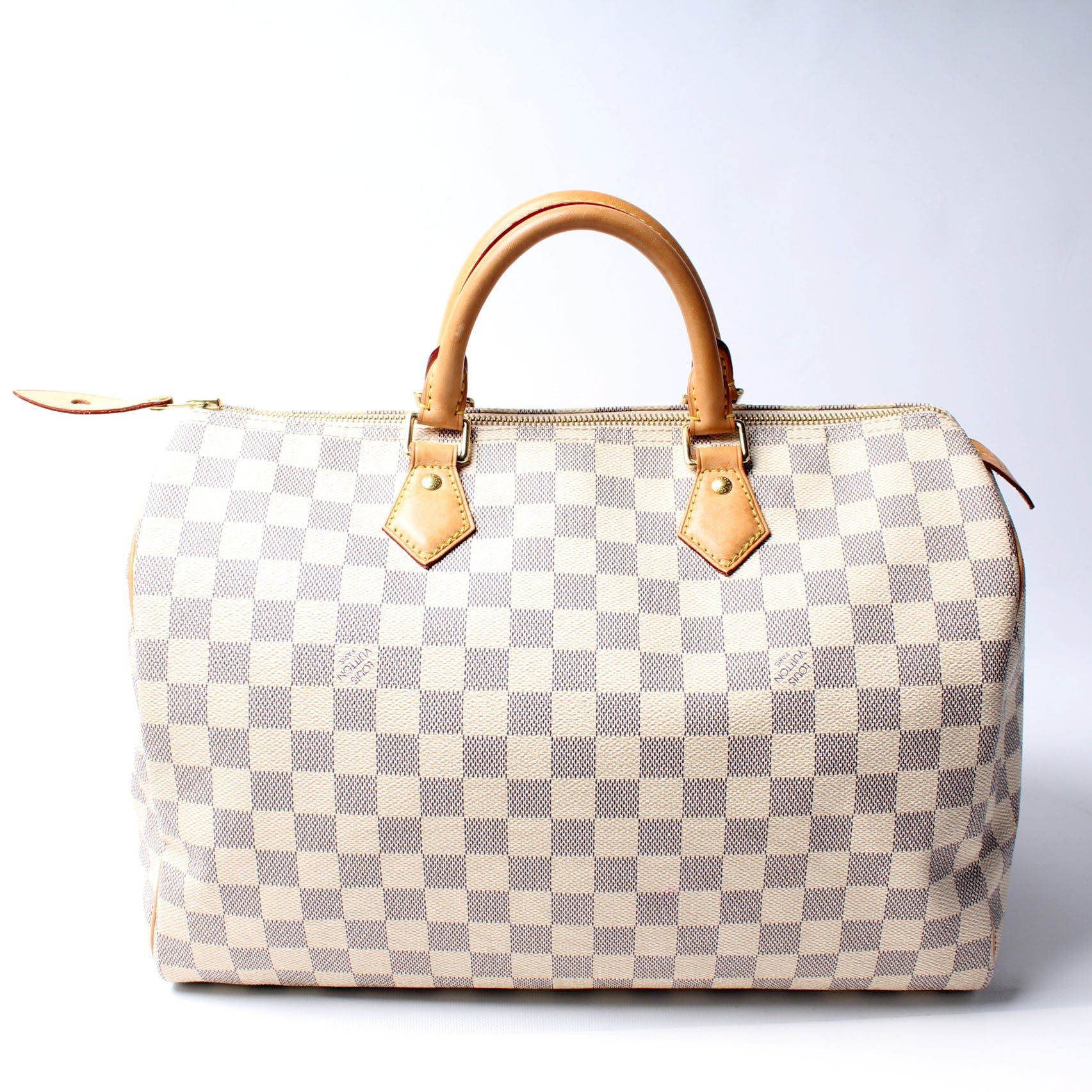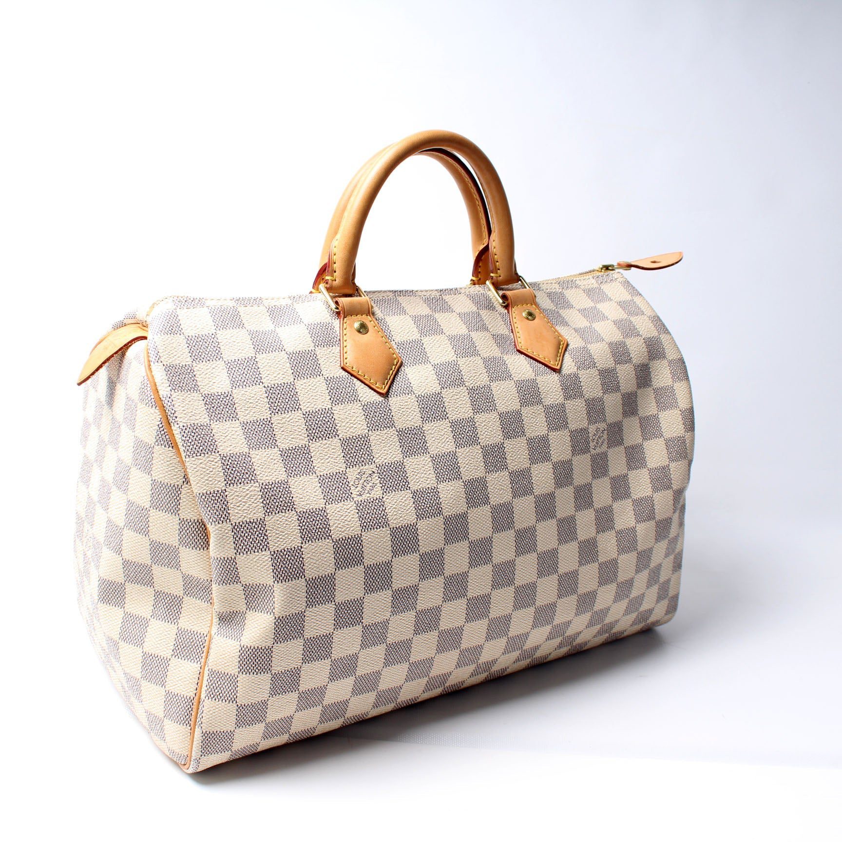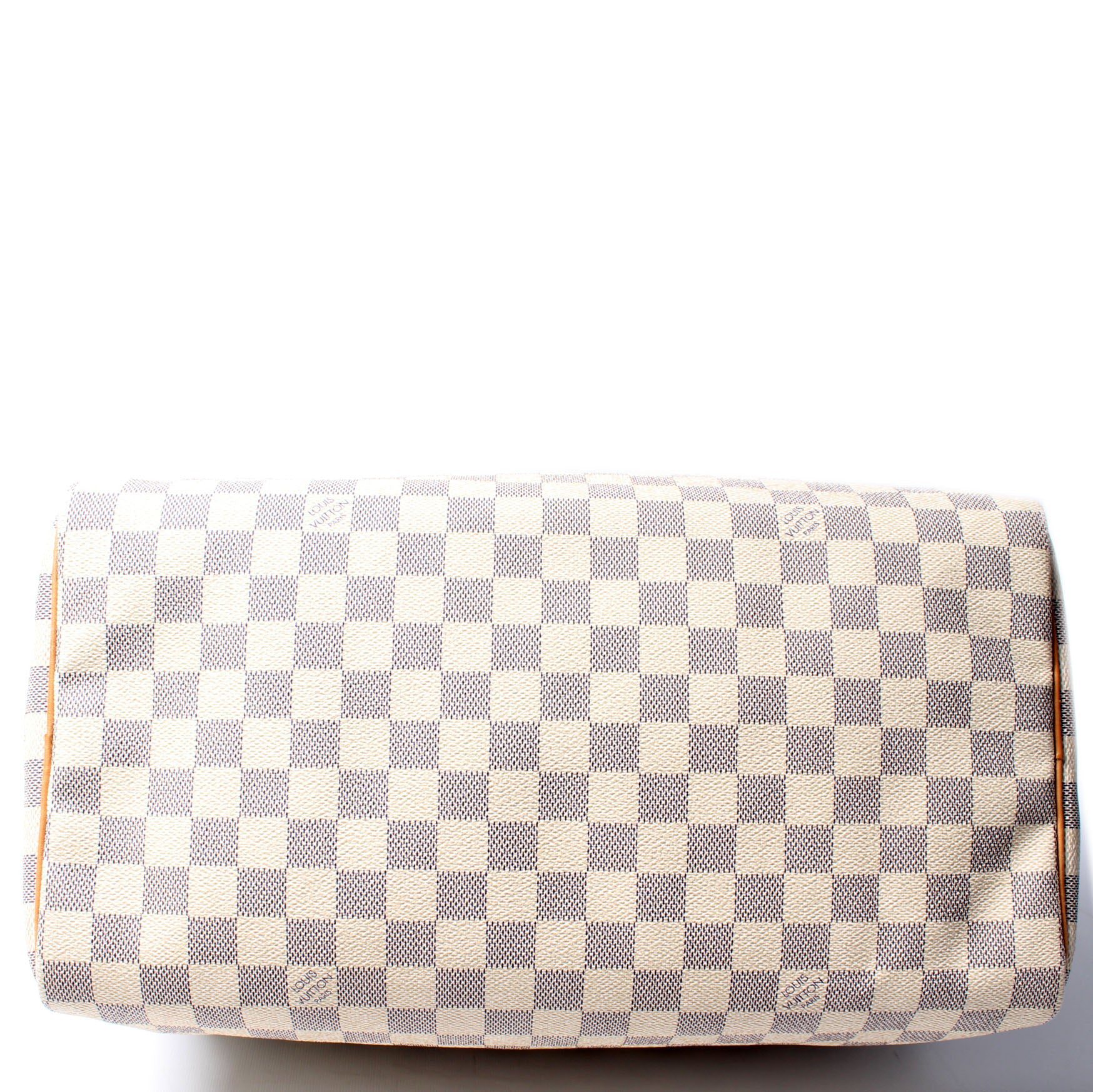 Louis Vuitton Speedy 35. The exterior is in the classic Louis Vuitton Damier Azur coated canvas.Â