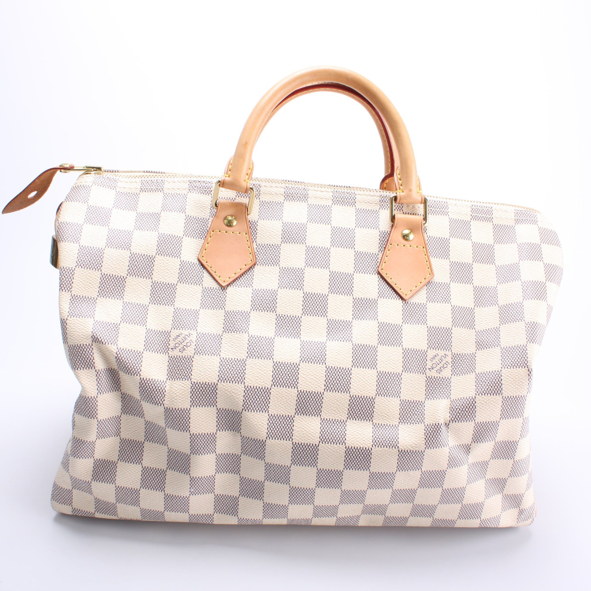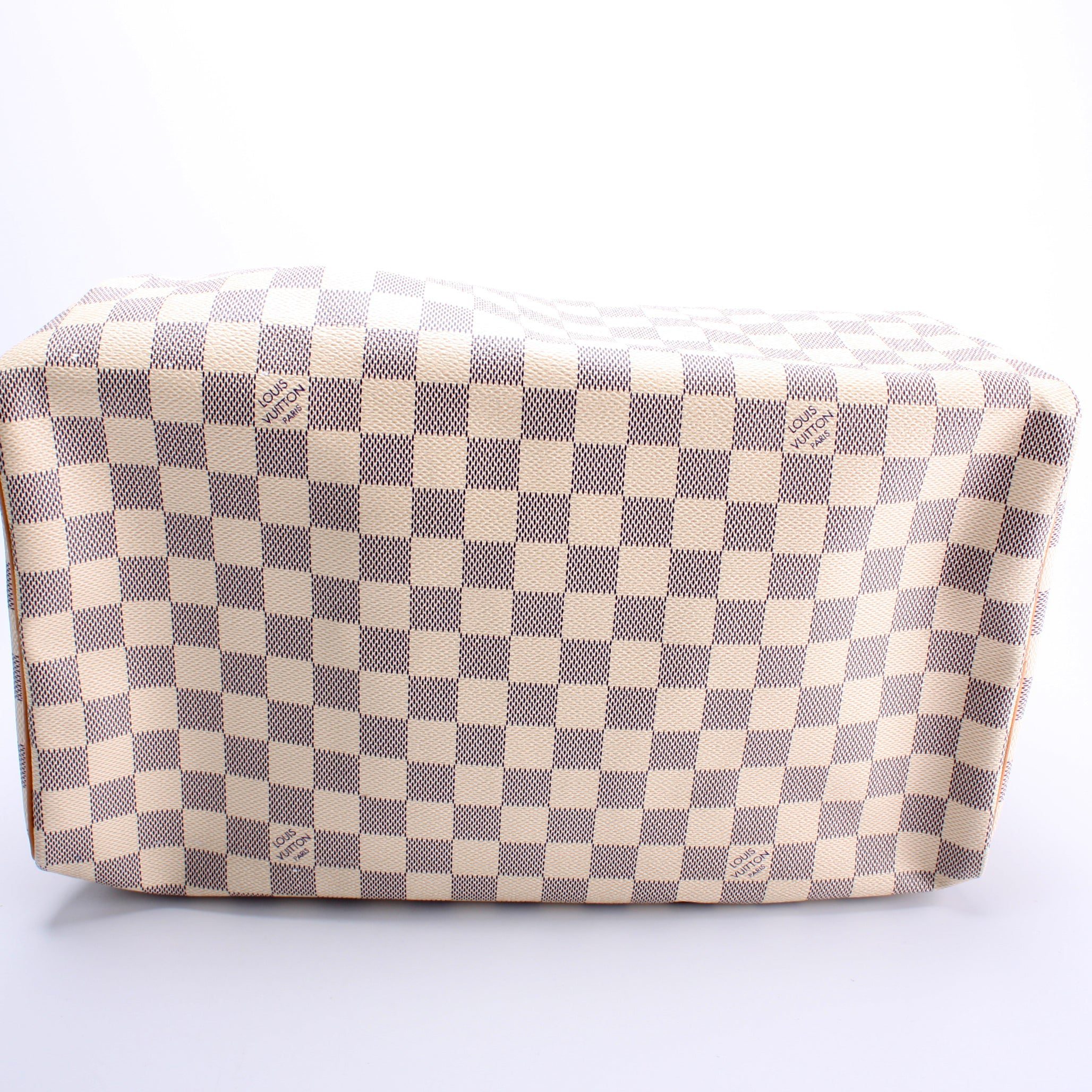 Louis Vuitton Speedy 35. The exterior is in the classic Louis Vuitton Damier Azur coated canvas.Â