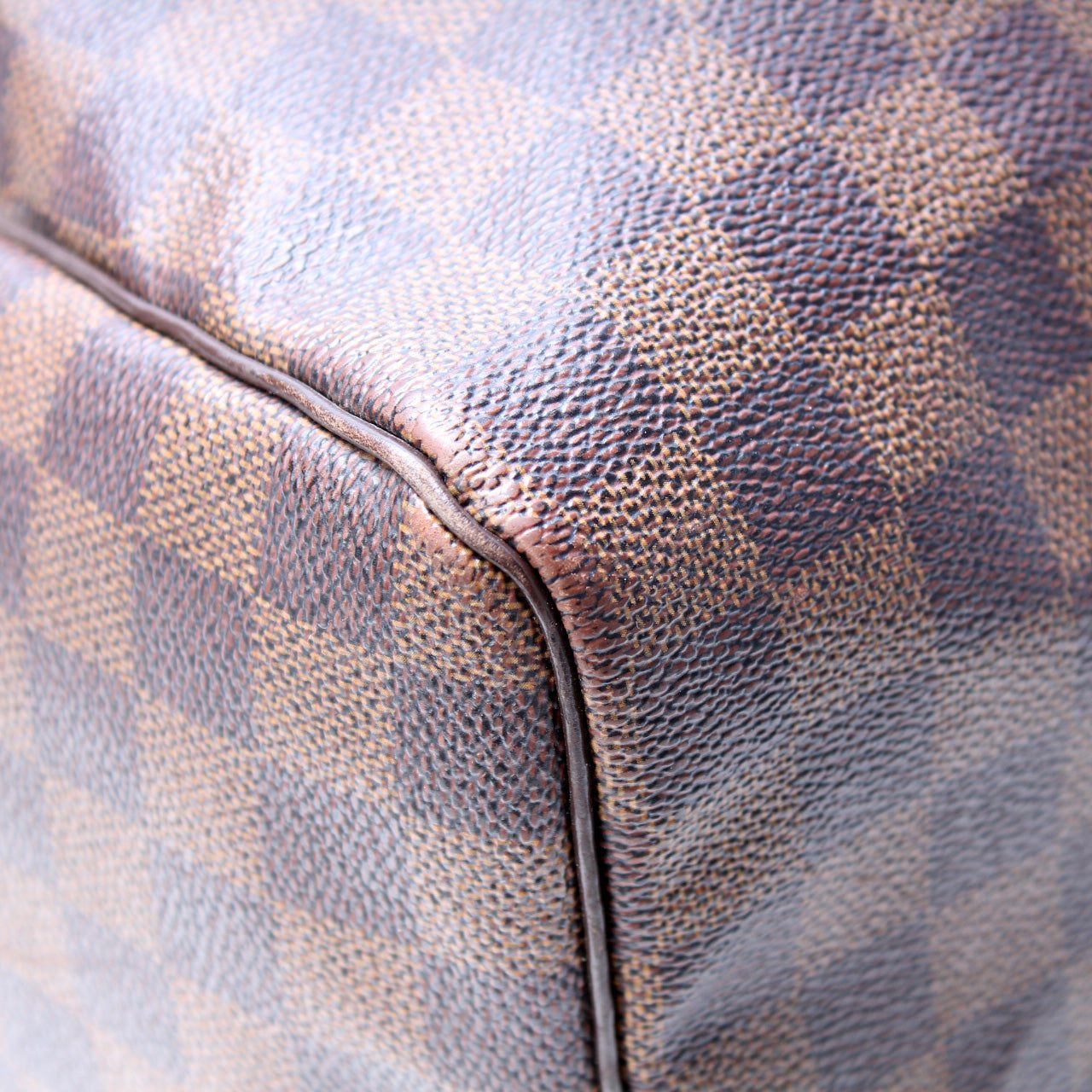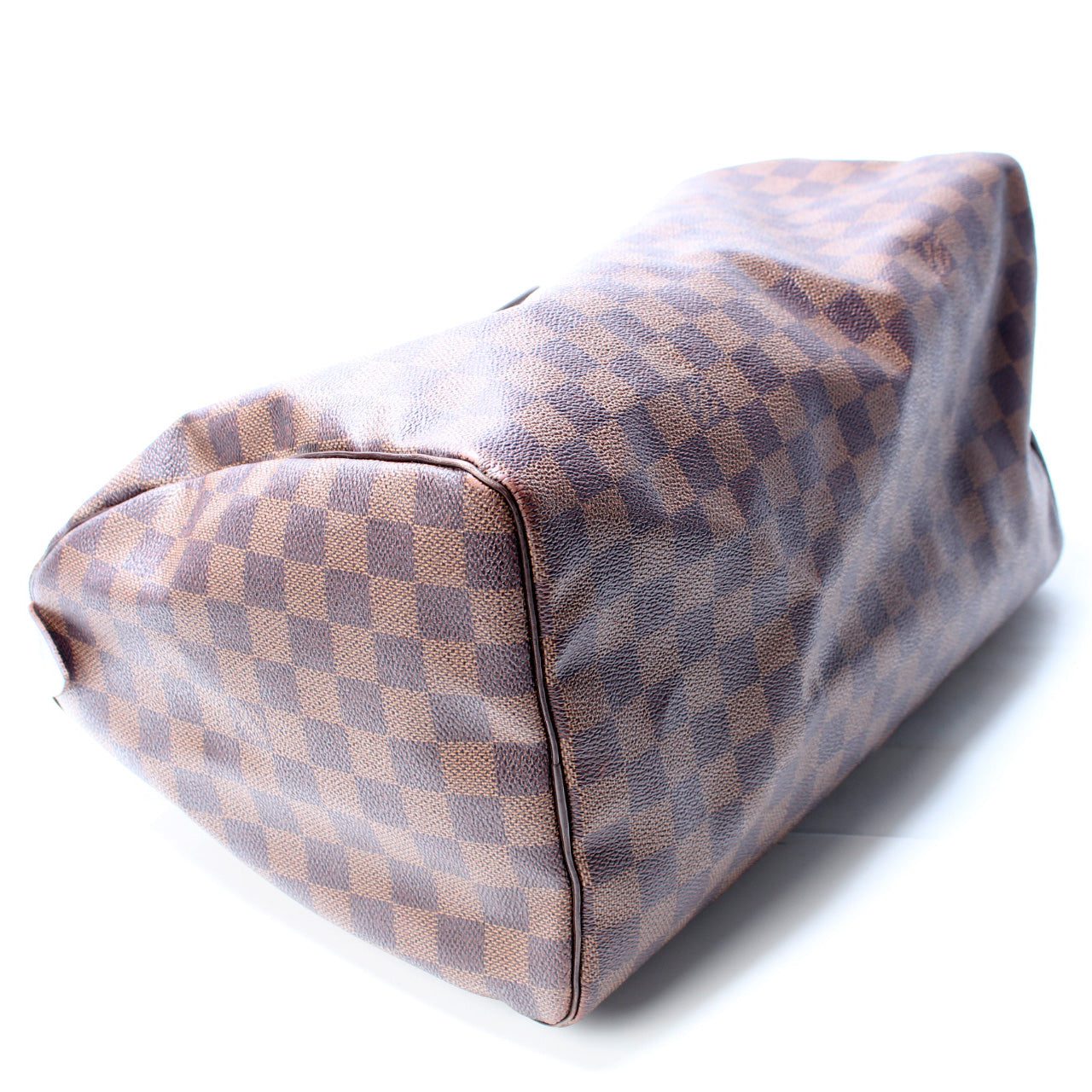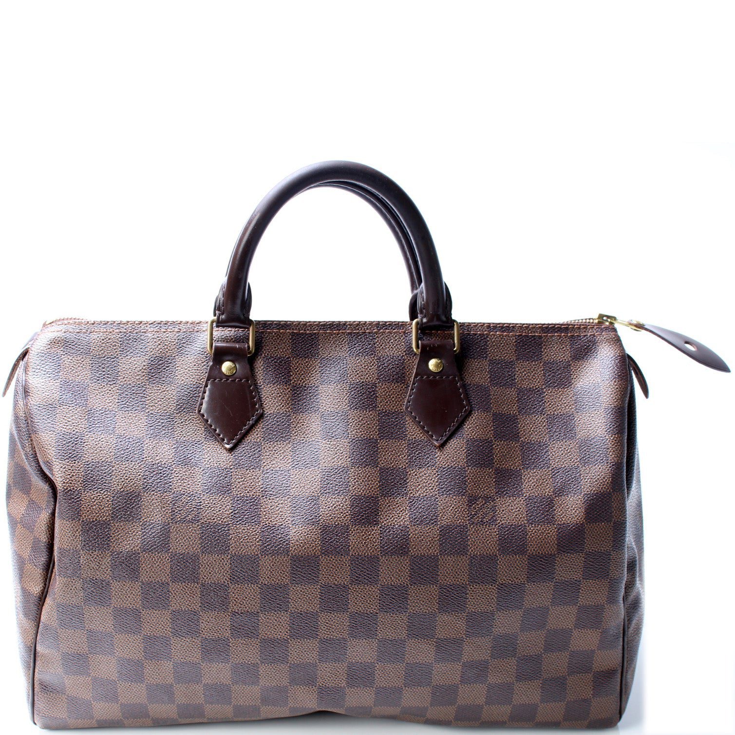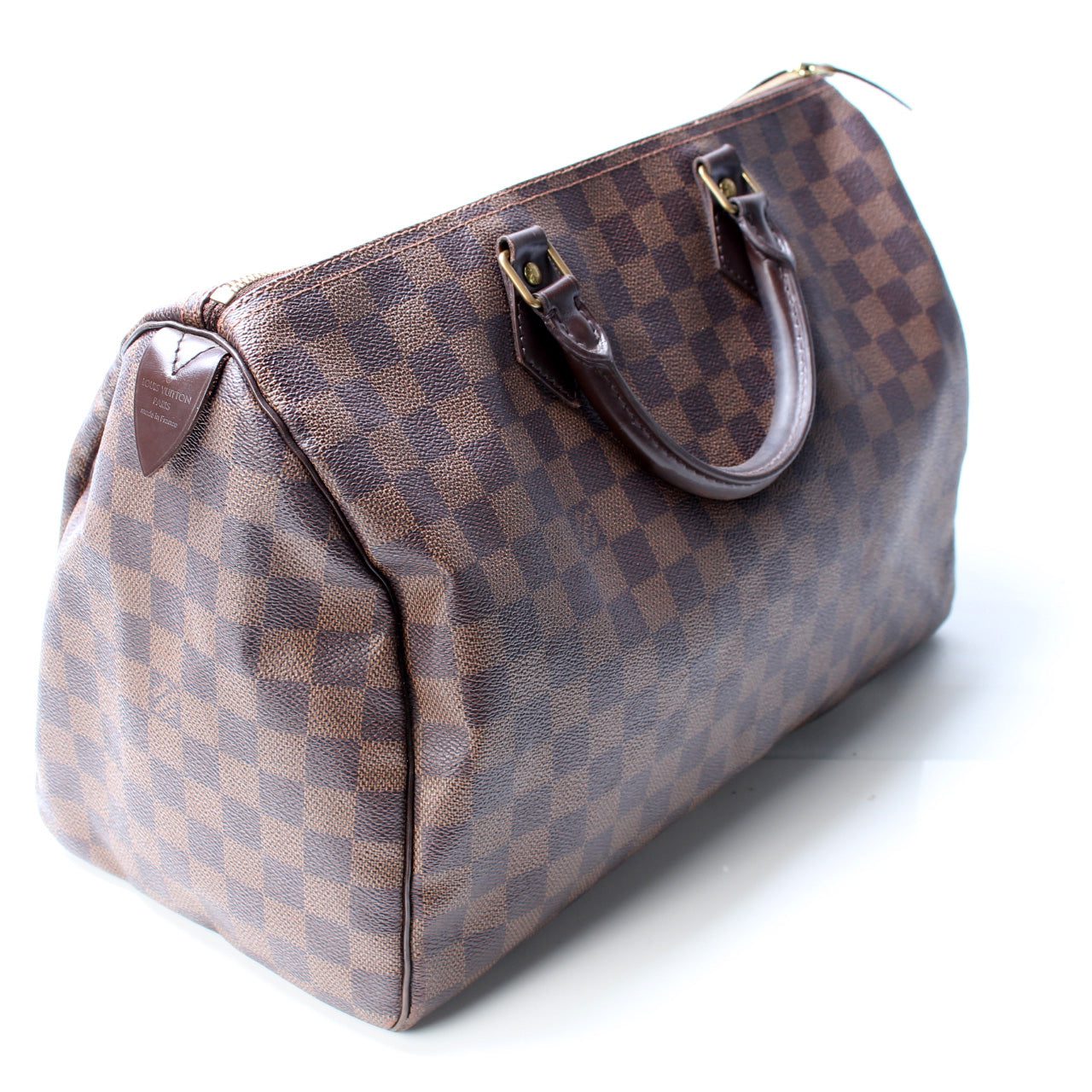 Louis Vuitton Speedy 35. The exterior is in the classic Louis Vuitton Damier Ebene coated canvas.Â